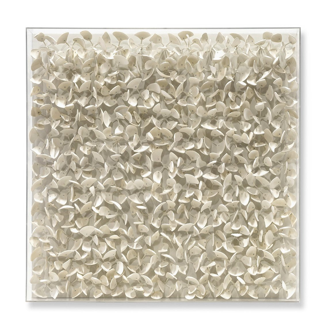 DescriptionHand-cut coco wood in petal forms in off-white finish with a clear acrylic and stainless steel frame. Wall decor comes with cleats for mounting.