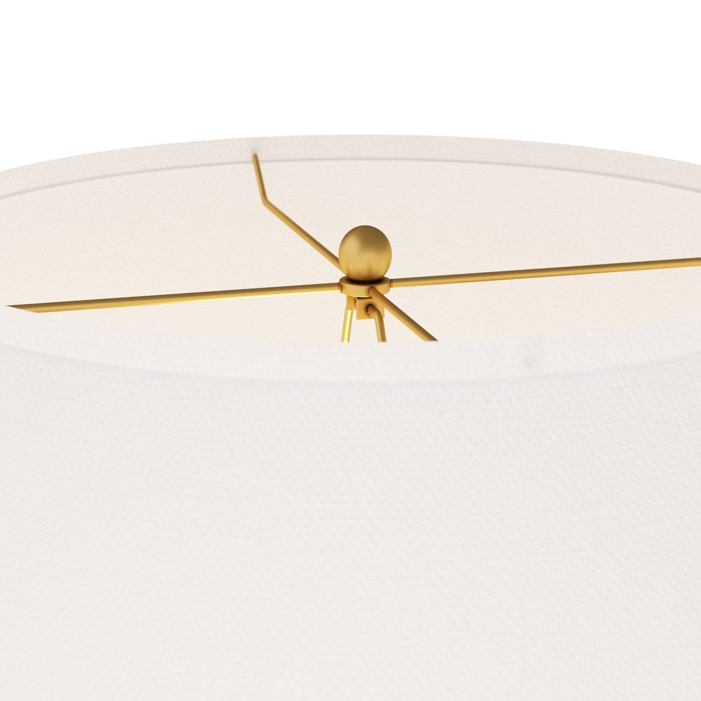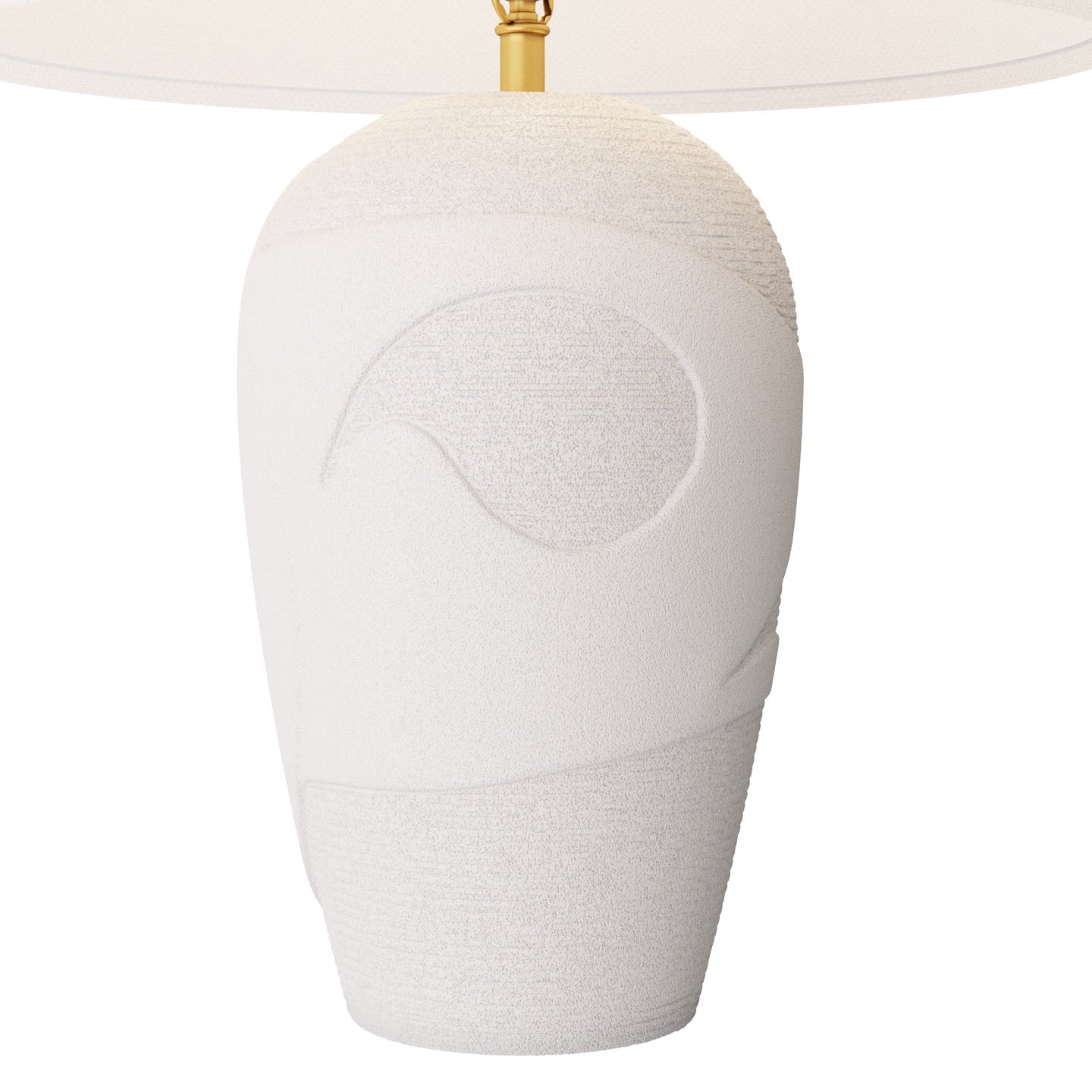 DescriptionThe monochromatic bas-relief pattern glazed in matte white is accentuated with a matching drum shade of off-white linen lined in cotton. Finished with antique brass hardware and a taupe cloth cord. Three-way rotary switch. Finish will vary