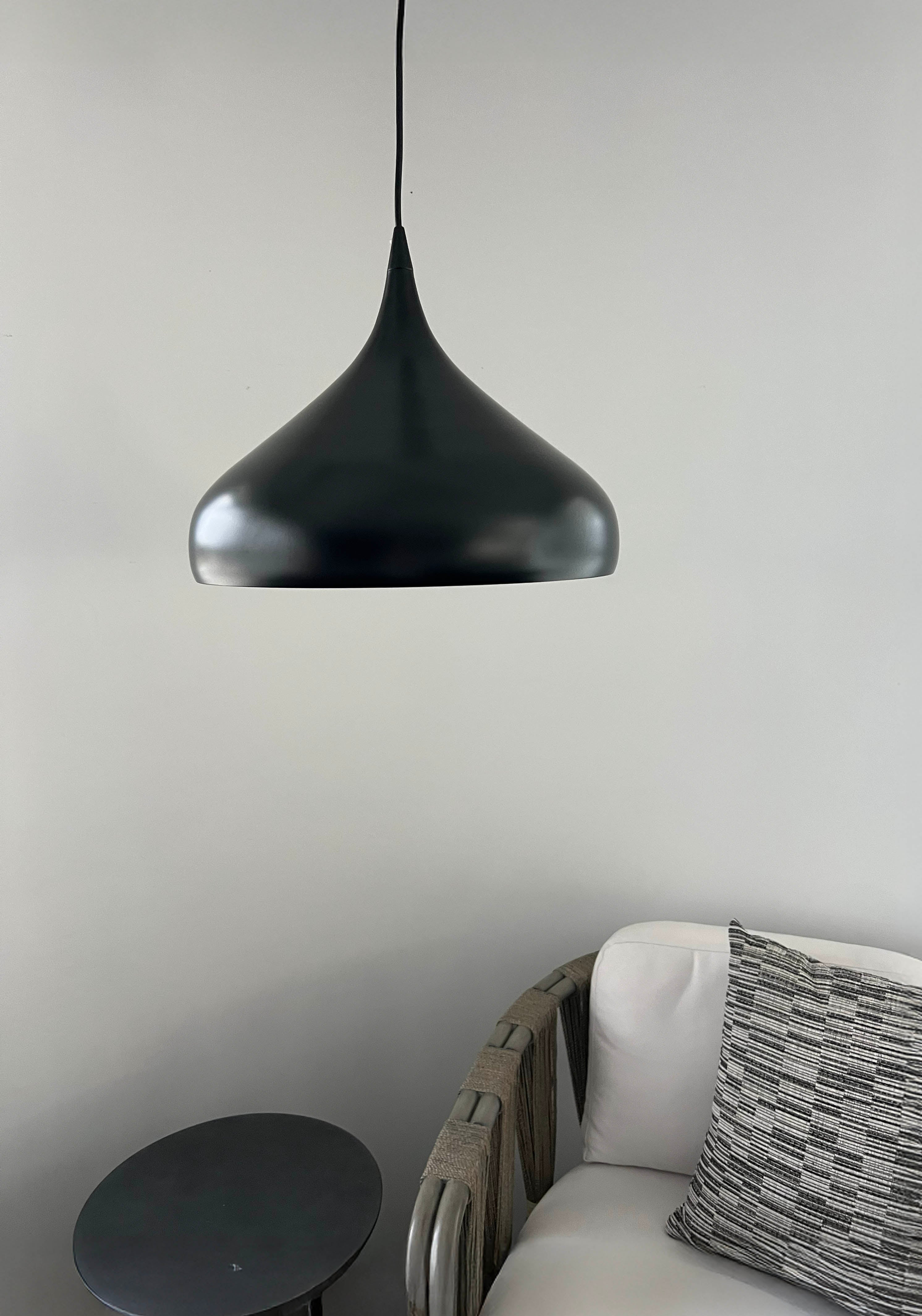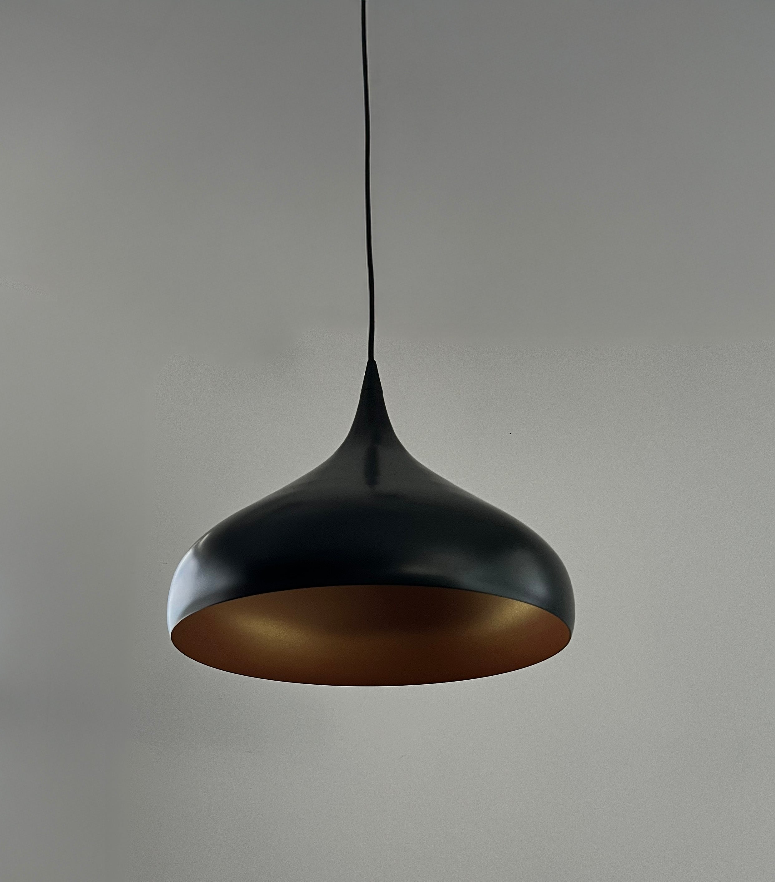 The Belgium Pendant is a sophisticated lighting fixture that marries modern design with timeless elegance. Its sleek black metal exterior contrasts beautifully with warm gold interior detailing, casting a refined glow that enhances any space.