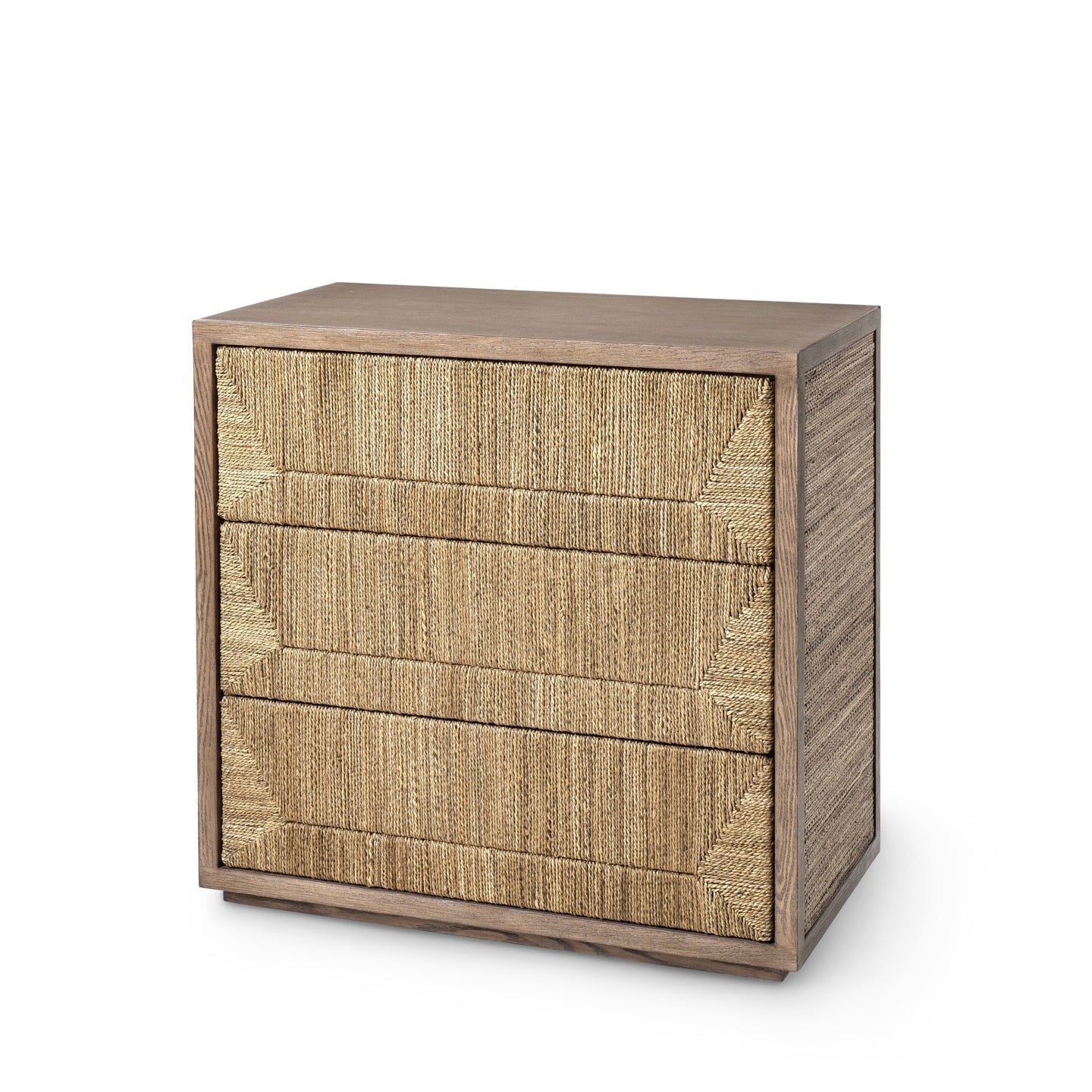 DescriptionCerused oak wood frame with hand-woven abaca rope on drawer fronts and outer sides all finished in a warm brown tone. Chest features three drawers all with a touch latch mechanism. Coordinates with the Braxton collection.
