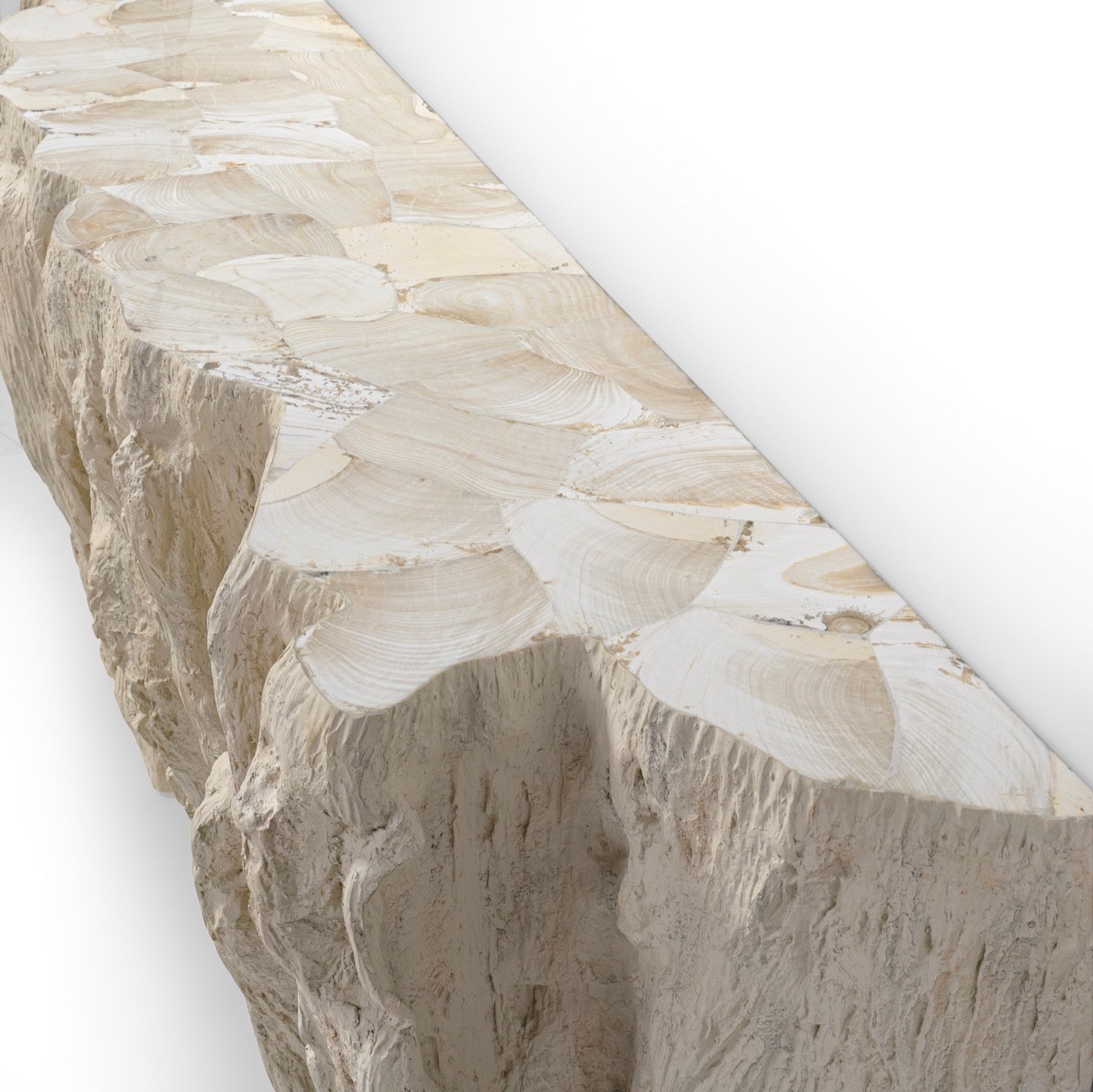 DescriptionInlaid fossilized clam shell top on stonecast base made from a natural tree trunk mold finished in warm cream tones. Clam is a natural material and may slightly vary in color and grain. Coordinates with the Camilla collection.