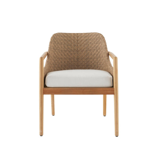 DescriptionThe chilton updates the sleek lines and open arms of a mid-century icon. An organic spin on the era’s design, the sculptural back of dark blonde synthetic rattan is cradled by a solid natural teak wood frame. A supportive cushion of our pearl outdoor performance boucle´ was designed to withstand the elements. Finish will vary