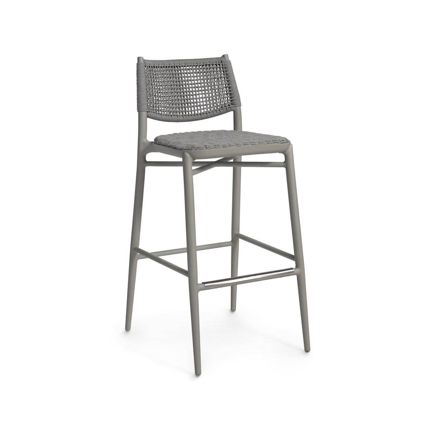 DescriptionHand-woven all weather synthetic weave in a pebble-grey finish on the seat and backrest over a powder coated aluminum frame and legs in a matte-grey finish. Weave is resistant to cracking, peeling, fading and breaking. Stool is available only as shown.