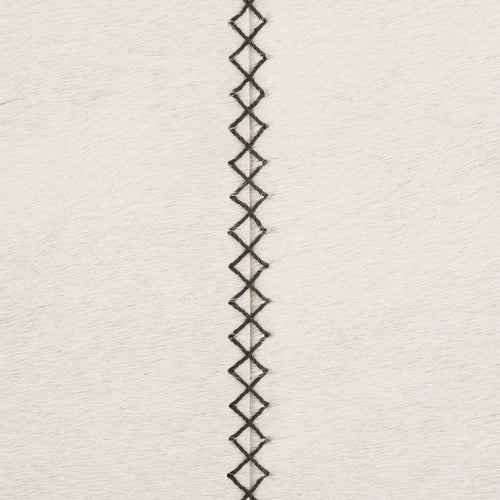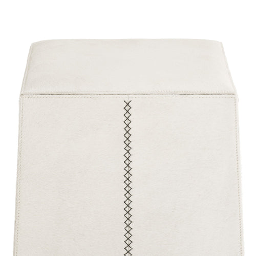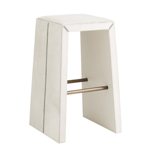 DescriptionCrafted of white hair-on-hide, this backless bar stool is a tactile delight. A mitered whipstitch creates a racing stripe down the center of each side, while slim antique brass bridges add contrast and support to this minimal design. Hide will vary.