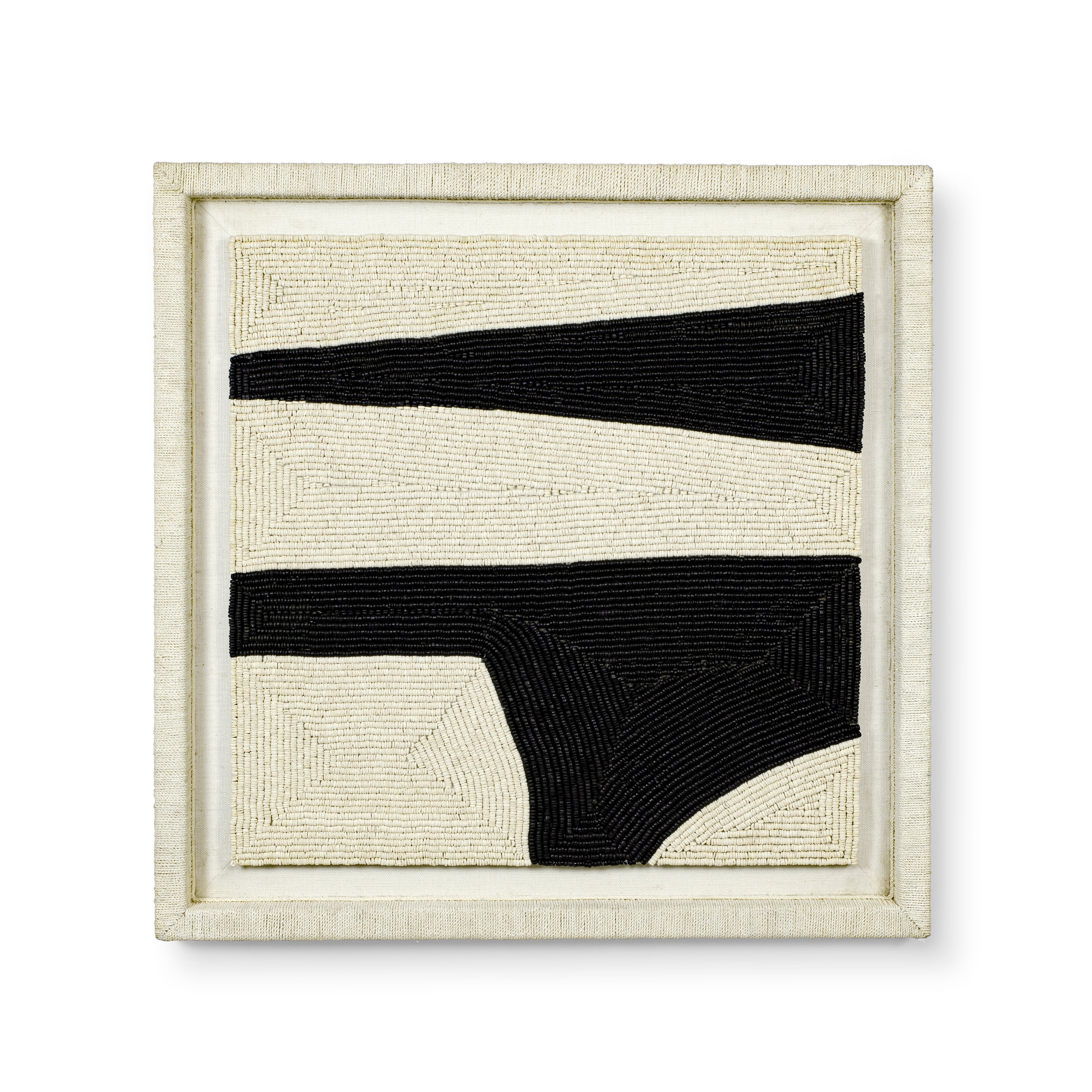 Wall decor features fully beaded hand-dyed black and white coconut shell beads woven together and intricately placed in this unique floating design accented with a fully wrapped abaca rope hardwood frame. Wall decor comes with wood hangers for mounting both vertically and horizontally.