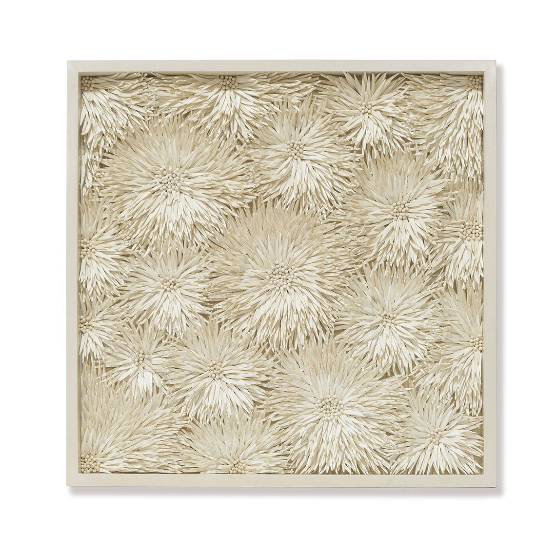 DescriptionHand-cut coconut shells arranged in flower-shaped formations with a hardwood frame all in a cream finish. Wall decor comes with metal hangers for mounting.