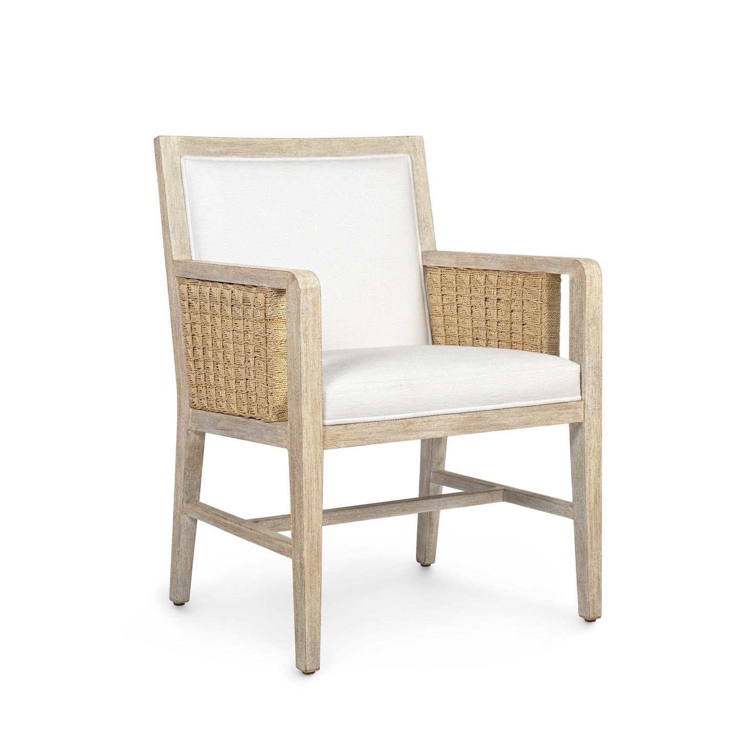 DescriptionHardwood frame with a cerused light whitewash finish featuring natural hand-twisted abaca rope on outside back and arms woven into a unique design. Chair comes with a fixed upholstered seat and inside back. Coordinates with the Fairwater collection.