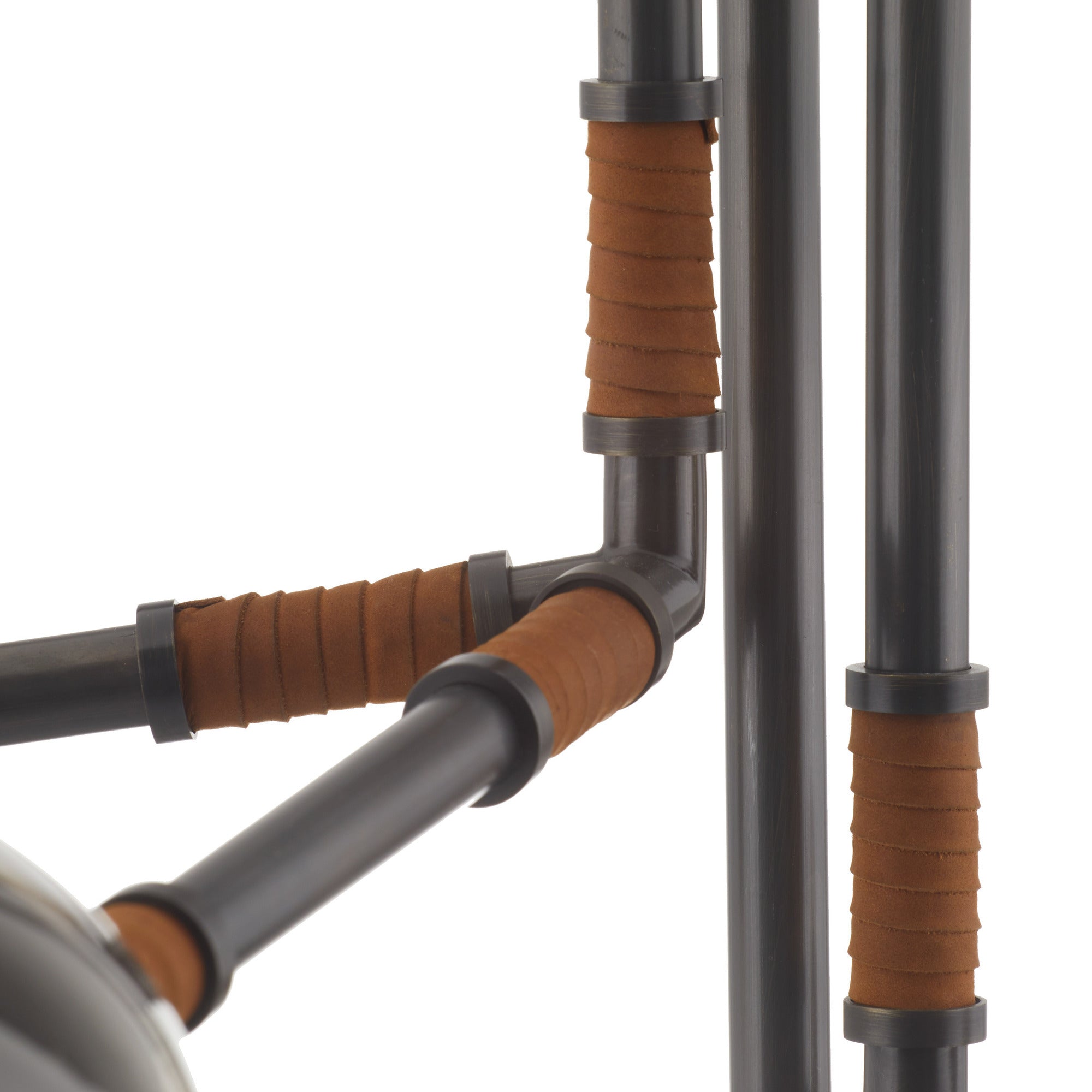 DescriptionOur industrial-inspired style of English bronze-plated iron is accented with wrapped cognac leather for a tactile finish. Mounted on a slim iron pipe, each fixed branch is punctuated with a smoke glass globe, dispersing light in different directions to fully illuminate a space. Damp-rated, although limited covered outdoor areas may affect finish. Finish will vary.