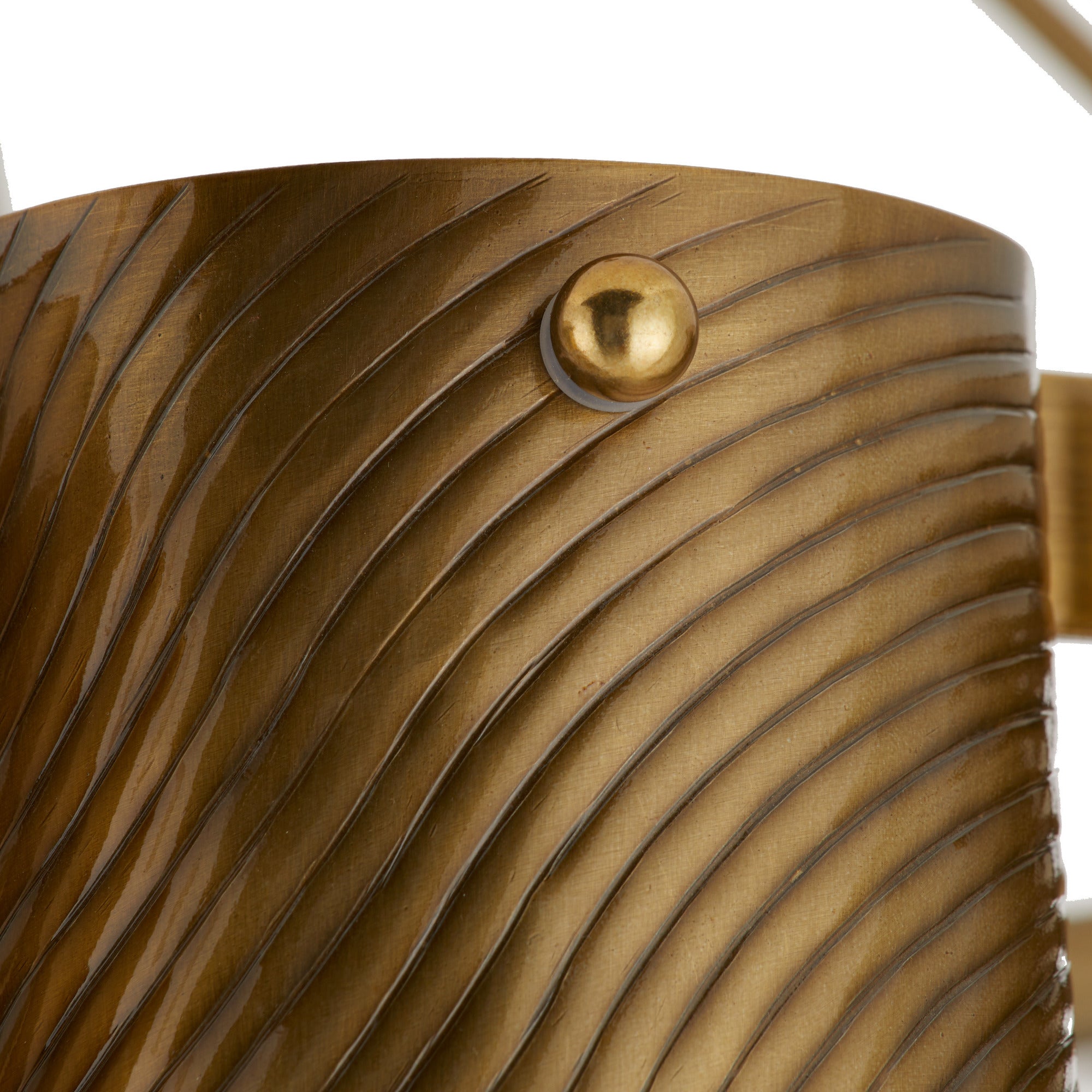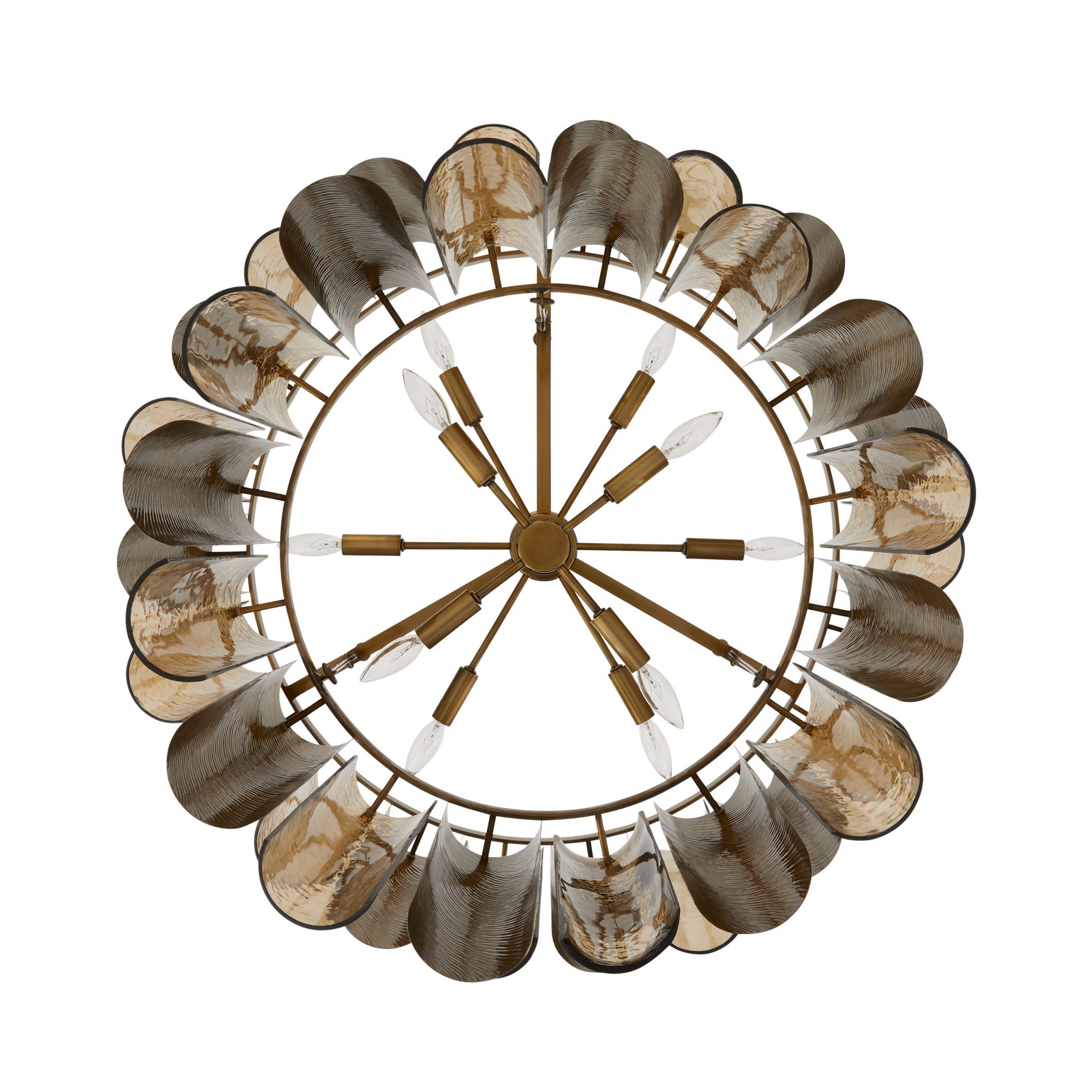 DescriptionScaled for high ceilings, this impactful fixture adds a reflective glamour wherever it is placed. The Empire silhouette alternates faux bois-etched leaves of vintage brass-plated iron with smoke slump hammered glass for a striped effect. The two-tiered form is suspended from a brass-plated pipe and canopy. Damp-rated, although limited covered outdoor areas may affect finish. Finish will vary.