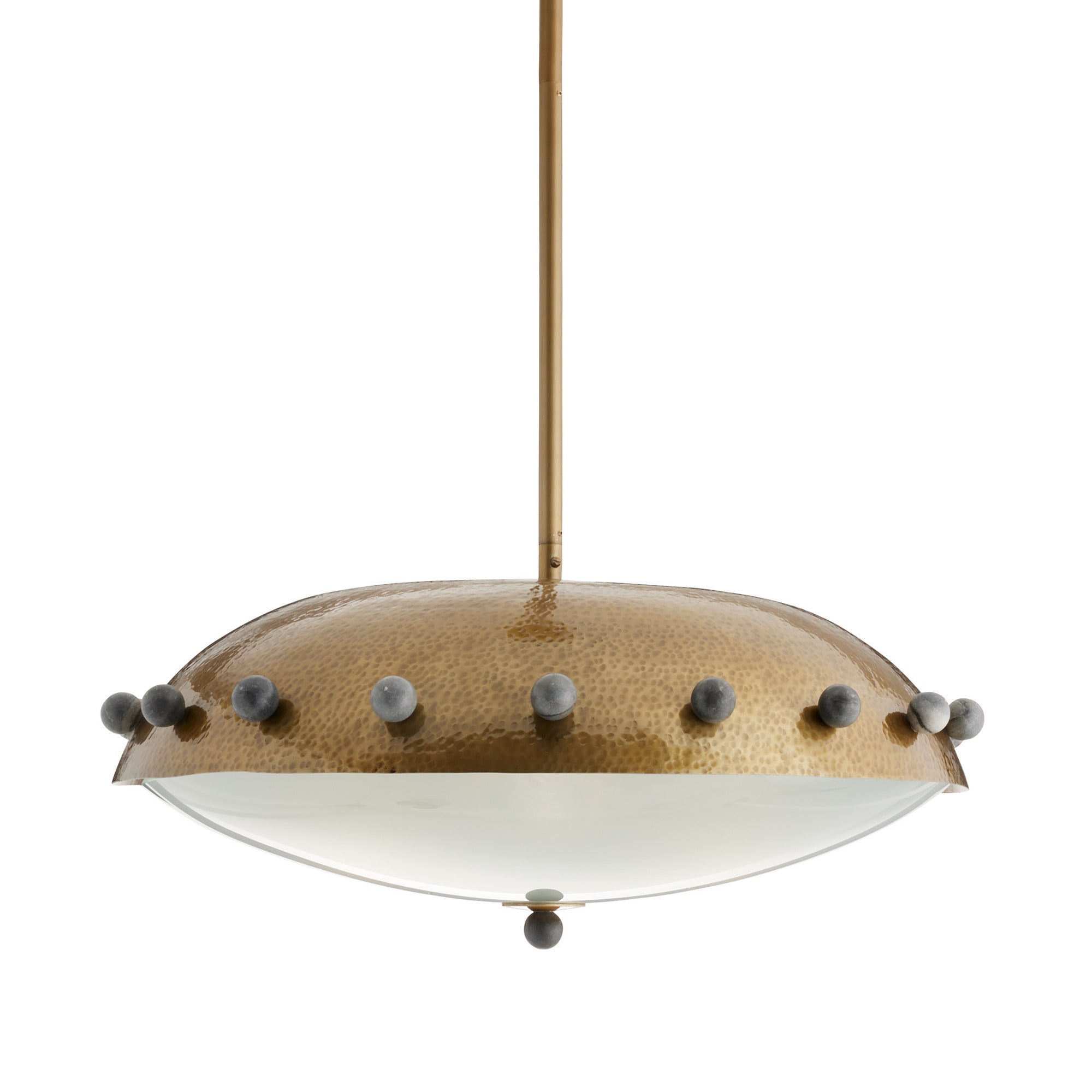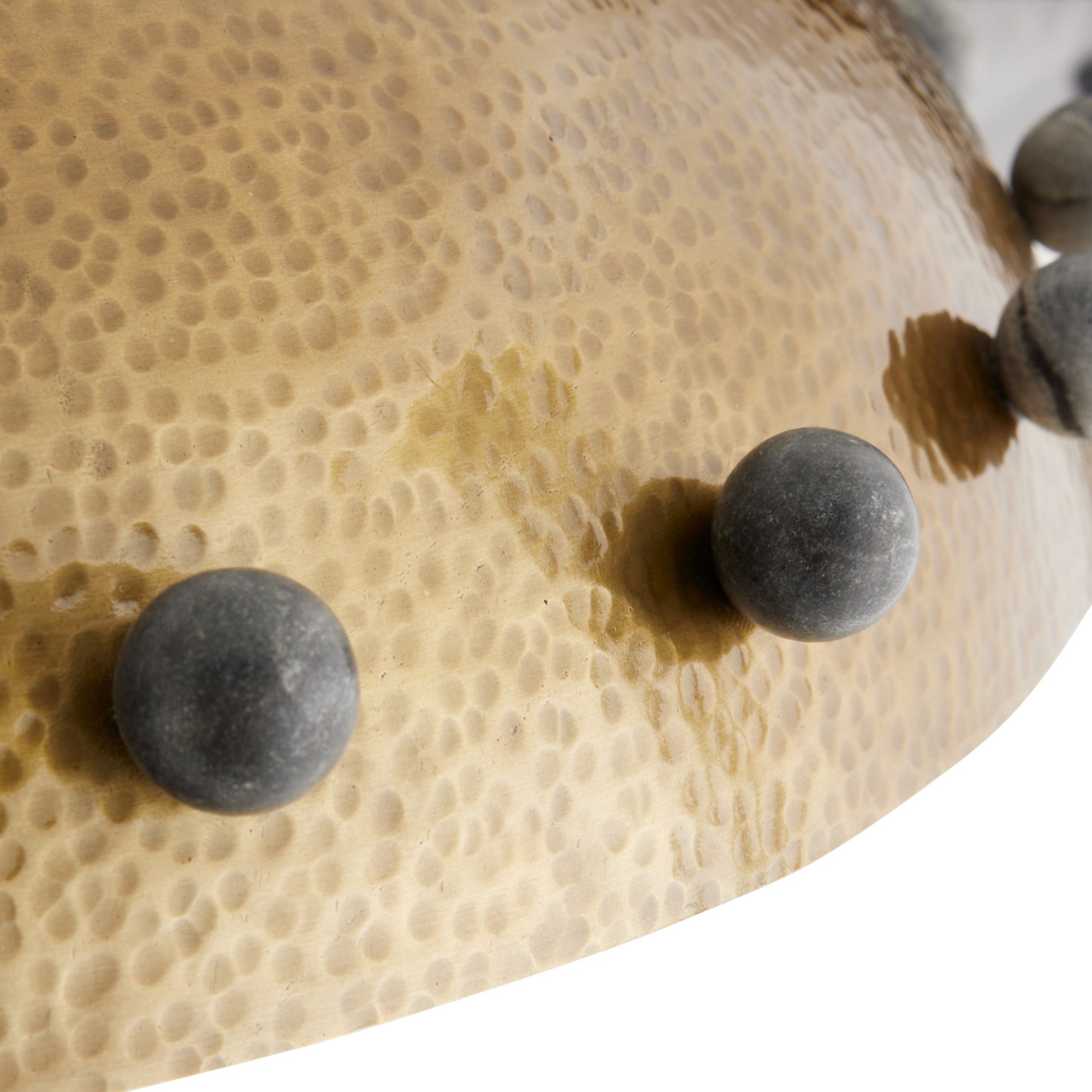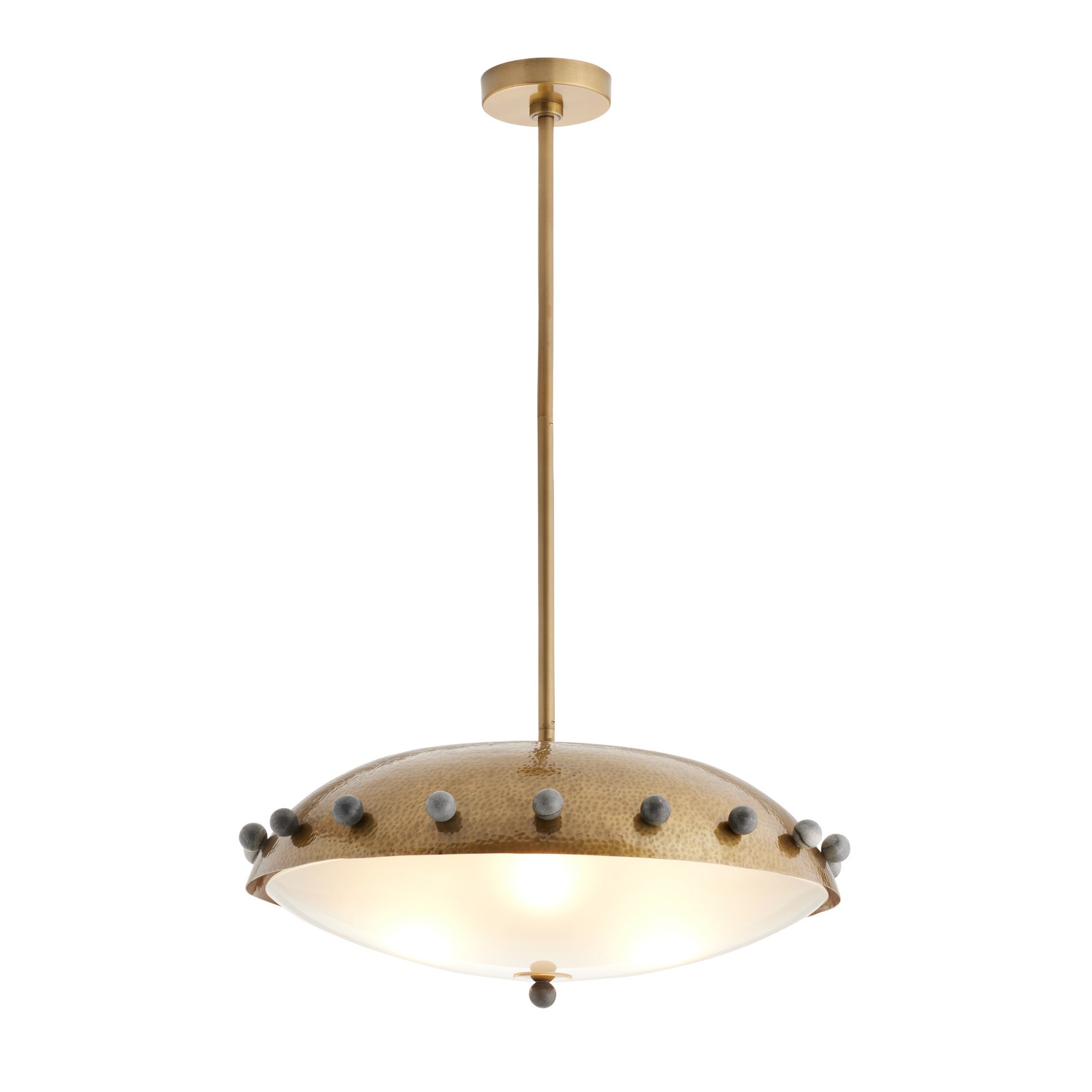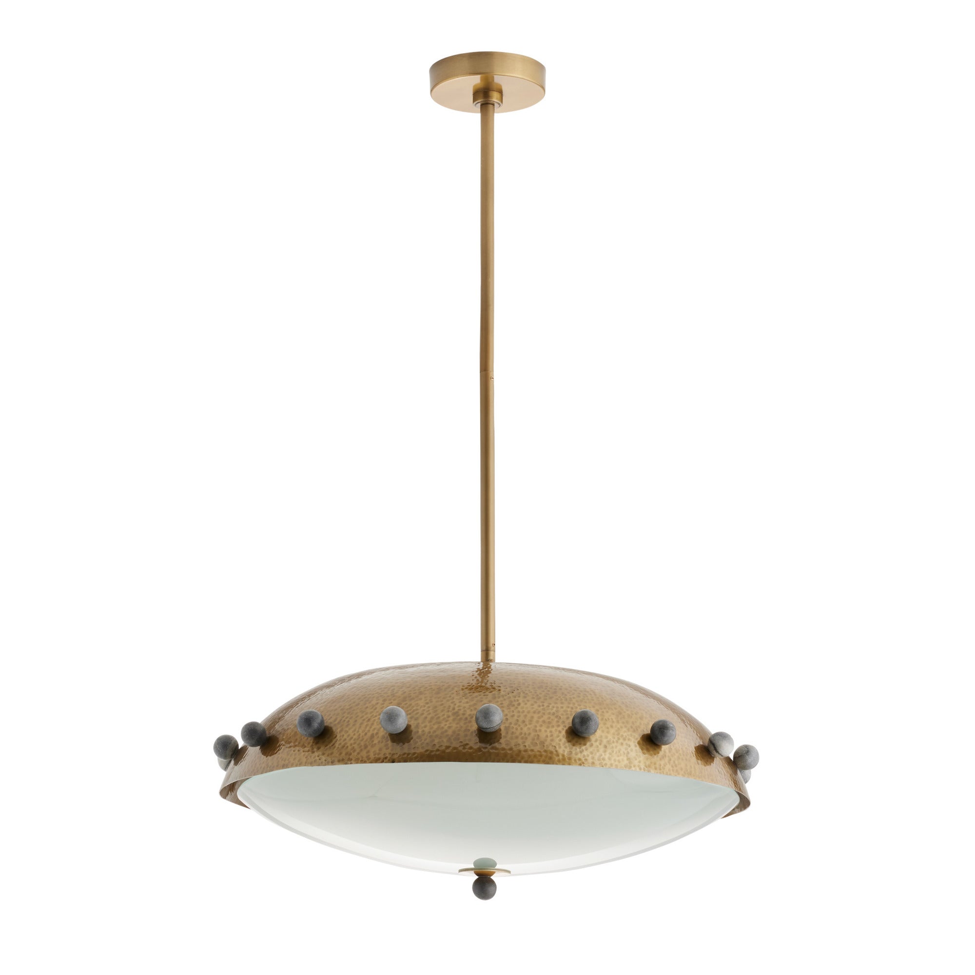 DescriptionReminiscent of armor or a shield, a dome shade of antique brass-plated iron is hand-hammered for a textural finish. Studded all around the perimeter with spheres of black marble, it is impactful when hung alone or in multiples. Underneath the frosted glass diffuser, three bulbs emit a subtle glow. Damp-rated, although limited covered outdoor areas may affect finish. Finish will vary.