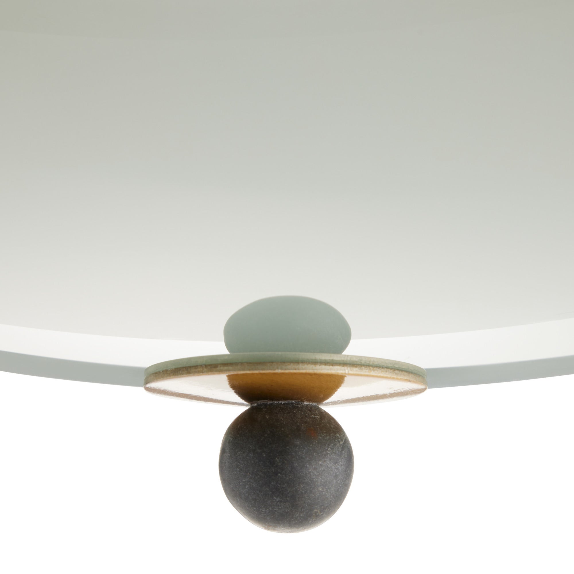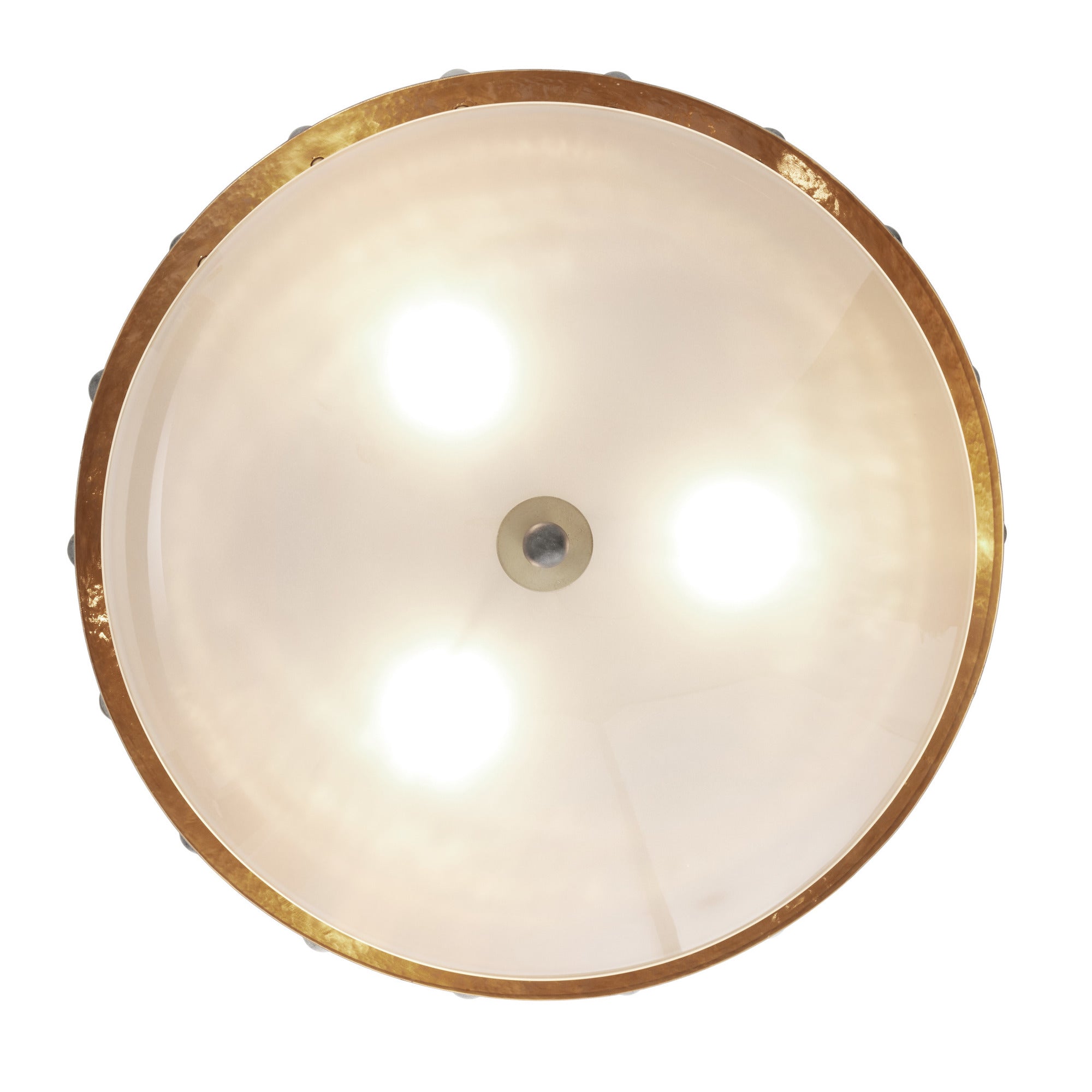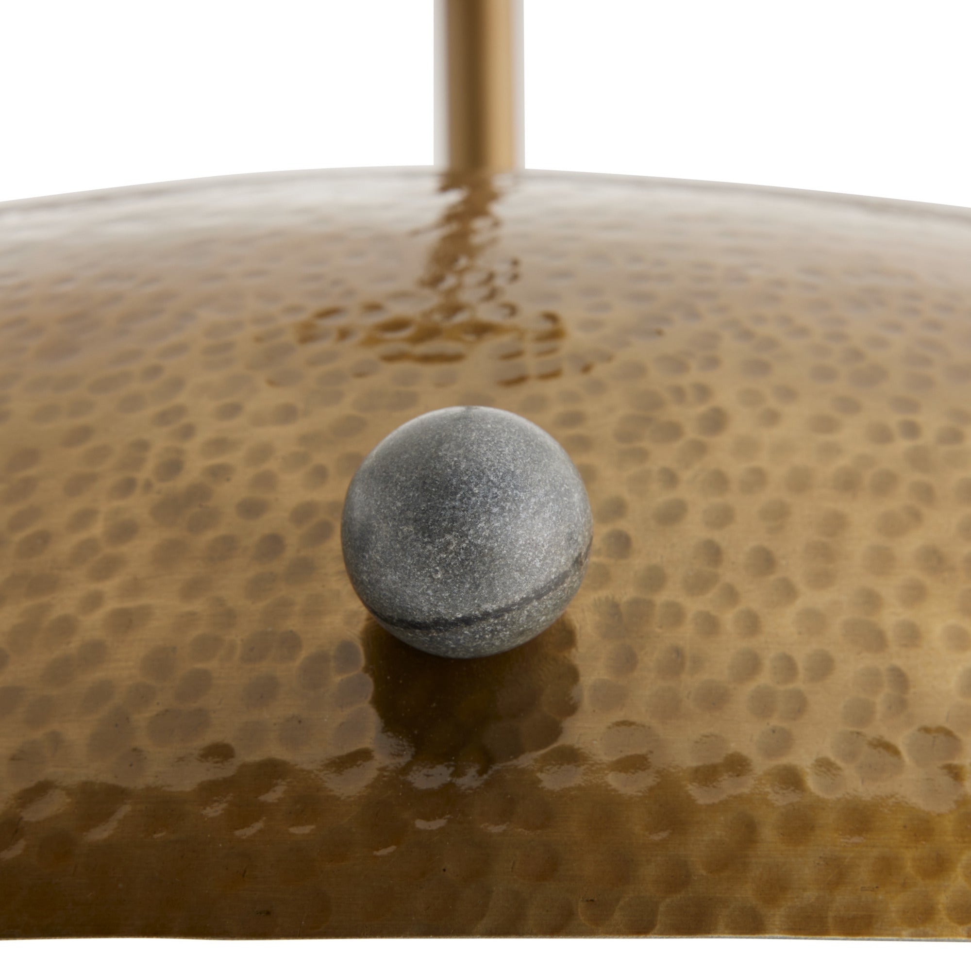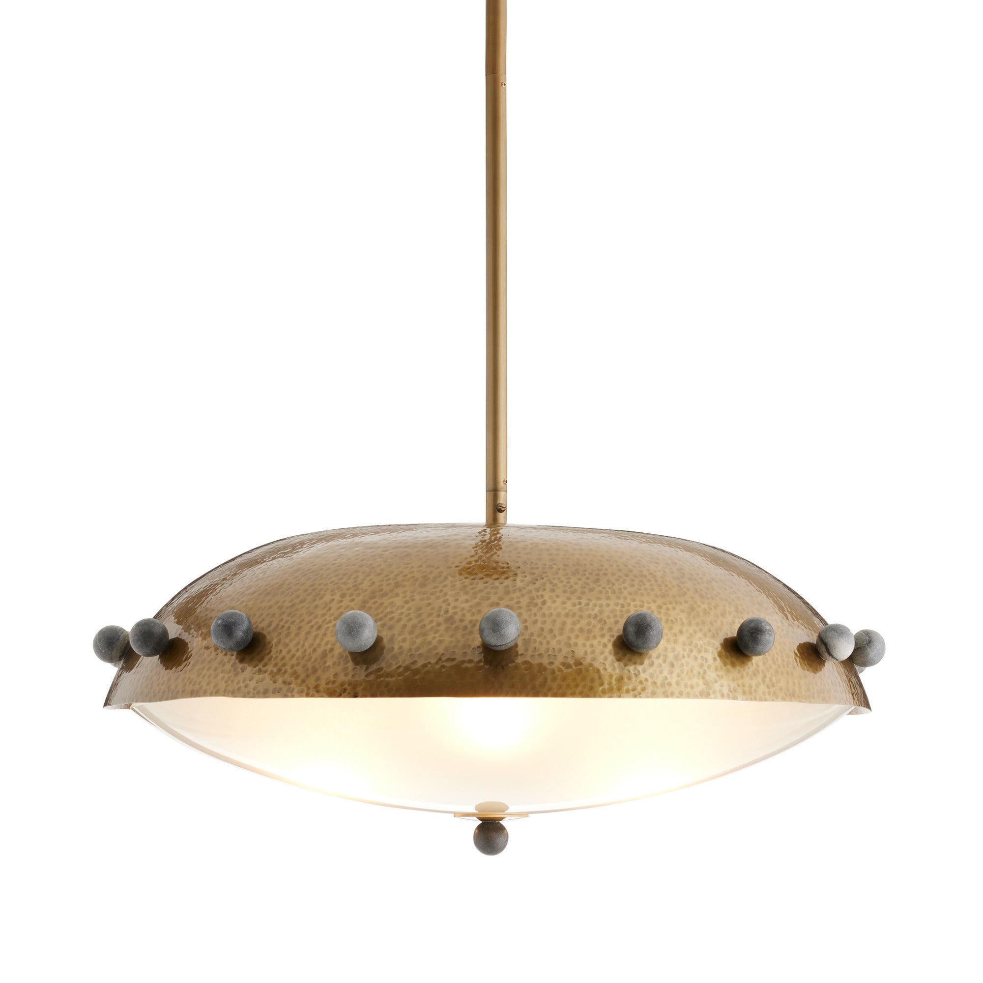DescriptionReminiscent of armor or a shield, a dome shade of antique brass-plated iron is hand-hammered for a textural finish. Studded all around the perimeter with spheres of black marble, it is impactful when hung alone or in multiples. Underneath the frosted glass diffuser, three bulbs emit a subtle glow. Damp-rated, although limited covered outdoor areas may affect finish. Finish will vary.