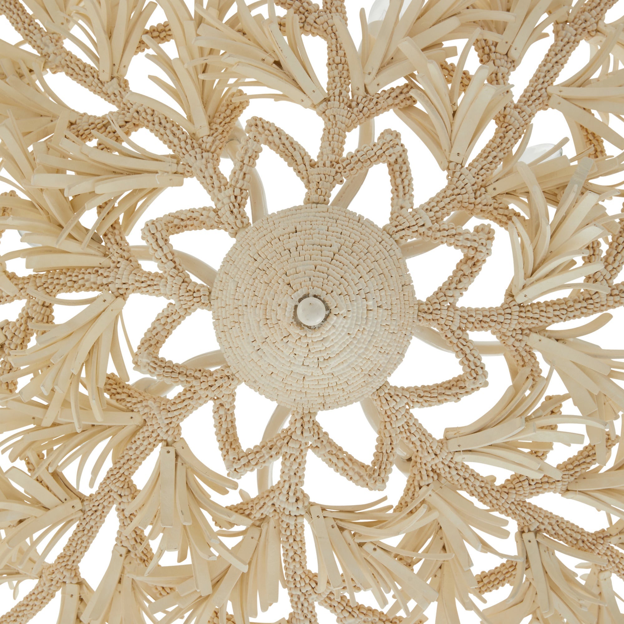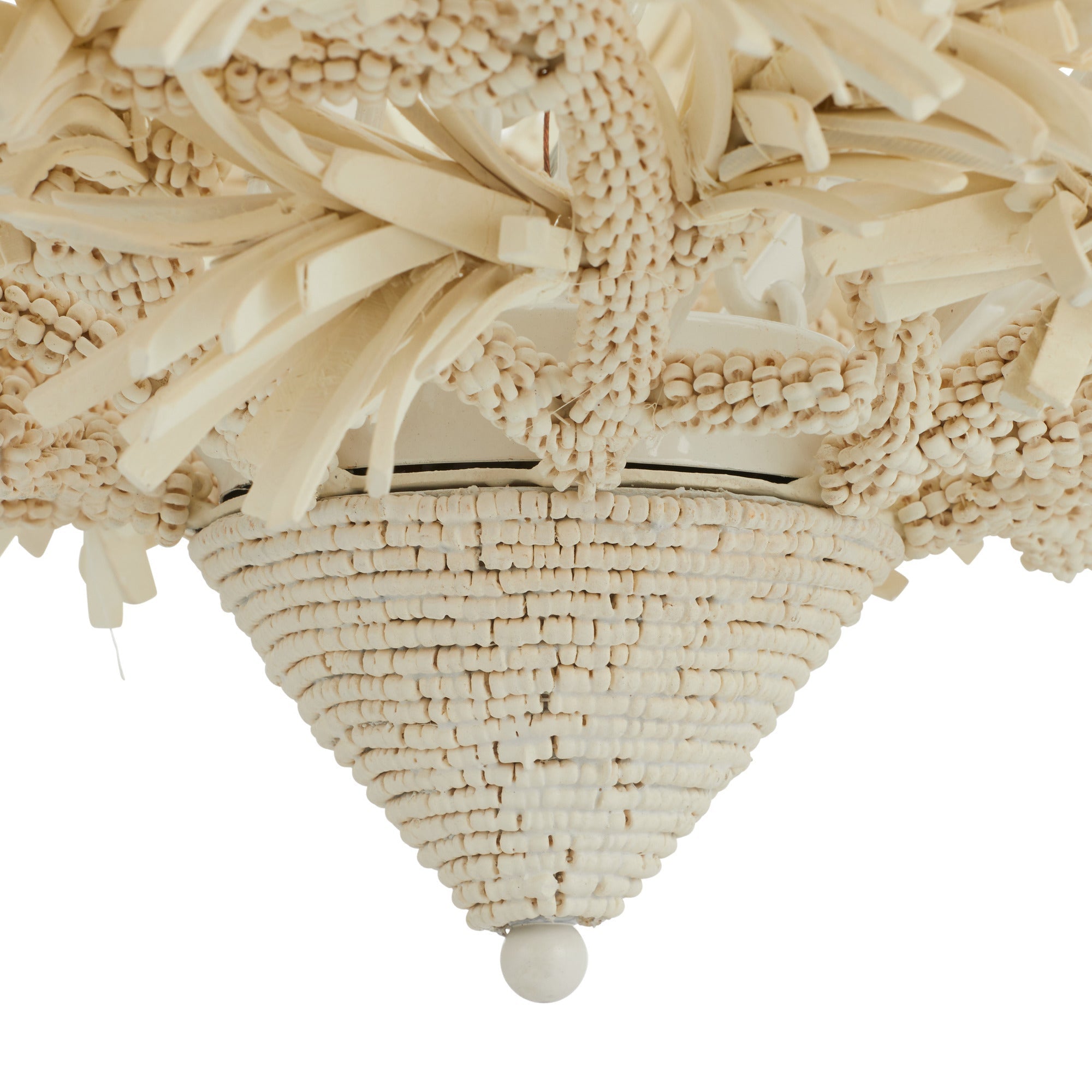 DescriptionA textural mix of ivory coconut shell beads gives this fixture the look of a carefully constructed bird's nest. Delivering texture and movement wherever it is placed, it makes a bold choice for a coastal-themed room. Suspended from a white iron chain and canopy. Finish will vary.