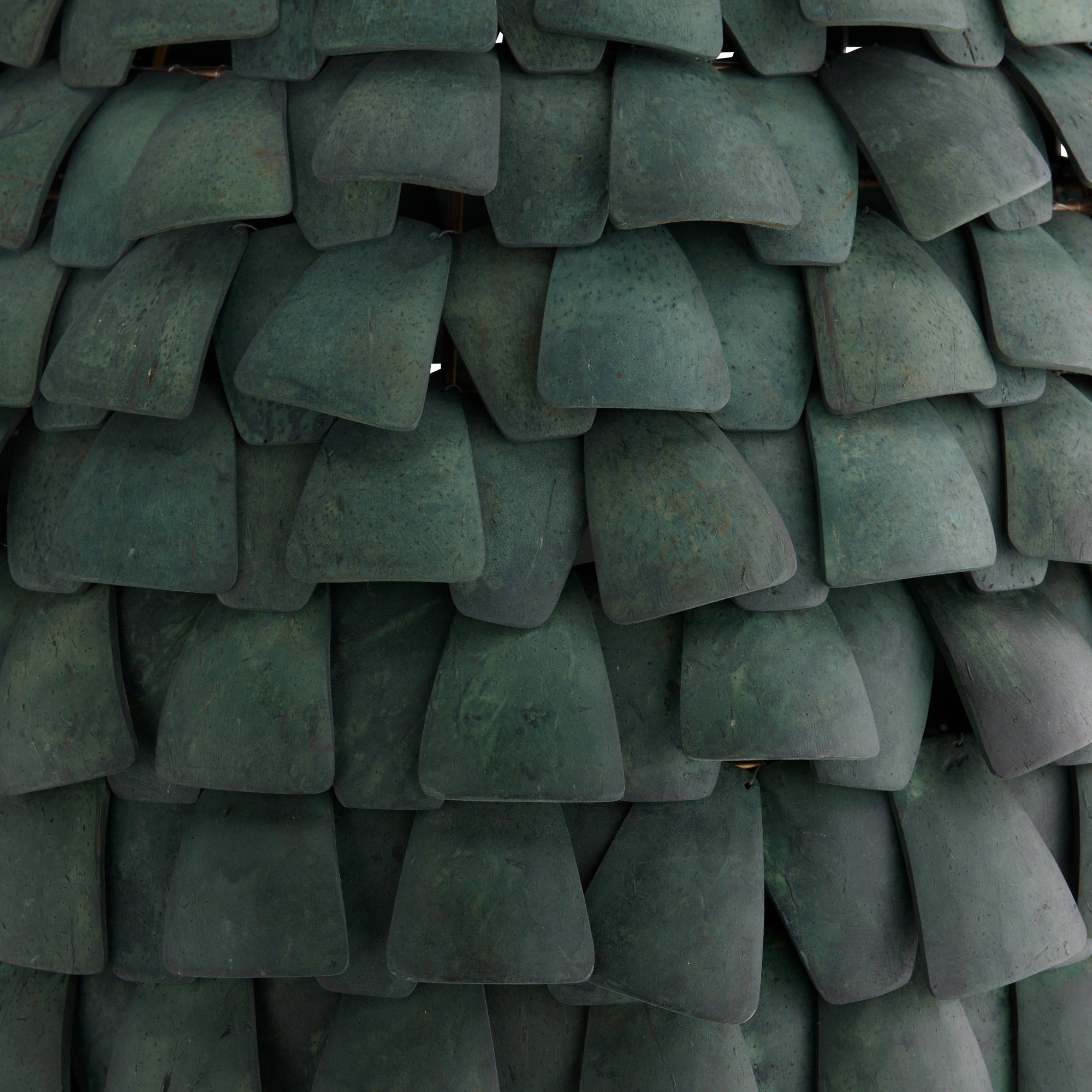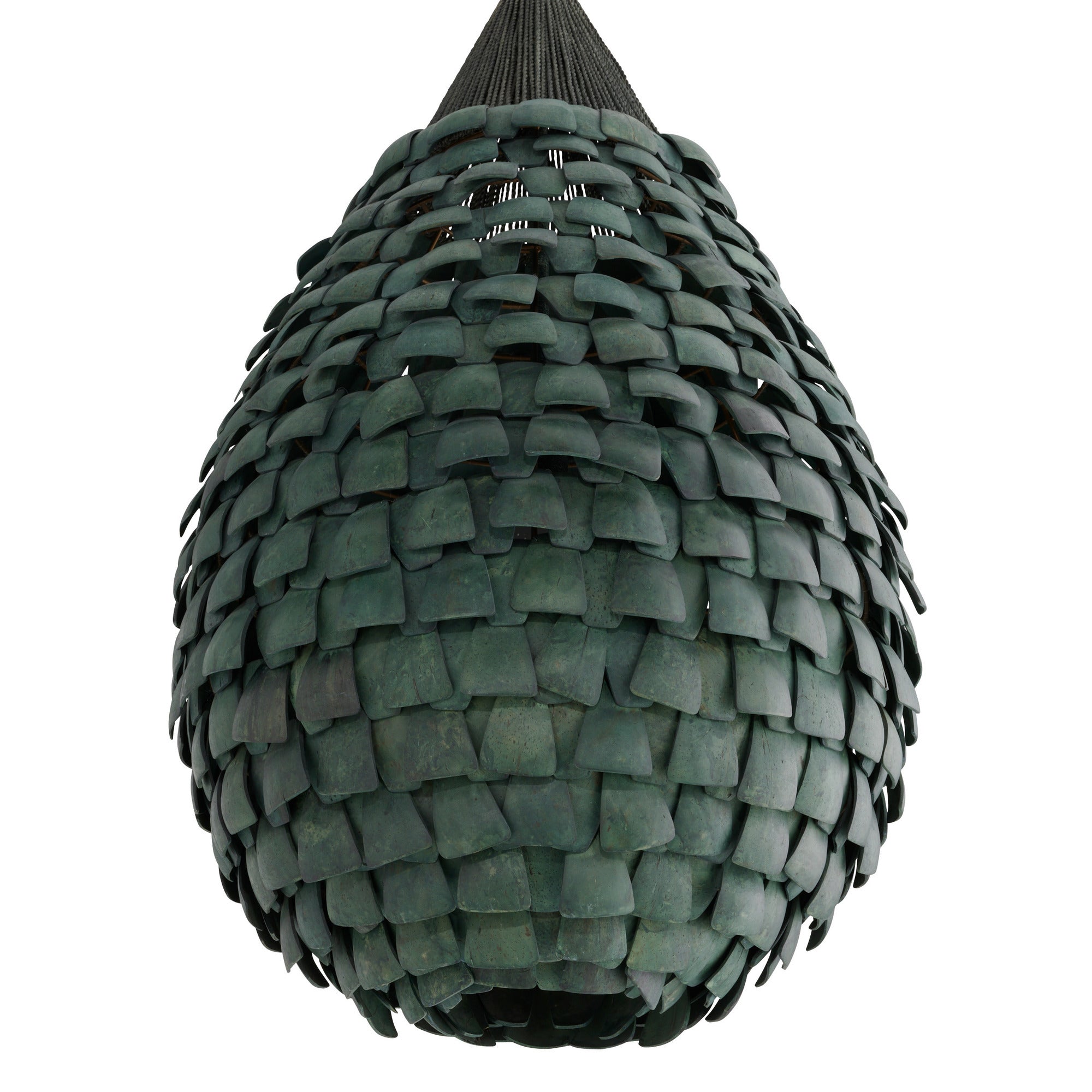 DescriptionShingles of eucalyptus hue stained coco shells are layered for a fish scale effect on an armature of antique brass-plated iron. Suspended from strands of dark eucalyptus stained abaca rope, the Ferndale style is anchored by an antique brass iron pipe finished with carefully wrapped details. Finish will vary.