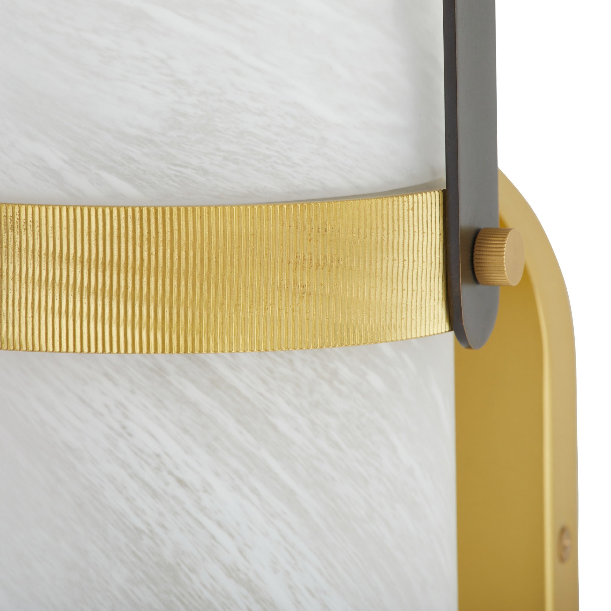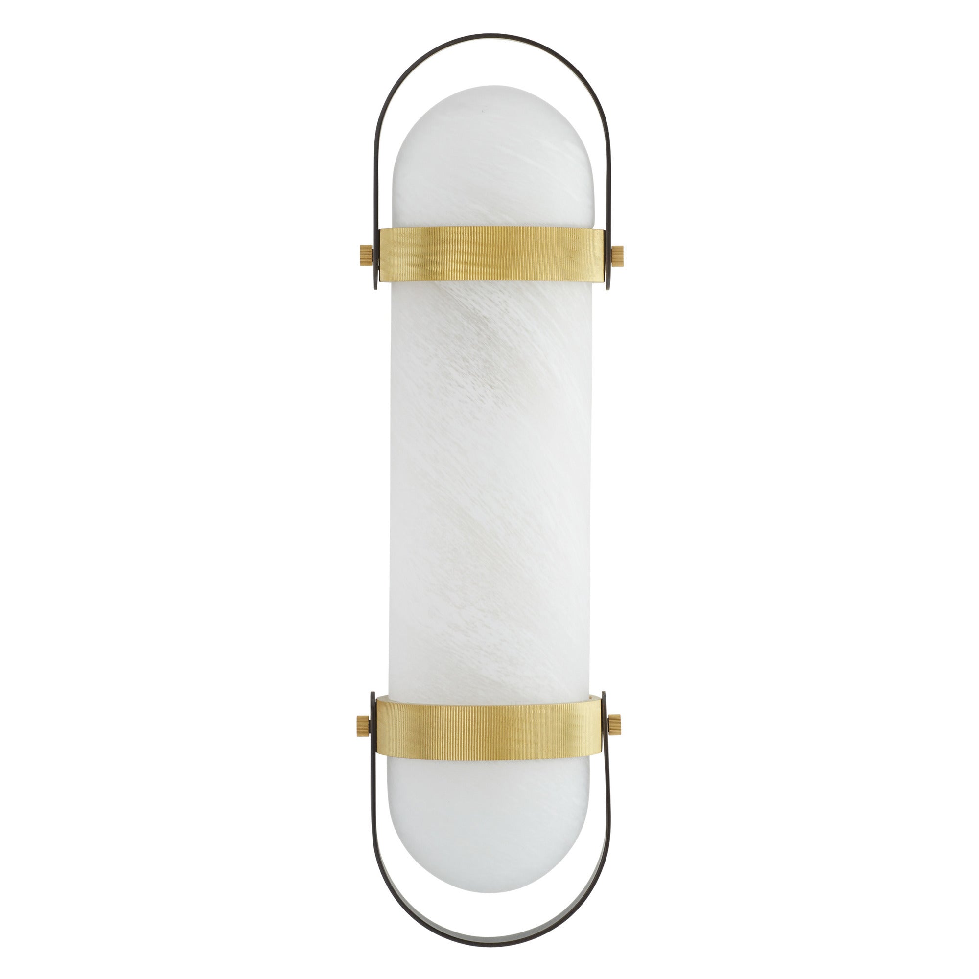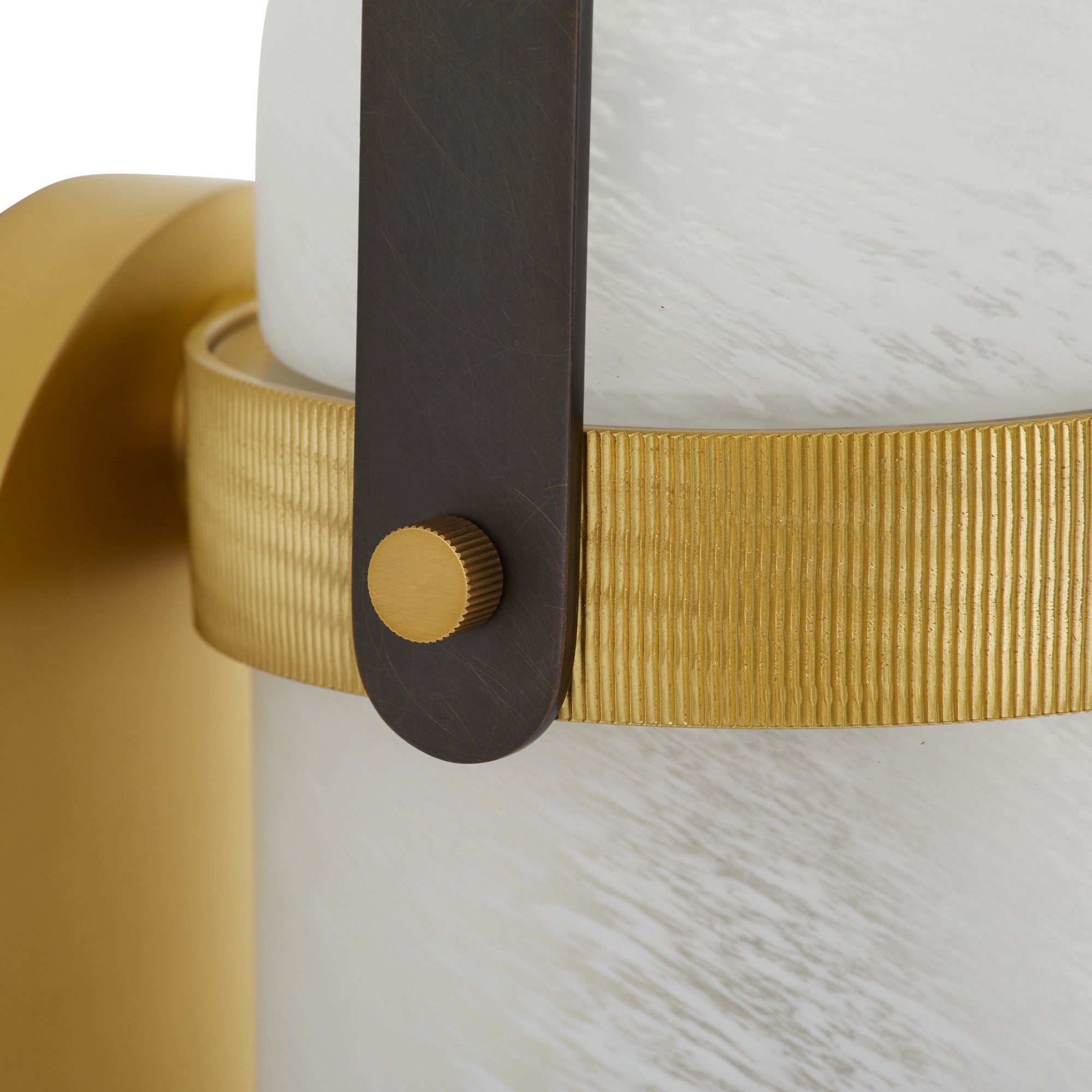 DescriptionEquestrian-inspired stirrups of English bronze-plated steel highlight the pendant setting of this elegant sconce. A capsule-shaped fixture of matte swirl glass is mounted on a backplate of antique brass-plated steel, with ridged details adding textural interest. Damp-rated, although limited covered outdoor areas may affect finish. Finish will vary.