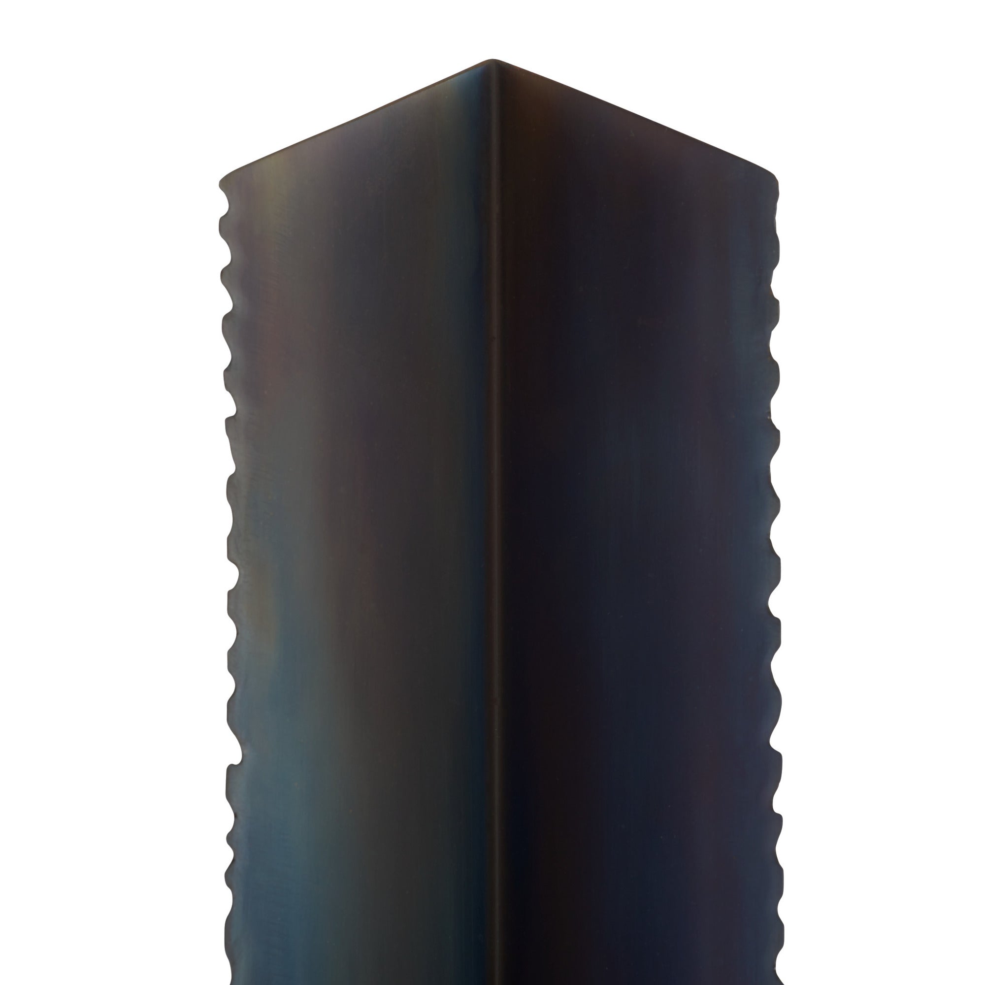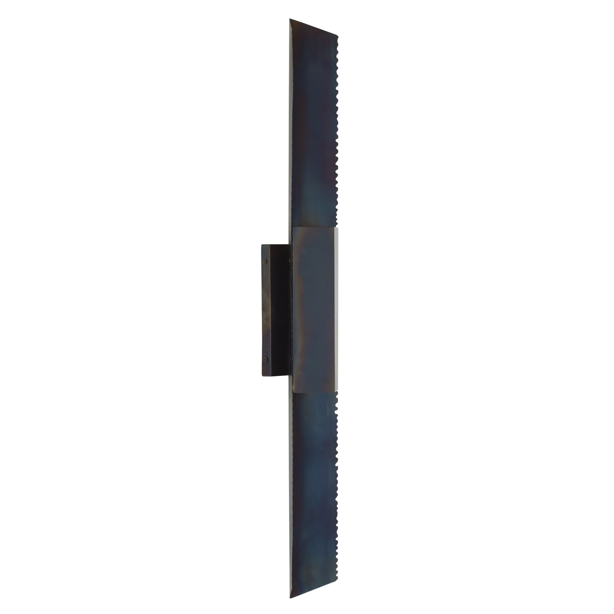DescriptionContemporary mirrored architecture gets a literal edge with our burnt iron sconce. Brutalist-inspired sawtooth details are juxtaposed with a V-shaped grooved opening that allows light to highlight its blue-hued finish. Can be staged horizontally and vertically. Damp-rated, although limited covered outdoor areas may affect finish. Finish will vary.