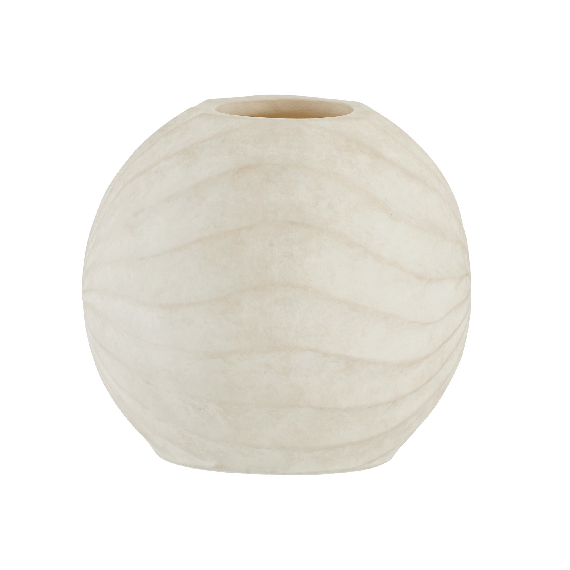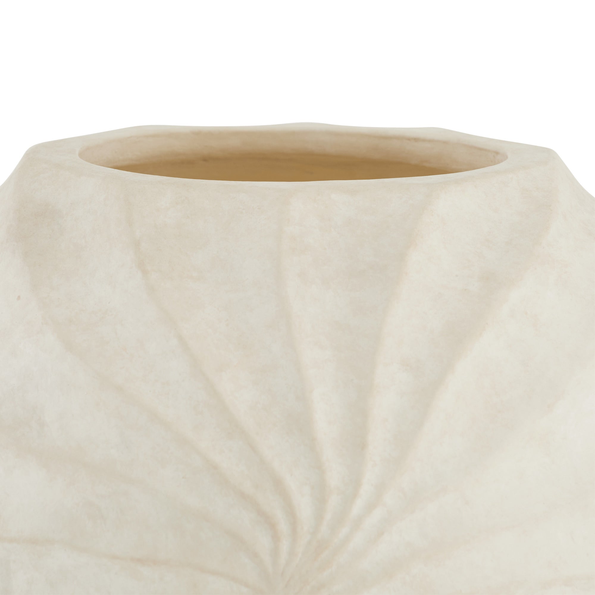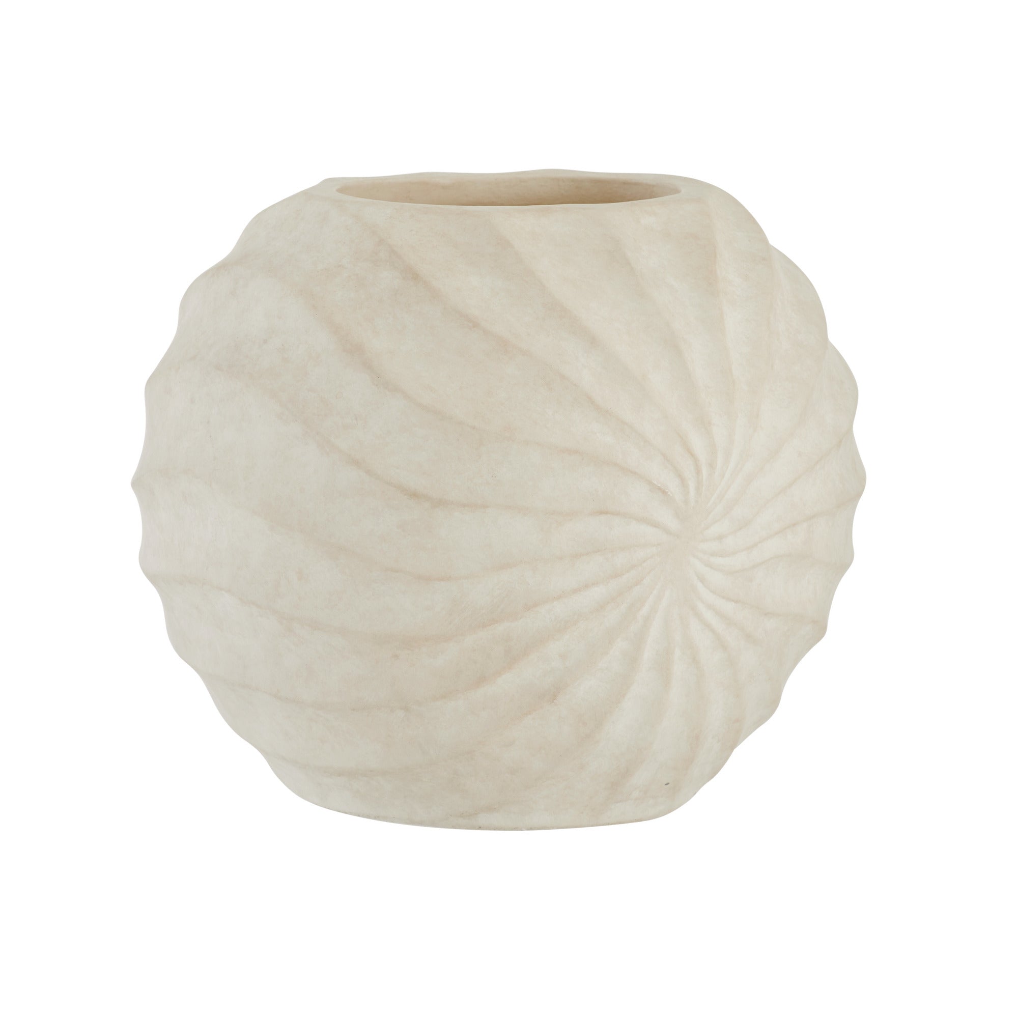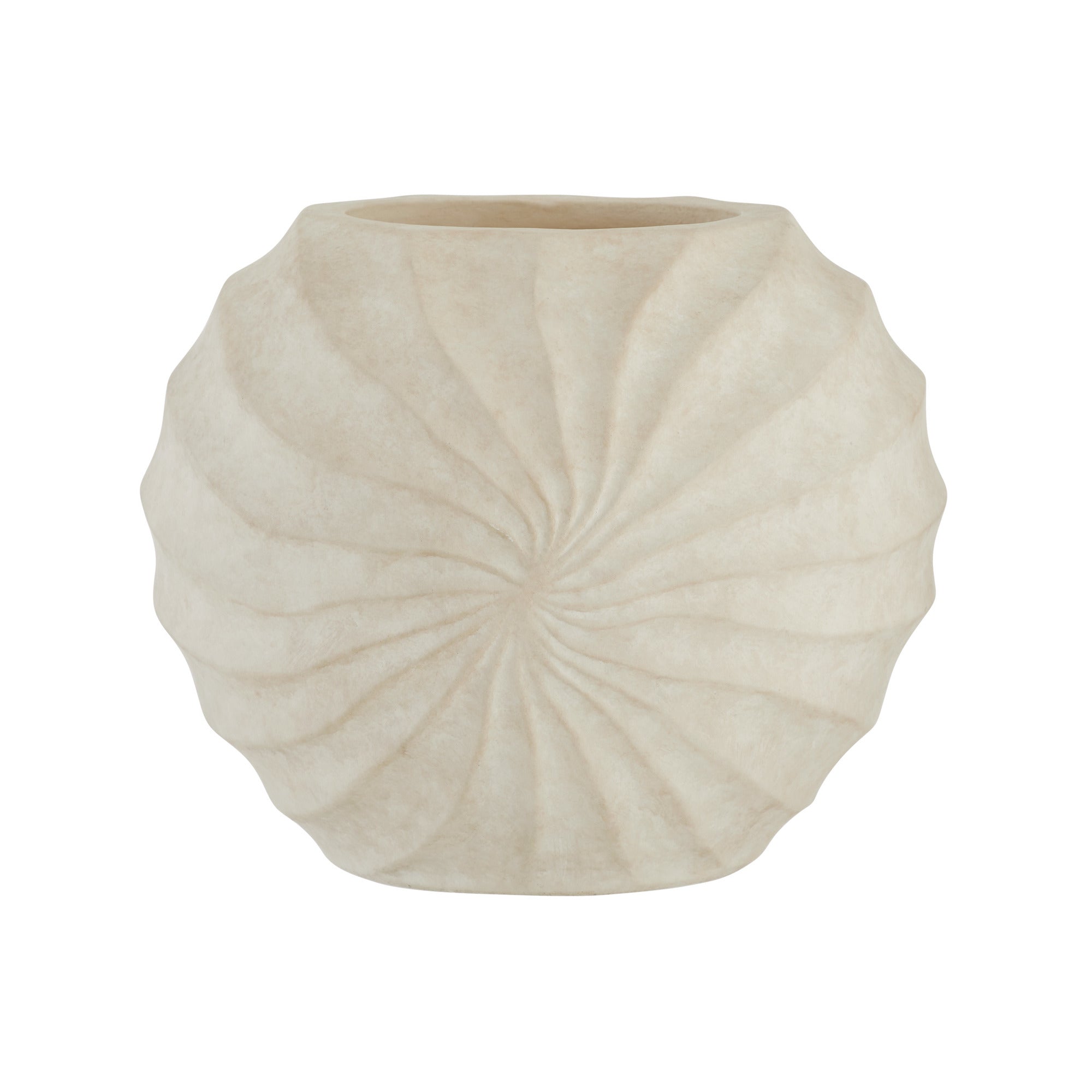 DescriptionThe rippled and rhythmic patterns of a Nautilus shell find a visual echo in a vase of eggshell-glazed terracotta. Each ridge of the hand-sculpted form spirals together to create a striking, contemplative piece. Finish will vary.