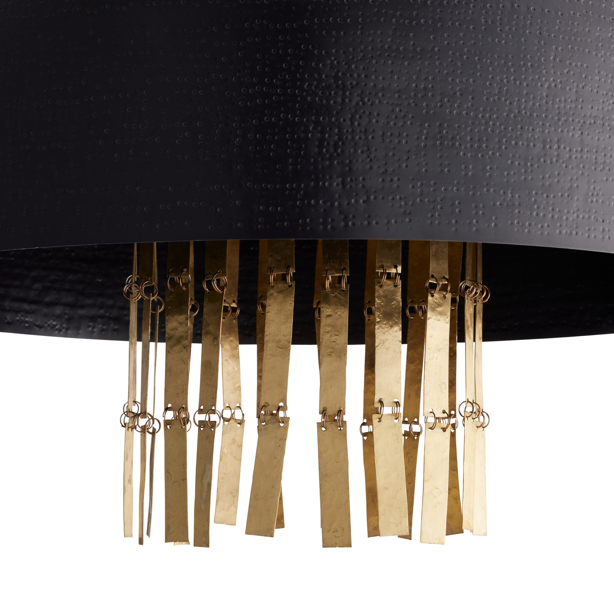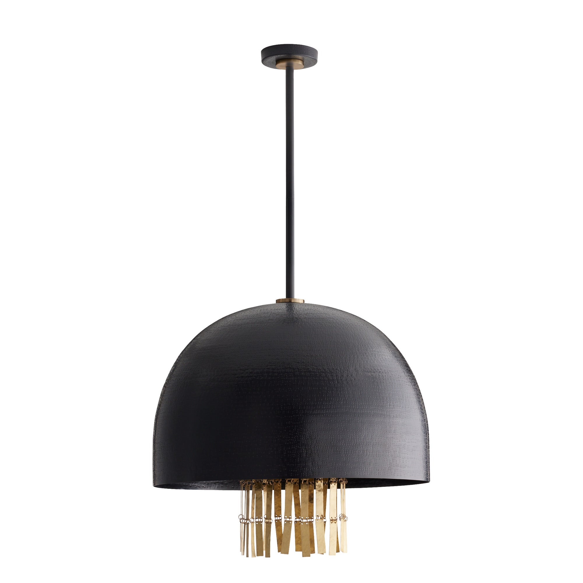 DescriptionJewelry-inspired accents of antique hammered brass cascade from our pendant light with a sparkling rain effect. Designed to encourage the play of light, they are a stylish compliment to a stippled dome shade of English bronze-plated hammered iron. Matching pipe and canopy. Damp-rated, although limited covered outdoor areas may affect finish.