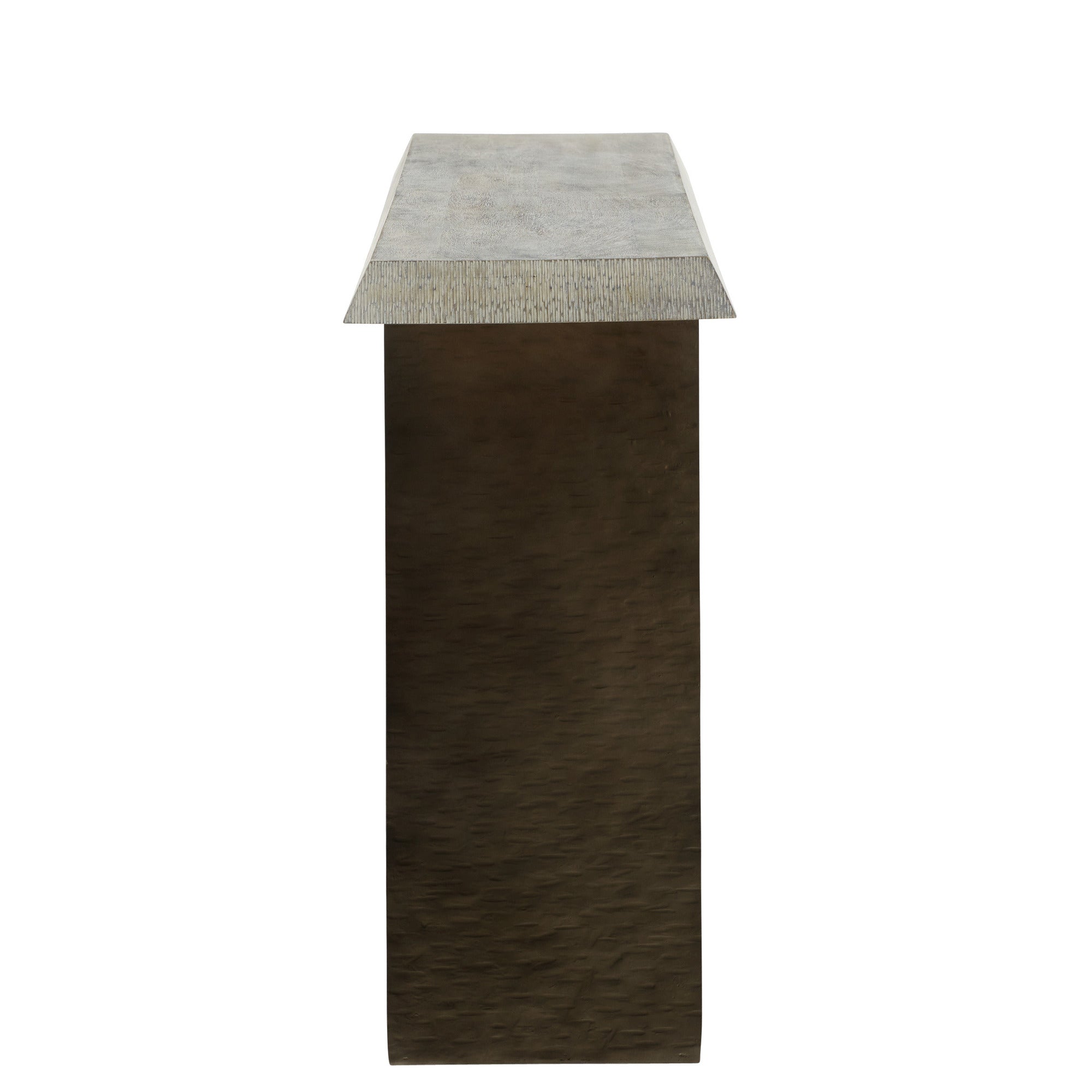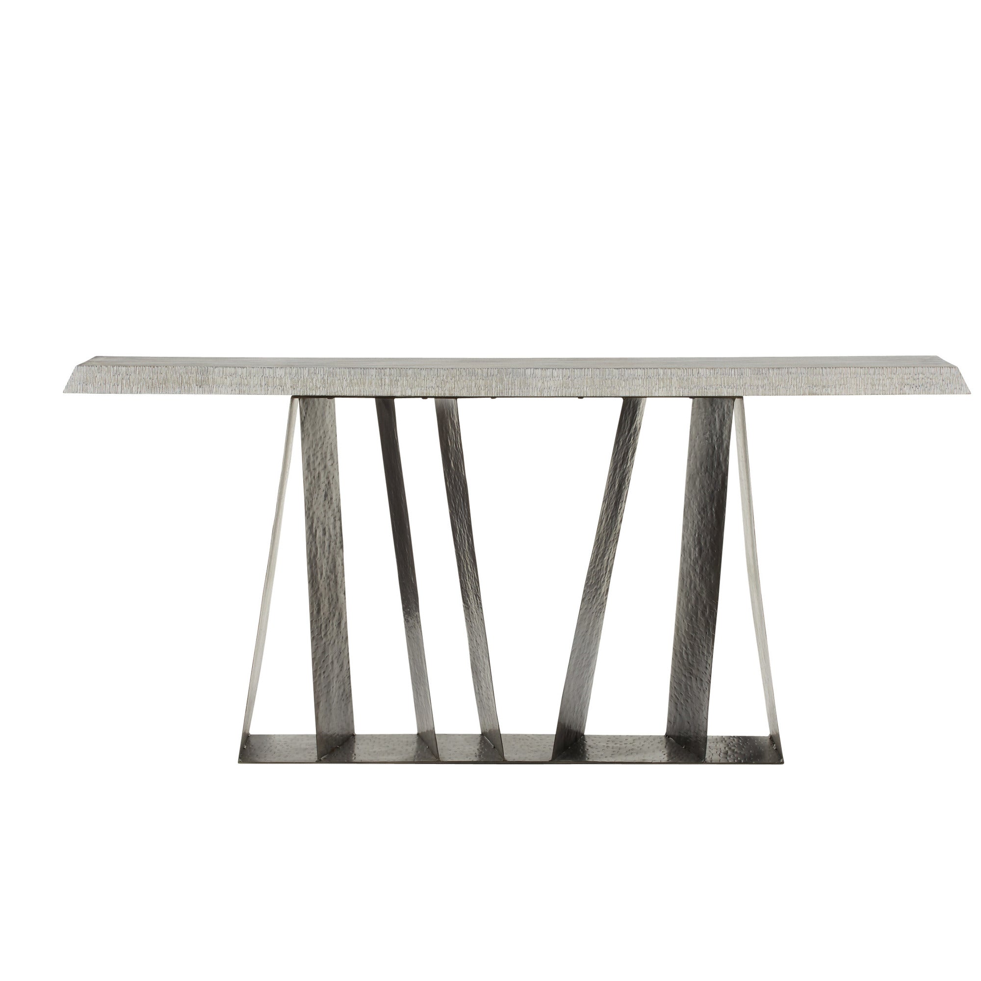 DescriptionInspired by architect Frank Lloyd Wright's iconic home, Fallingwater, the sculptural planes of our modernist console were designed to catch and reflect the light. The rippled surface of smoke mango wood is balanced on supports of carbon iron, delivering an eye-catching mix of materials. This console was designed with an intentionally shallow depth, making it an ideal addition to an accent wall or hallway. Wood will vary.