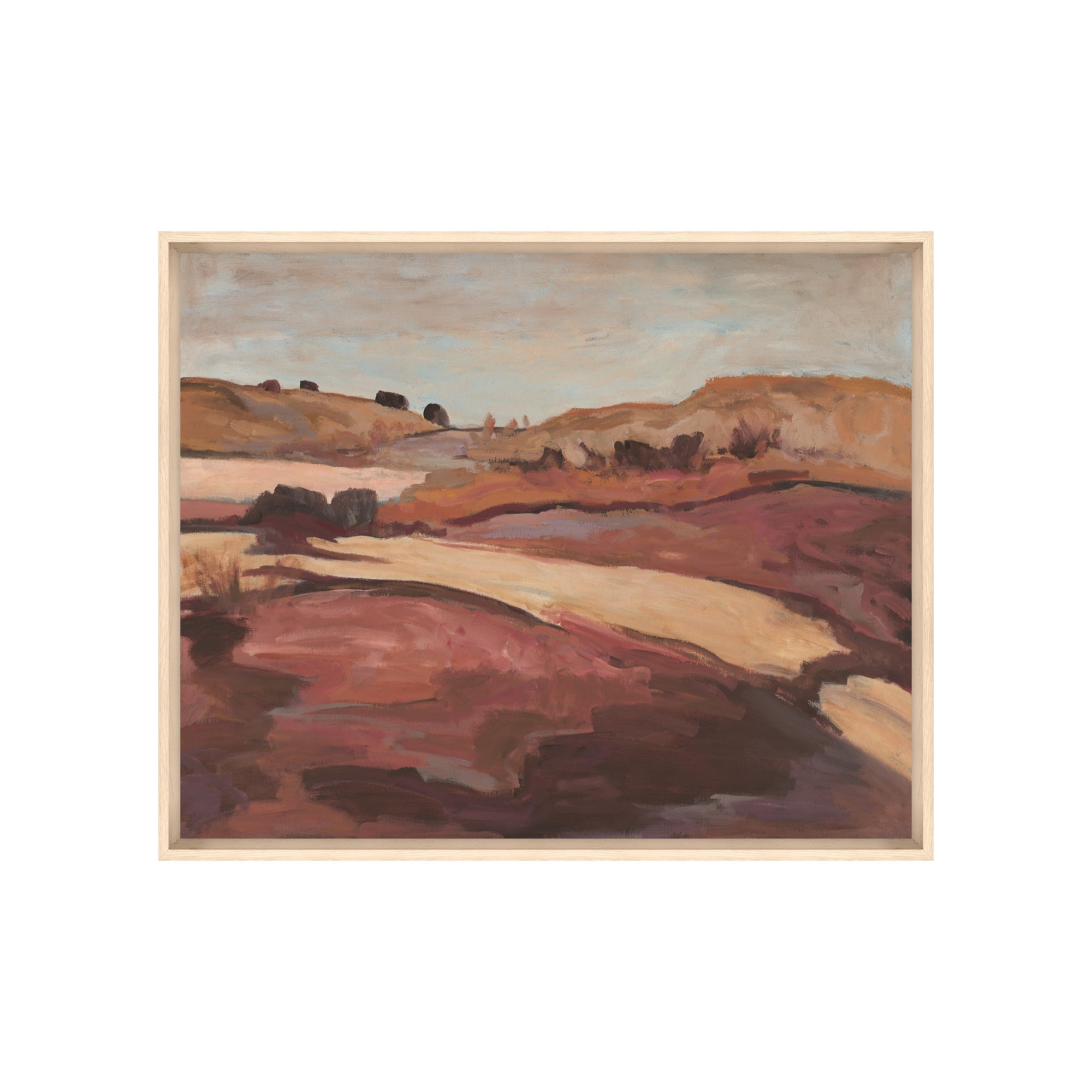DescriptionGolden Horizons by Sena Zander captures the warmth of a sun-baked landscape with earthy reds, soft mauves, and sandy creams flowing across rolling hills. Broad, confident brushstrokes give the scene a sense of movement, as if the land itself is gently shifting under the late-day light. Subtle contrasts between shadow and glow create a quiet depth, inviting the viewer to linger on each curve of the terrain. The painting balances rugged natural beauty with a serene, almost dreamlike atmosphere.