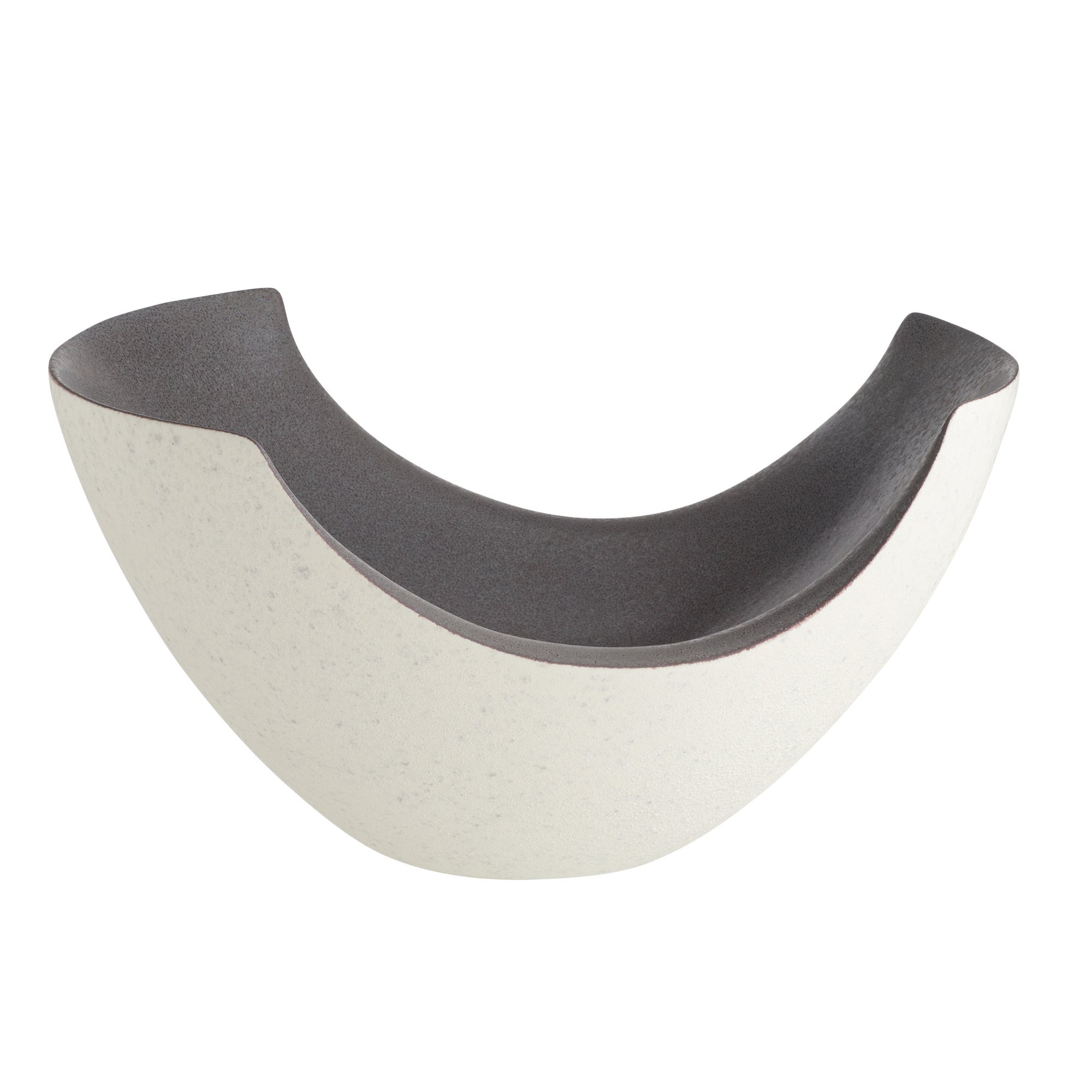 DescriptionHollowed for lightness, this swooping form of our open bowl draws the eye with its architectural lines. Glazed in our new sparrow reactive finish with a gunmetal reactive interior, this porcelain centerpiece features subtle oxblood tones on each seam to highlight the wave-like shape. Finish will vary.