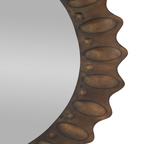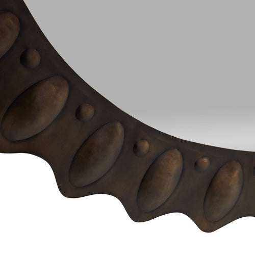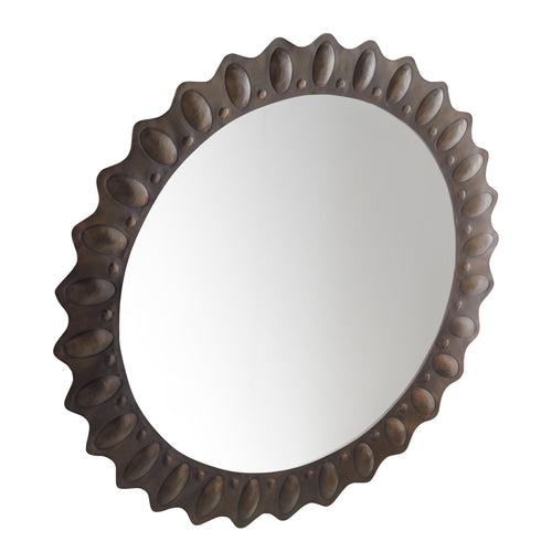 DescriptionA blend of rustic and contemporary styles, our hand-hammered mirror was inspired by the texture of an ancient shield. Crafted of bronze-plated iron and overscaled in size, it has a handmade quality that adds dimension to any room. Finished with a cleat attachment for secure hanging. Finish will vary.