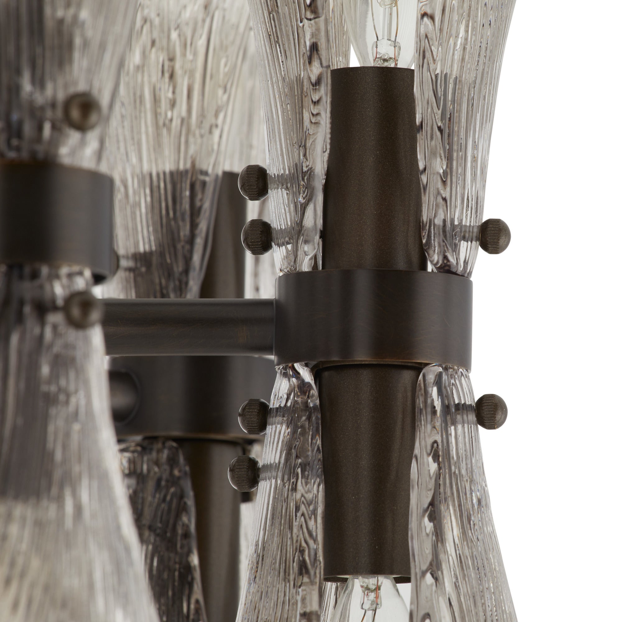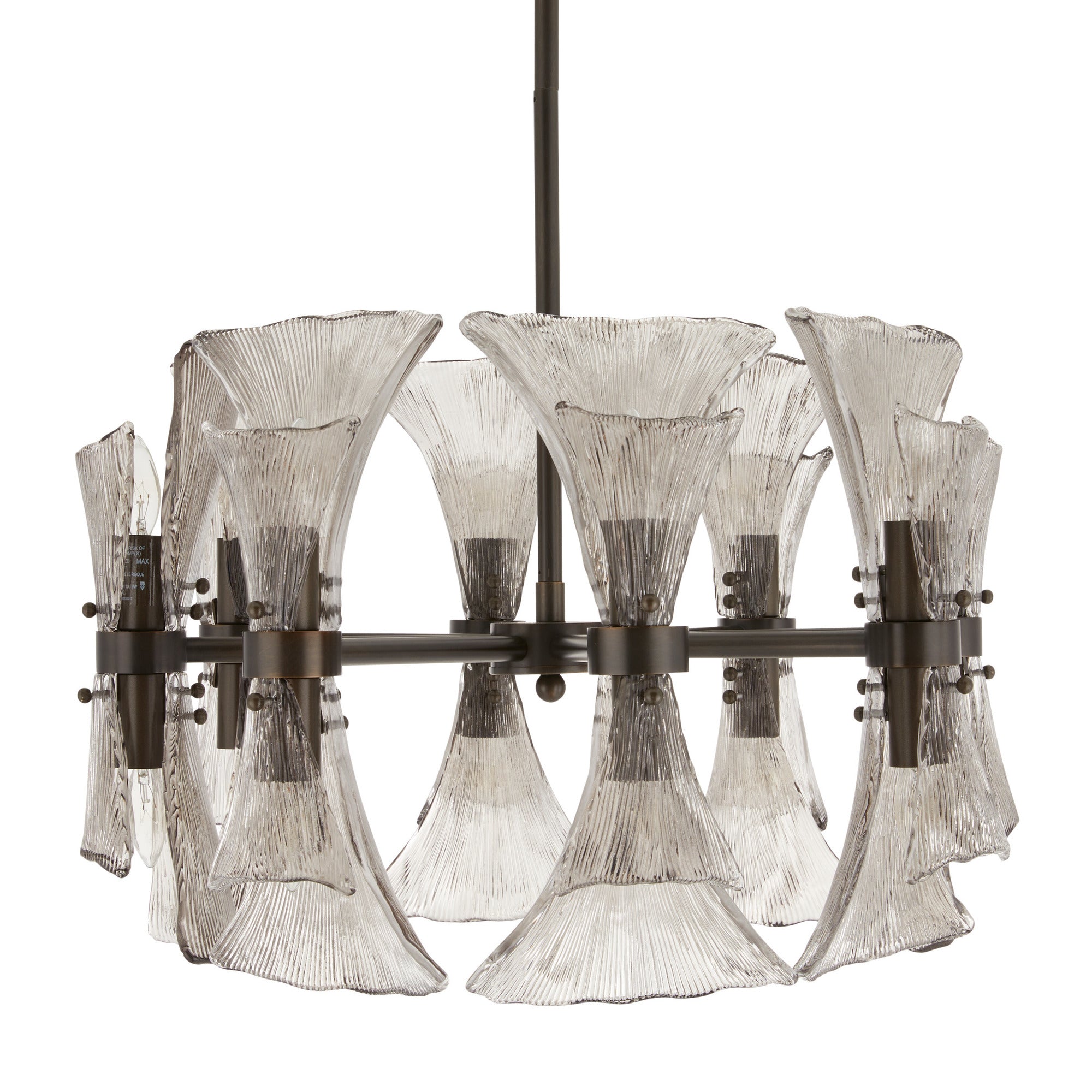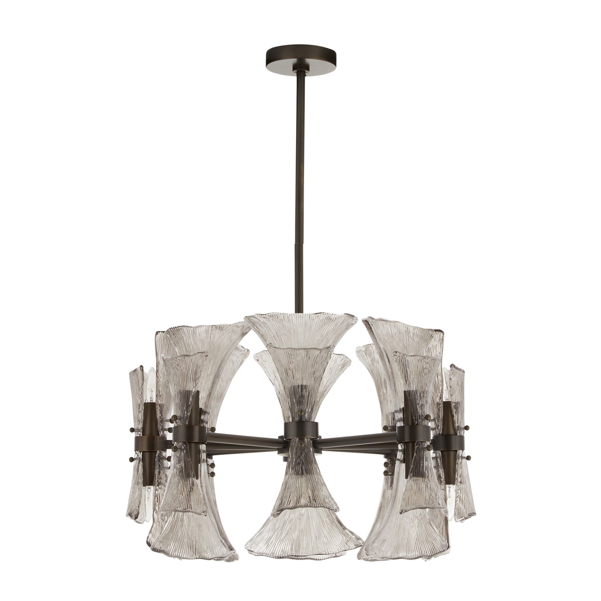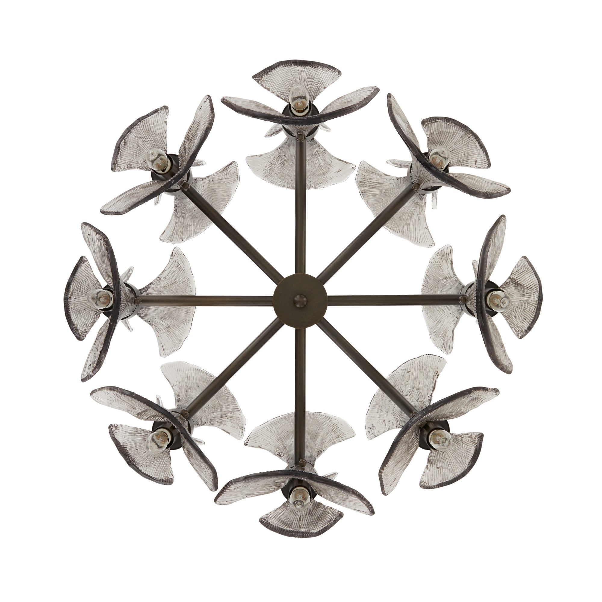DescriptionArt Nouveau jewelry's sinuous lines and natural motifs inform our smoke glass chandelier. Textured like ginkgo leaves, double glass shades blossom in a concentric circle from a mount of English bronze-plated steel. Made to cradle the light, its reinvented classic form is suspended from a matching pipe and canopy, making it a spectacular accent over a table. Damp-rated, although limited covered outdoor areas may affect finish.