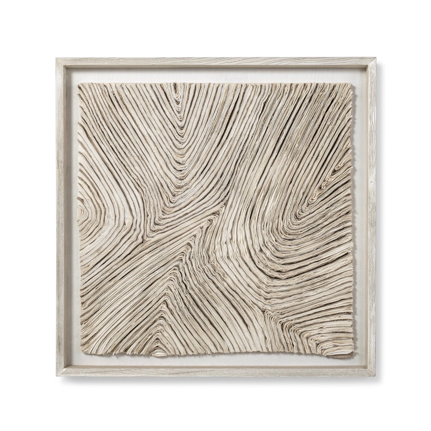 DescriptionLayers of fabric in natural and white tones are hand folded and sewn to create a uniquely textural design against a linen background and complemented by an oak wood frame in white cerused finish. Decor comes with metal cleats for hanging.