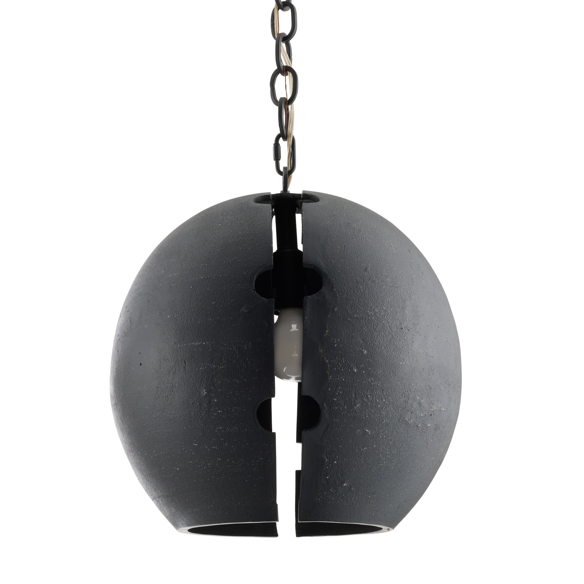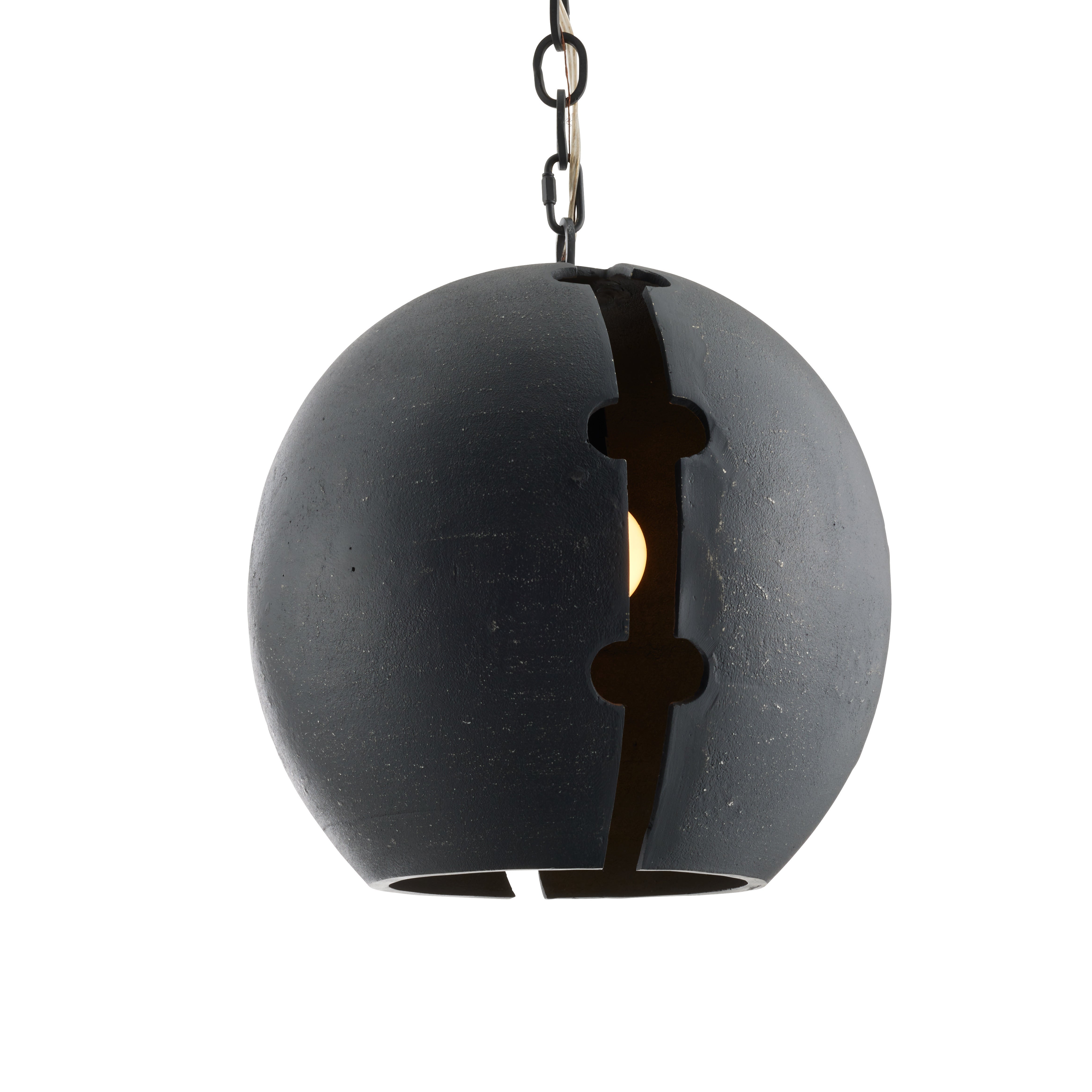 DescriptionInspired by an Indian bell, the dome form of the Hartland has the look of an ancient found form. Cast of aluminum in textured matte charcoal, the finish lets a hint of underlying silver peek through. The overscale shade's demi-lune cutout allows the bulb to disperse light with an exciting play of shadow. Damp-rated, although limited covered outdoor areas may affect finish. Finish will vary.