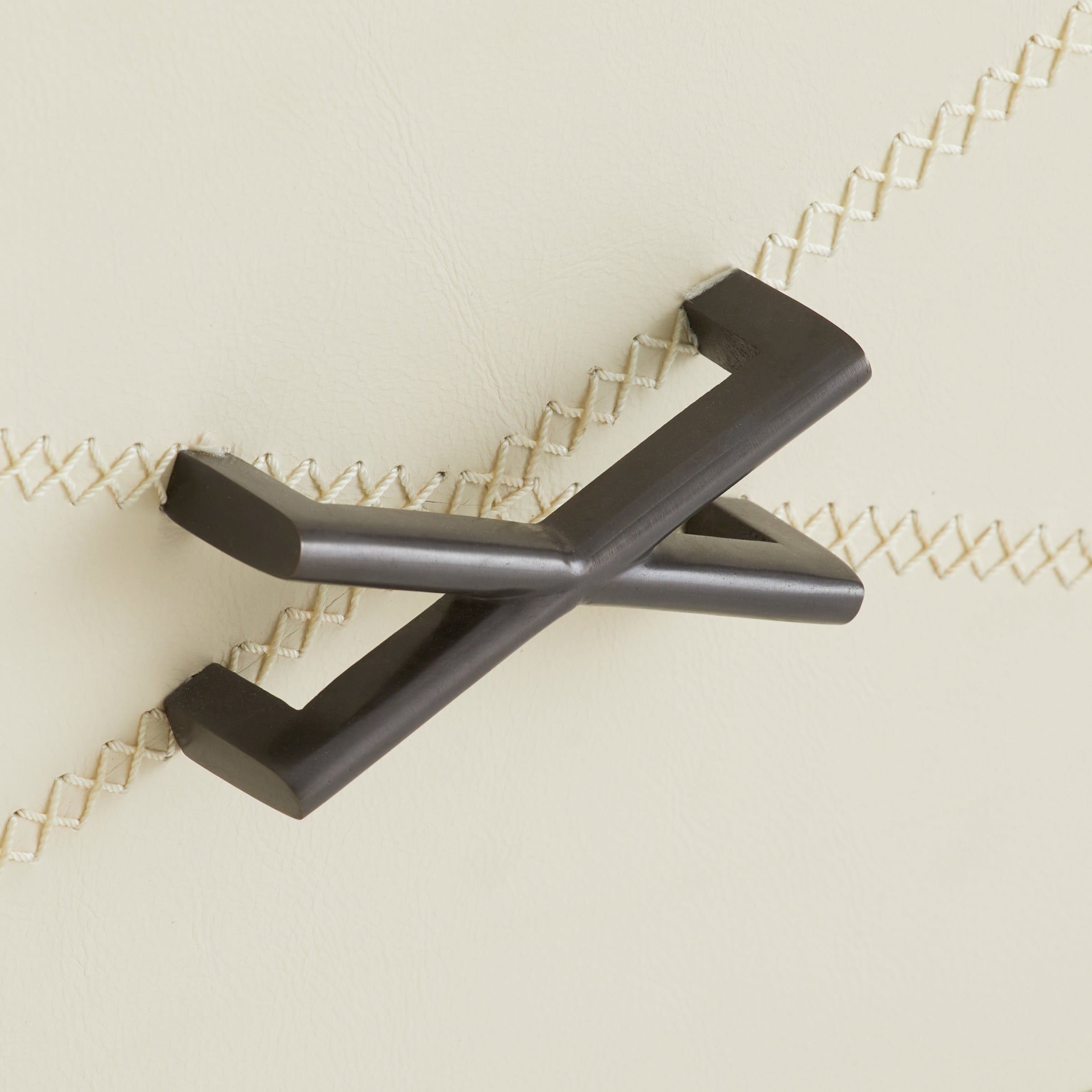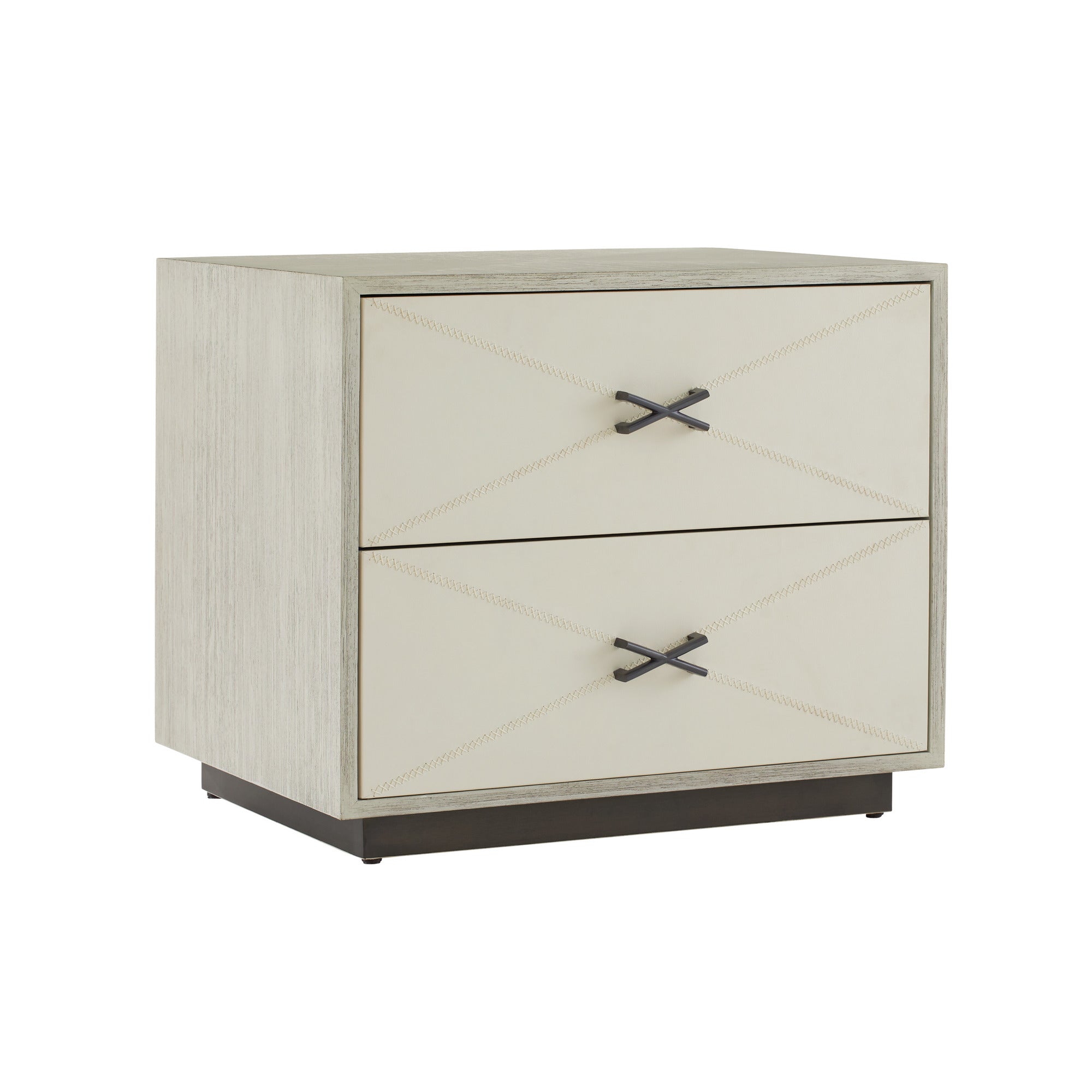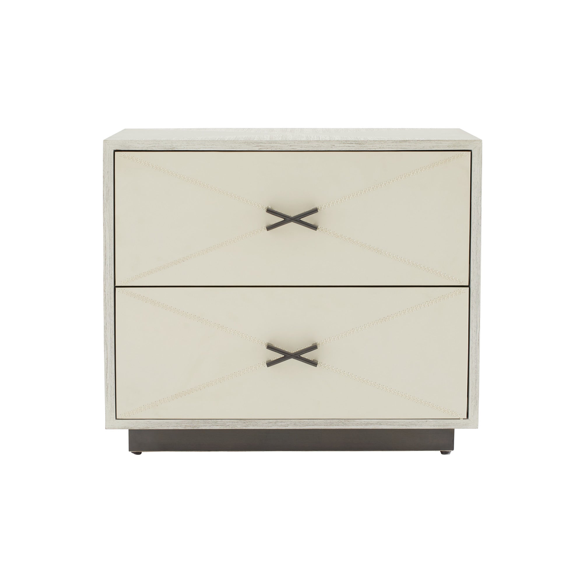 DescriptionWe borrowed whipstitch detailing from fine tailoring to adorn a side table of smoke oak wood. Each ivory leather-covered drawer is enhanced with cast brass hardware in English bronze finish to mirror the linear shape of the stitching. Designed with a generous depth for storage, this sophisticated piece is veneered all the way around, allowing it to float within the room. Soft-close drawers and English Bronze-plated stainless-steel base. Leather will vary.