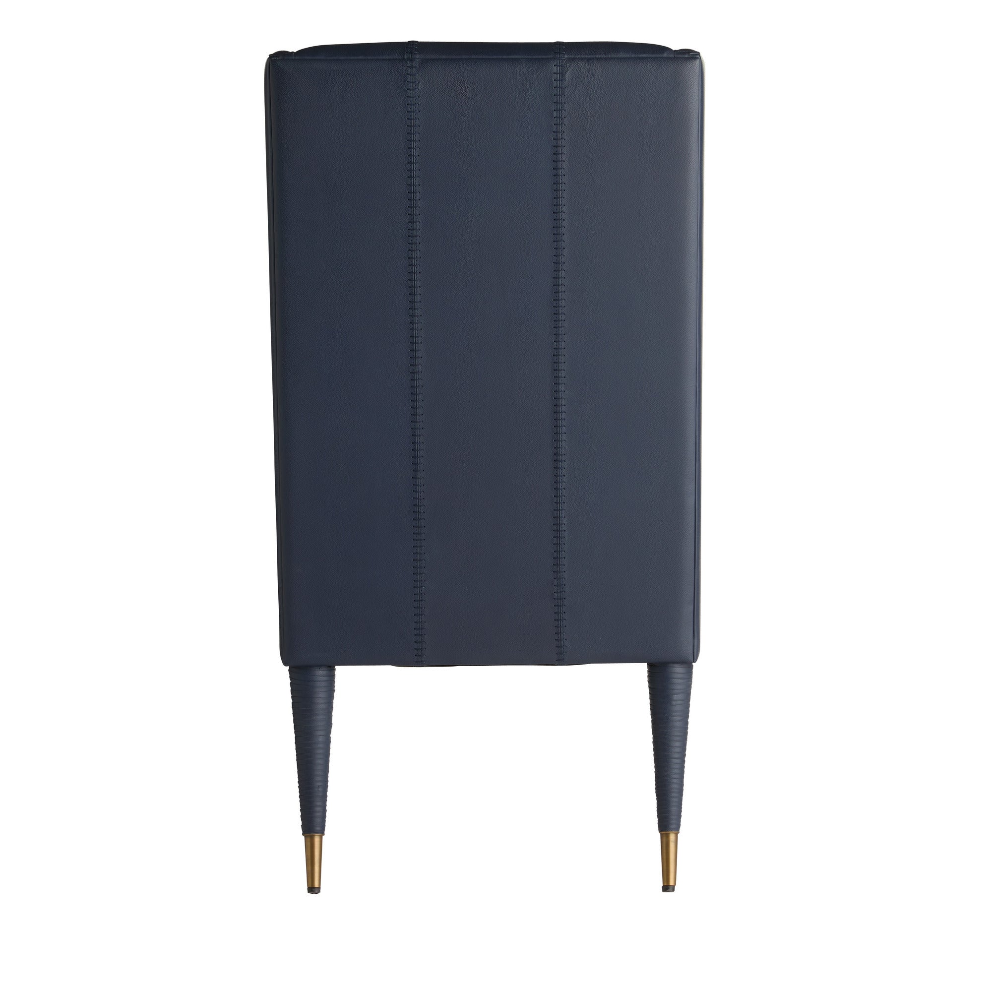 DescriptionPerfectly scaled for a host or hostess chair, this navy leather chair features race strip paneling and defined topstitching. Each exaggerated tapered leg is wrapped in leather cord and tipped with an antique brass ferrule. Stitching continues at the back so this piece can float within the room. Leather will vary.