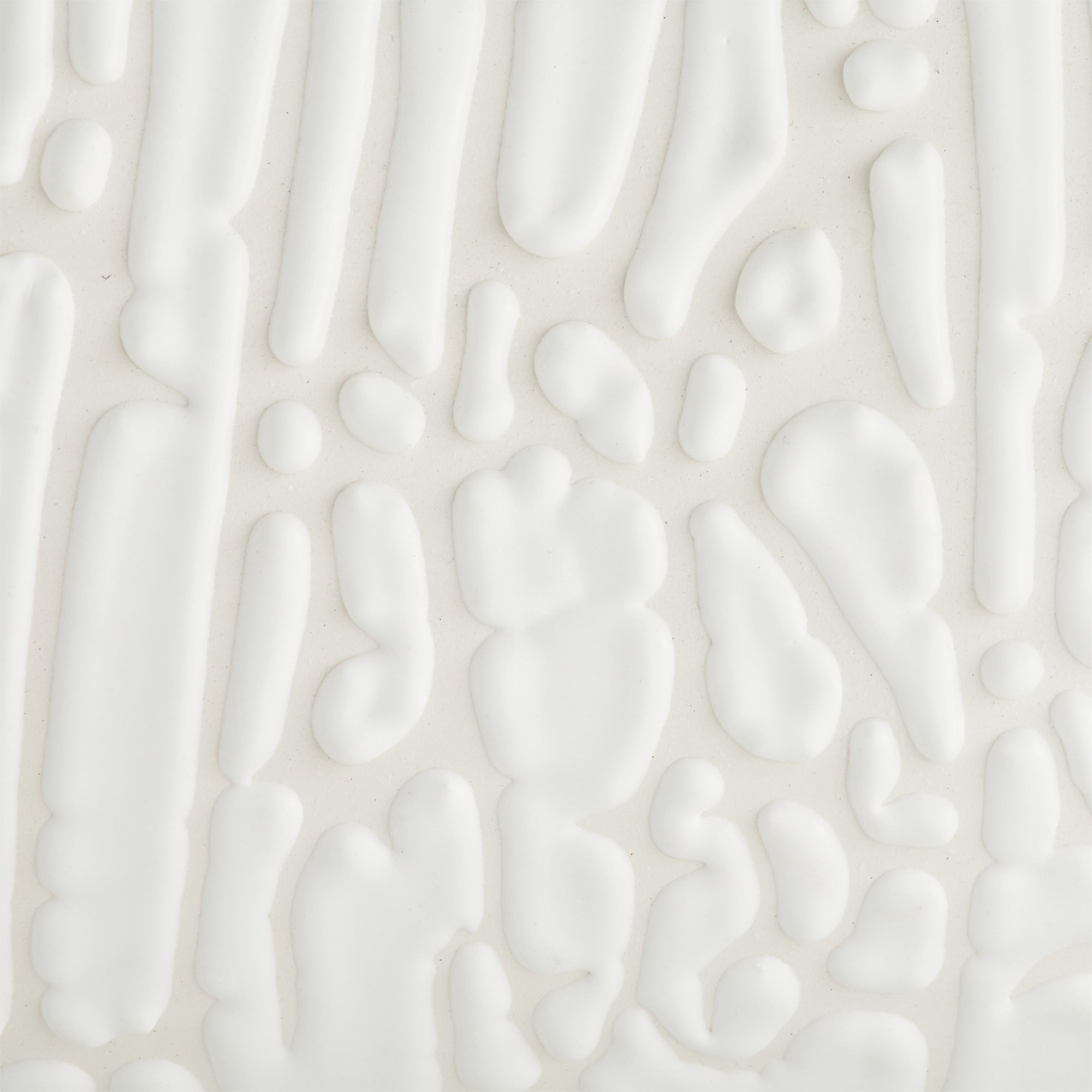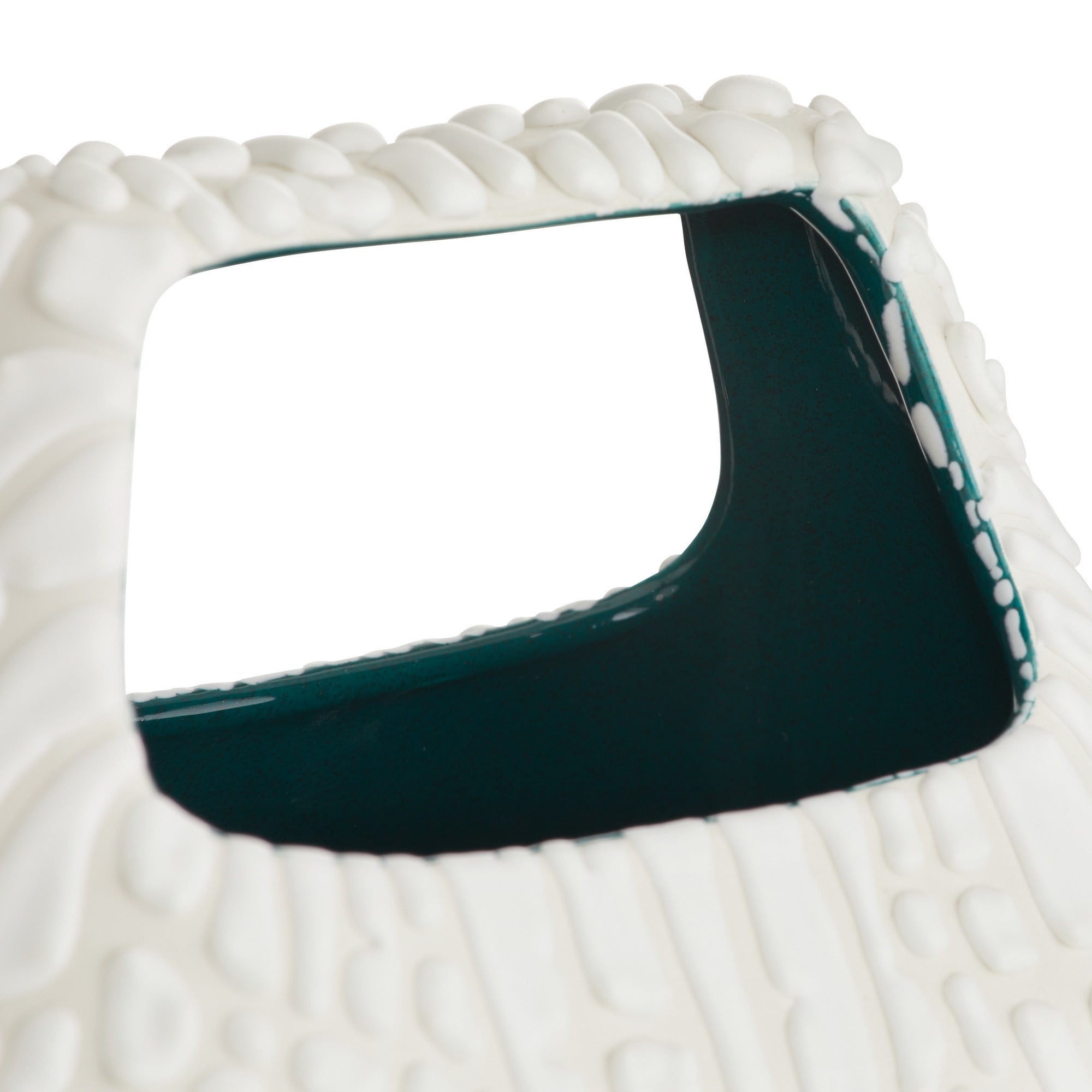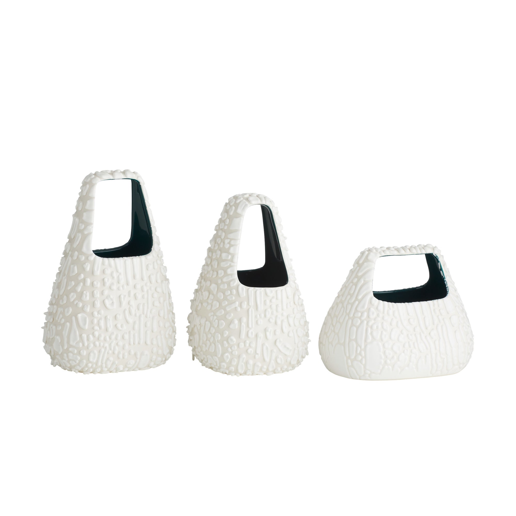 DescriptionA trio of hyper-textured porcelain vases were designed to resemble handbags or baskets, complete with built-in handles. Glazed in a vanilla foam finish, they are finished with a 3-D drip effect on the exterior while the interior is finished in a sea green glaze. Finish will vary.