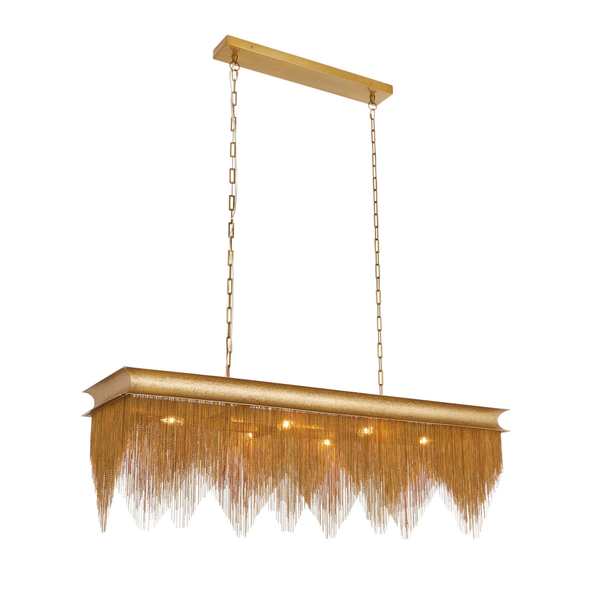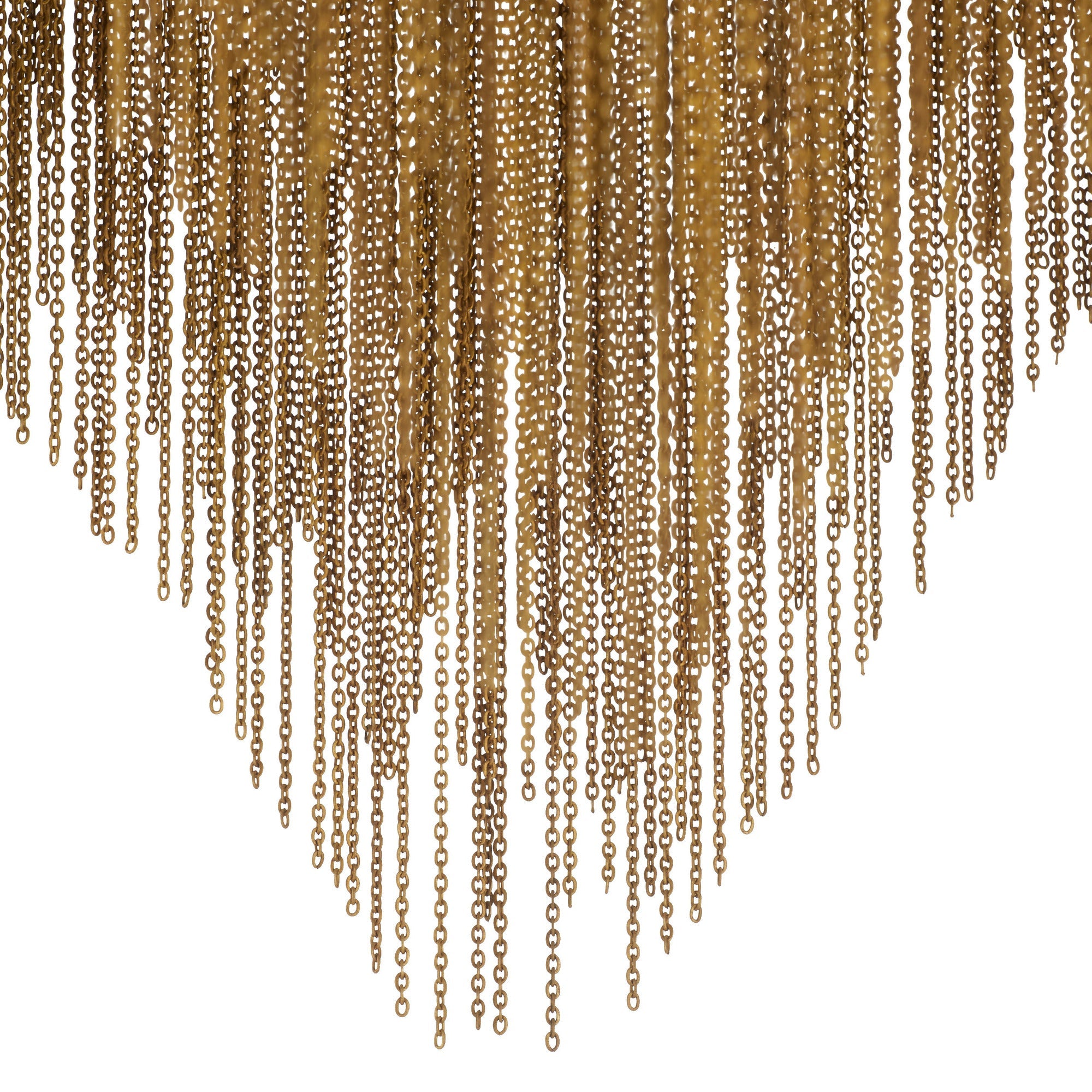 DescriptionThe shapes and textures of Southwest fine jewelry inform a dazzling fixture of vintage brass-plated iron. Zig-zag antique brass chains reminiscent of a lizard's spikes deliver subtle movement and a reflective glimmer. The delicately textured vintage brass iron frame is suspended from the ceiling by dual vintage brass chains. Damp-rated, although limited covered outdoor areas may affect finish.
