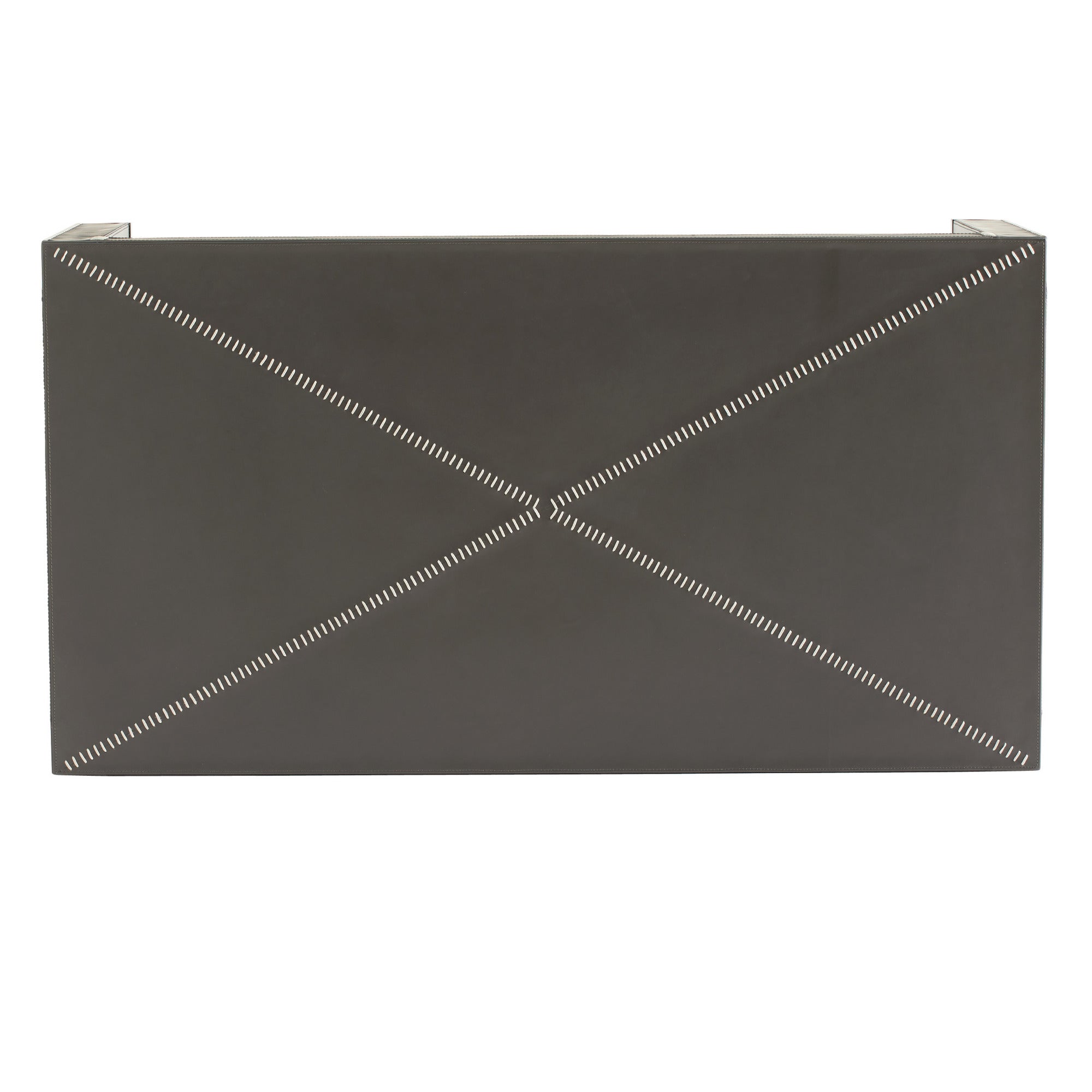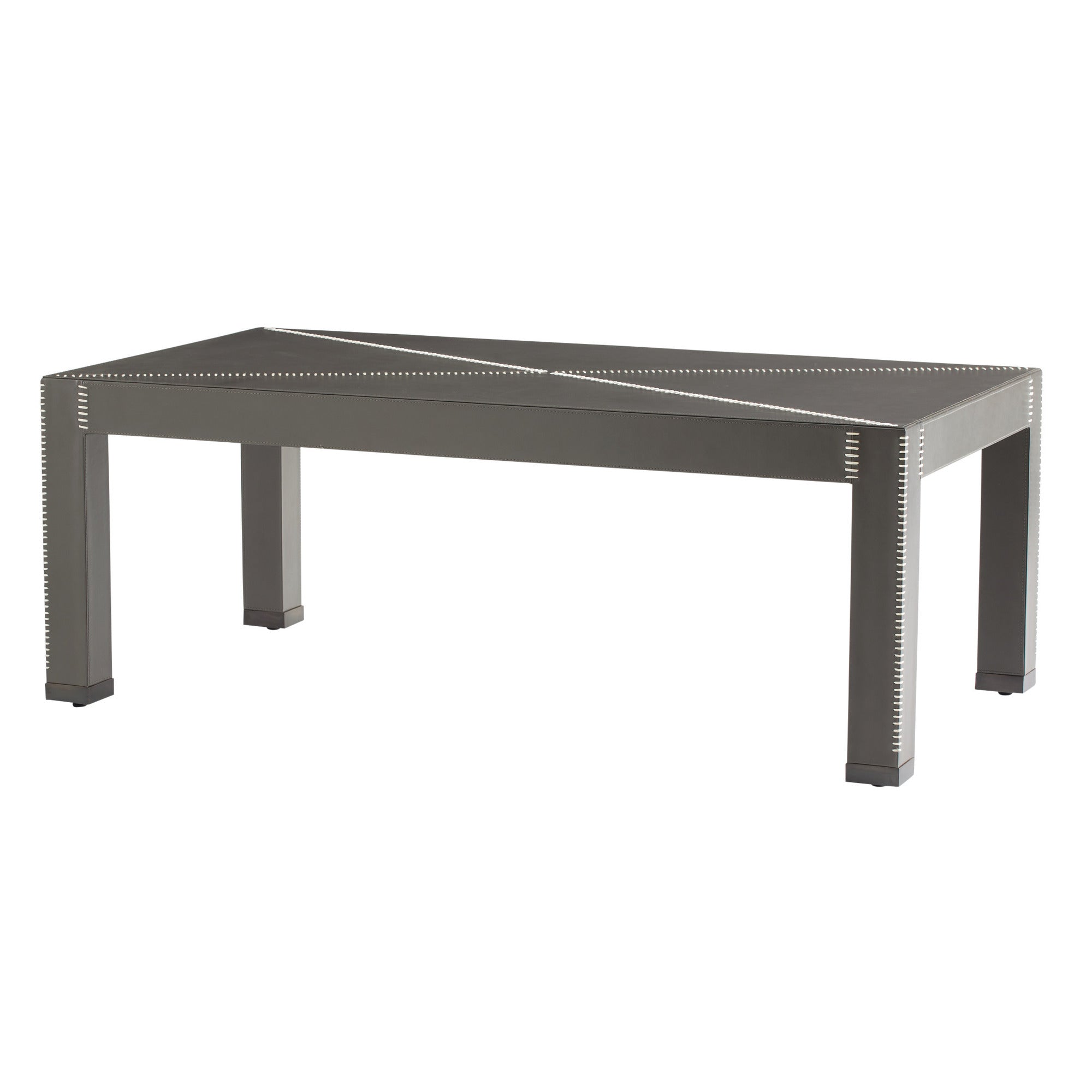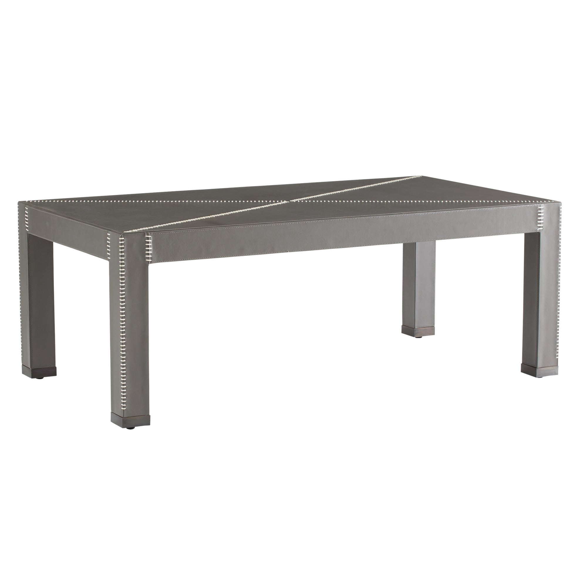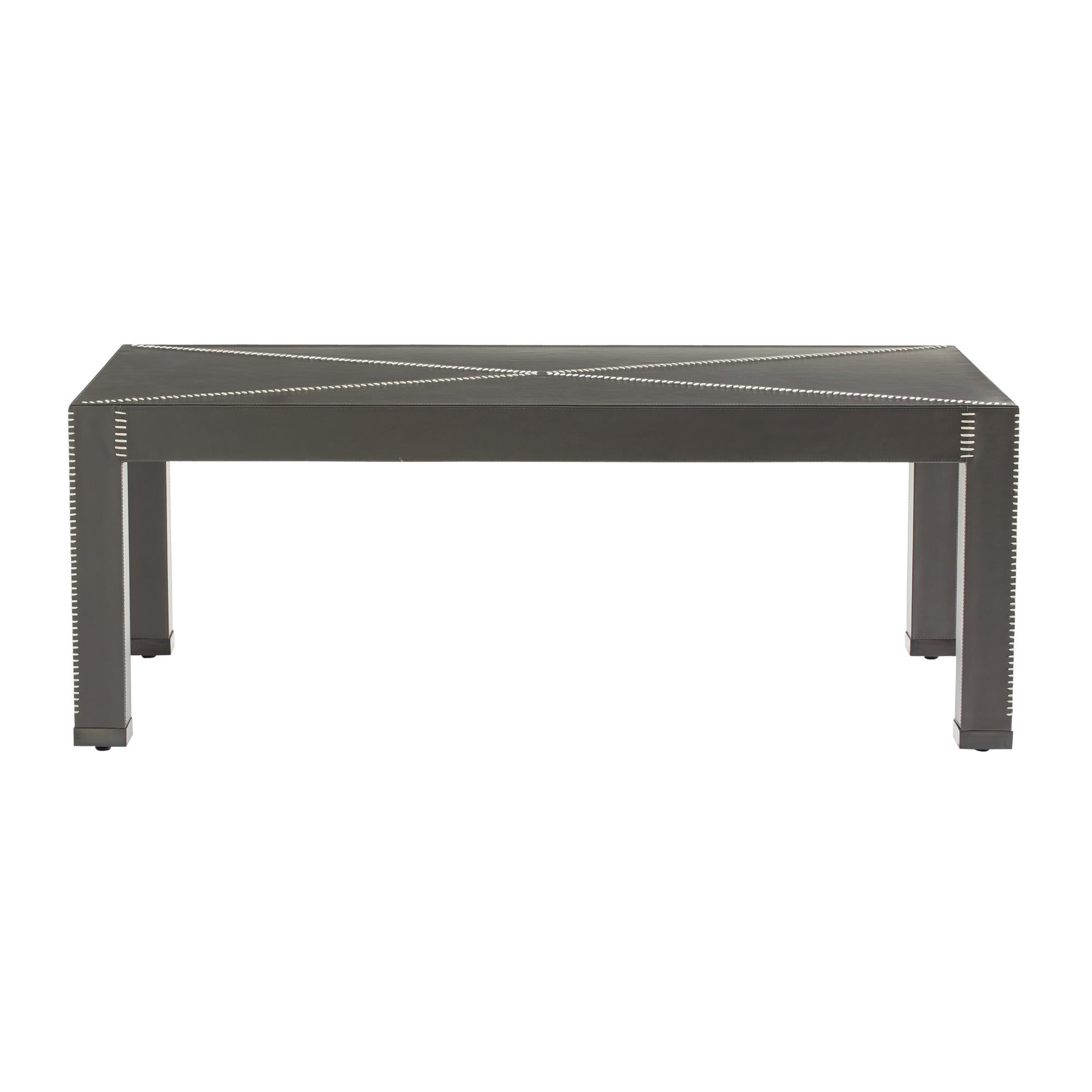 DescriptionA striking graphic X whipstitched detail borrowed from tailoring dresses up the surface of a Parsons-inspired table. Covered from top to blackened bronze-tipped legs in dim gray leather, the Hidalgo's nestable height allows an ottoman or poof to be stashed underneath. Leather will vary.