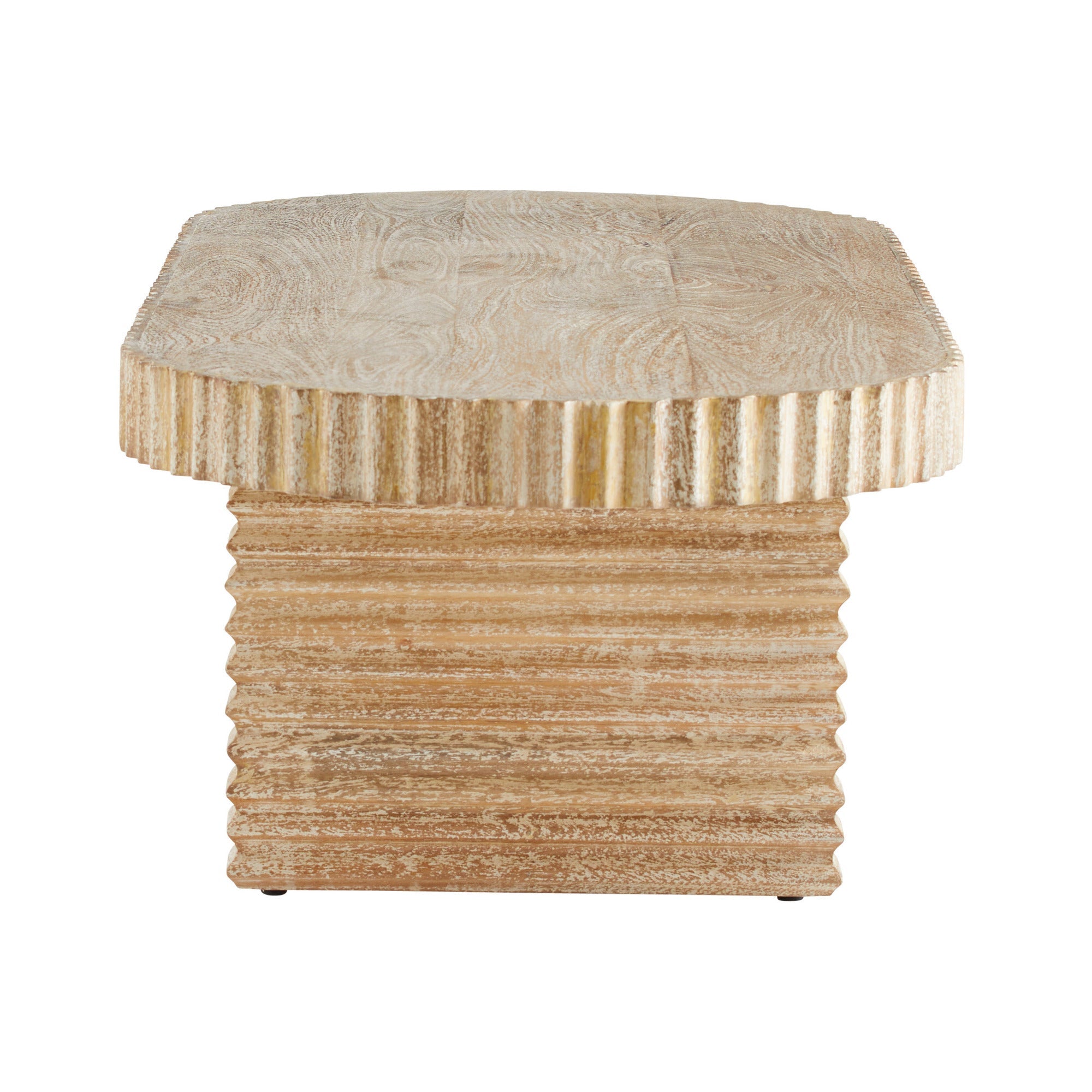 DescriptionAn overscaled slab of limed-wash mango wood is heavily carved and sandblasted to bring out the material's natural texture. Finished with a rhythmic grooved texture on the sides and legs, the pure form of this transitional style allows it to work within any coastal or contemporary setting. A multi-purpose accent piece, the Hilbeck can also serve as a bench. Finish will vary.