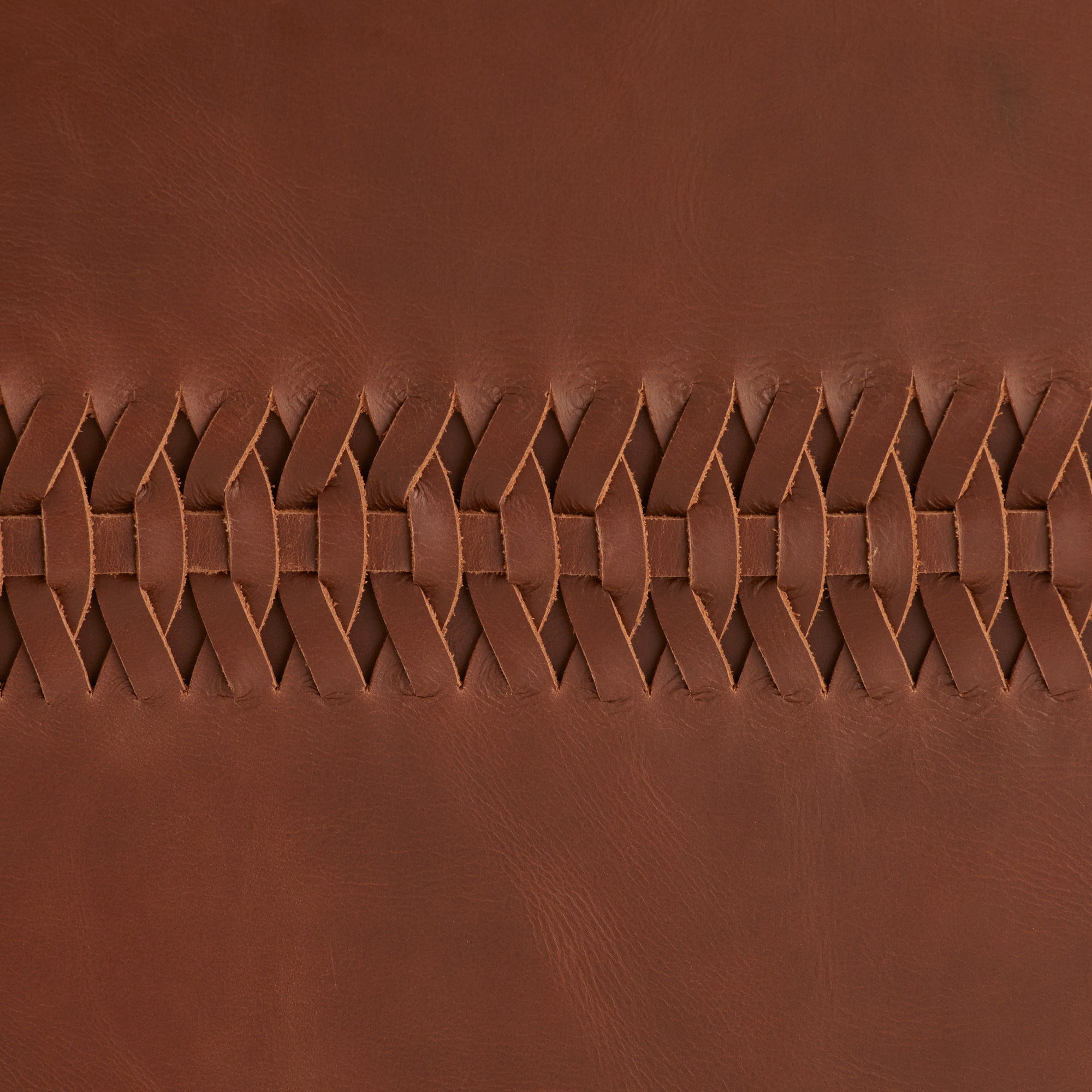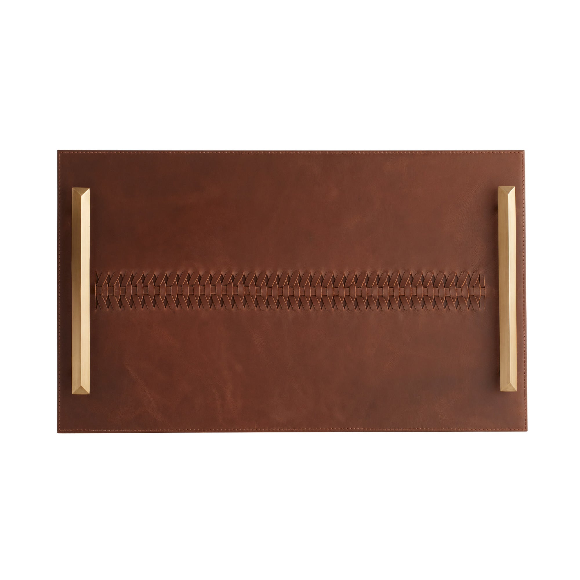 DescriptionA tray of deep russet leather is bisected with a braided fishtail spine, resembling the lacing on a corset. This classically tailored style is accented with sturdy handles at either end of antique brass. Finish will vary.