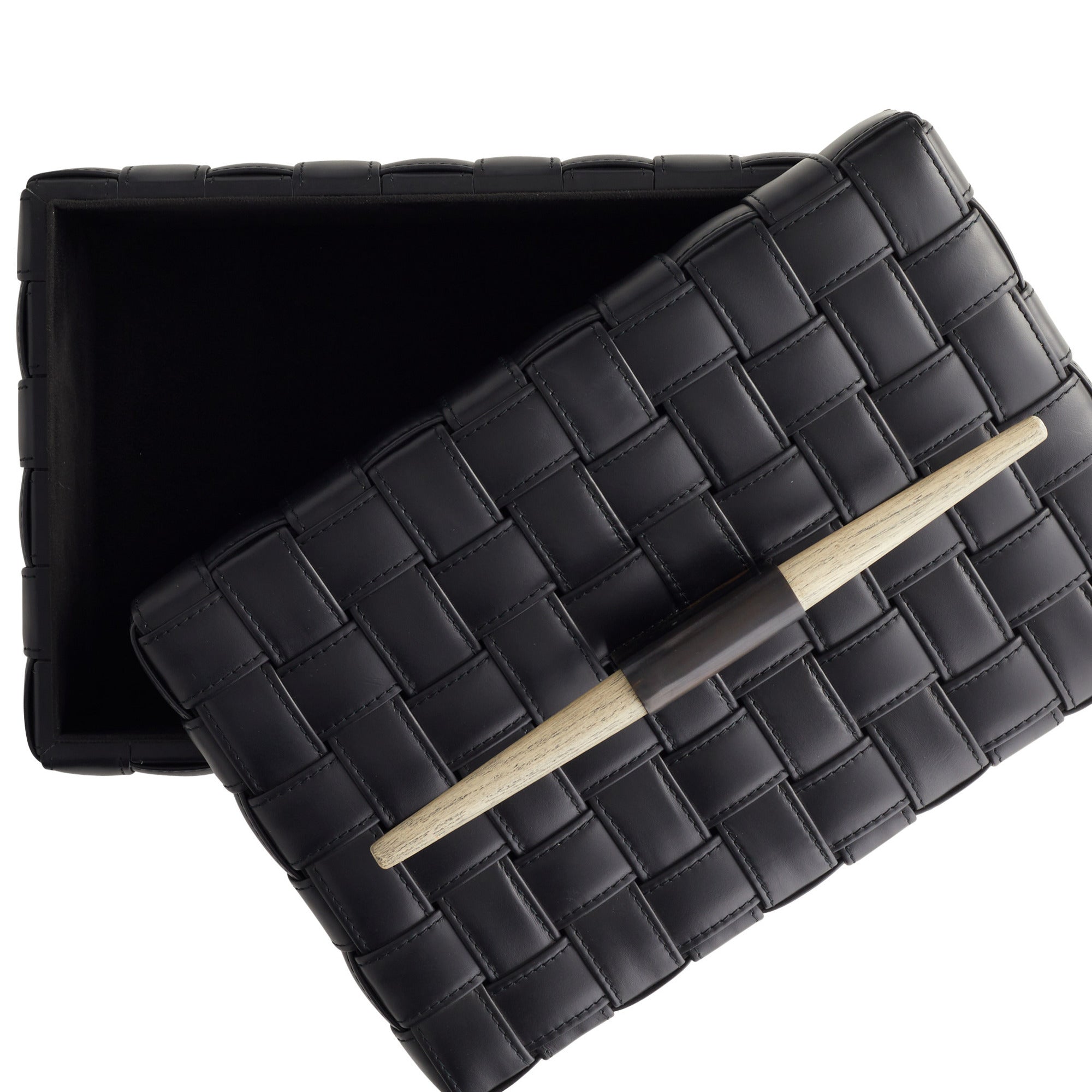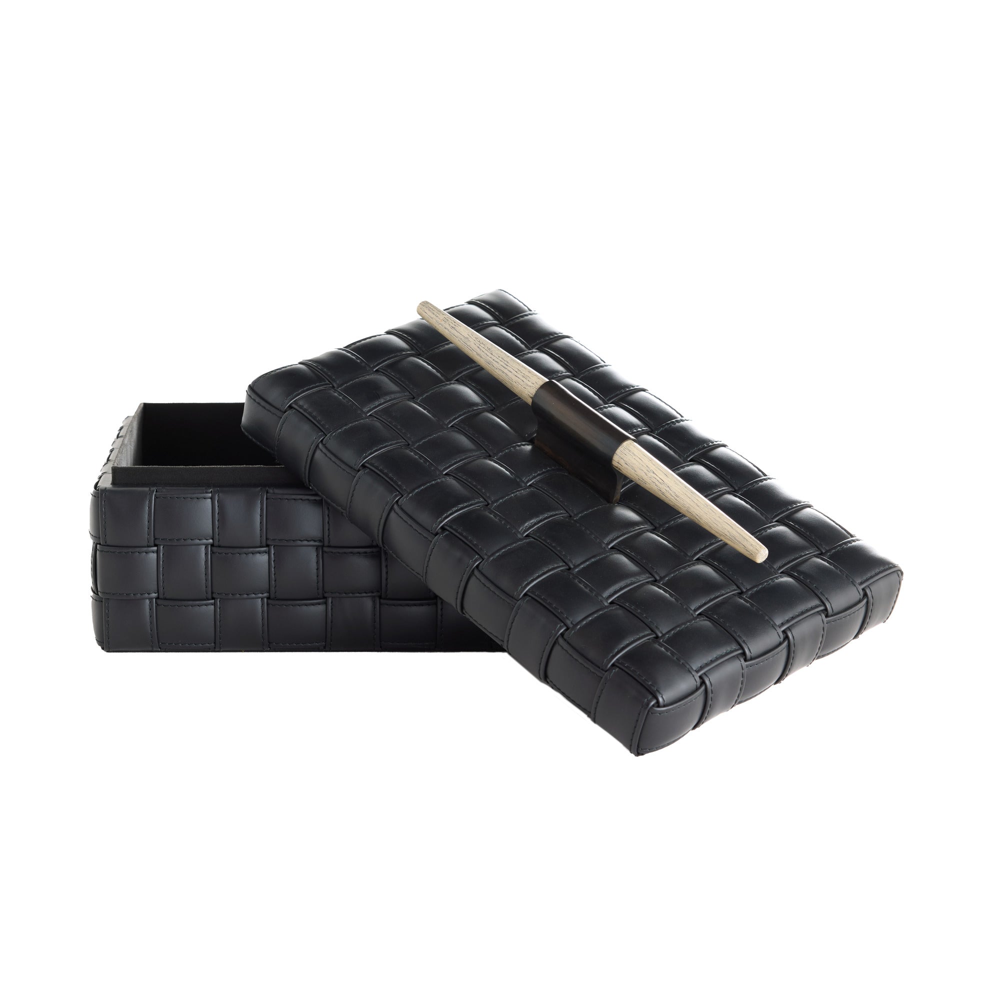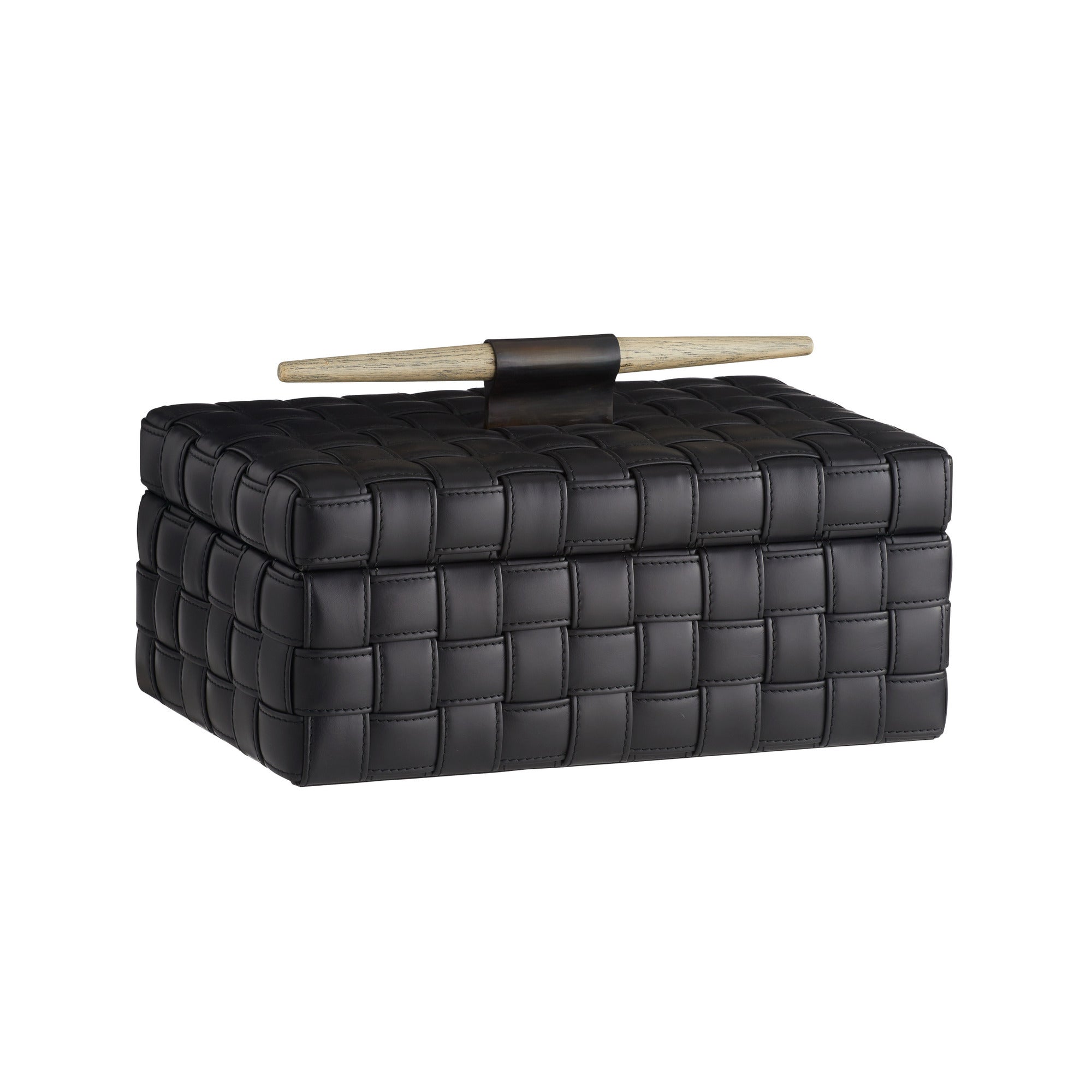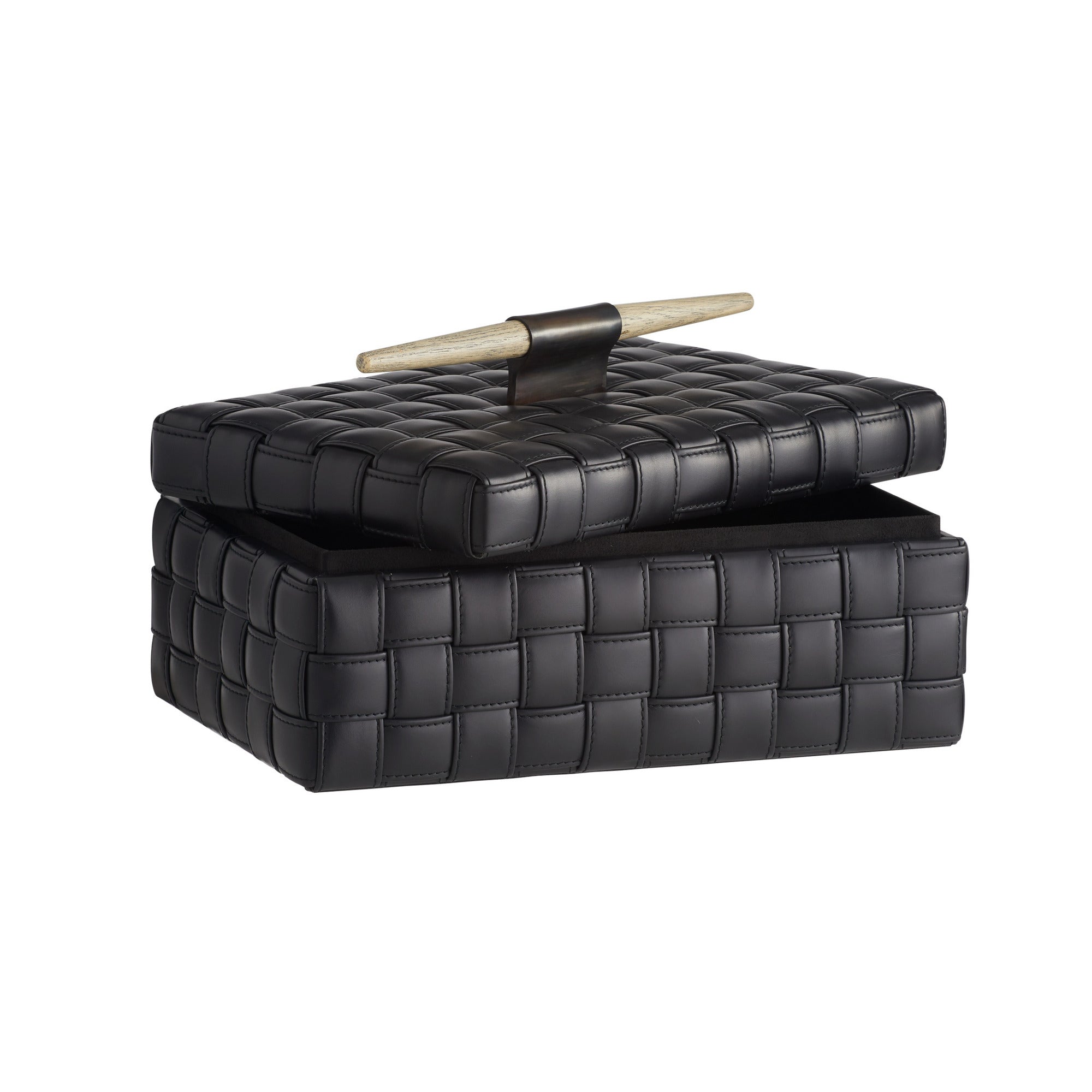 DescriptionOur Humphrey Box is wrapped in a basketweave pattern of topstitched black leather. Accented with a spear-shaped handle of bronze-plated iron and smoke finished beechwood, it lends a masculine accent to a desk or tabletop. Finish will vary.