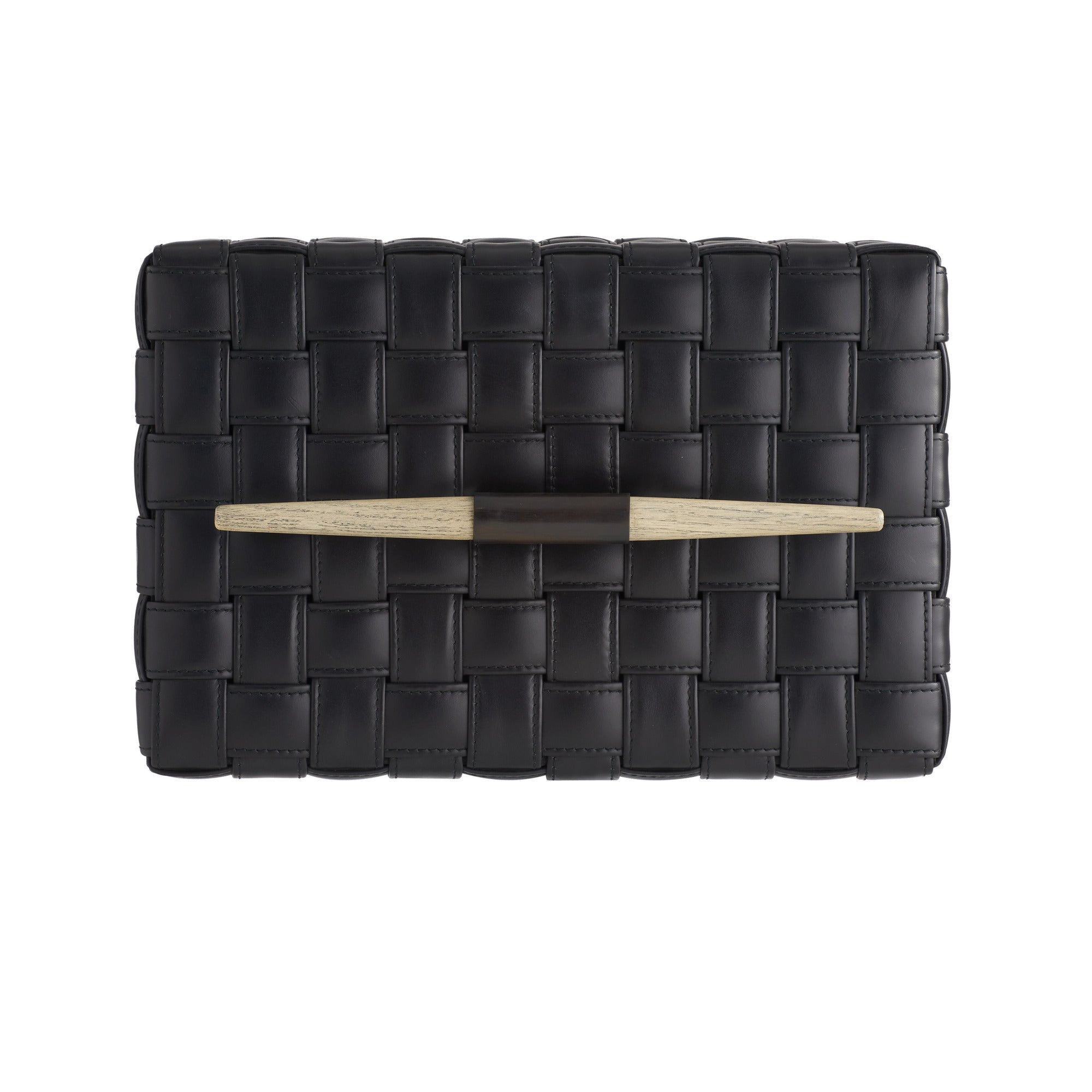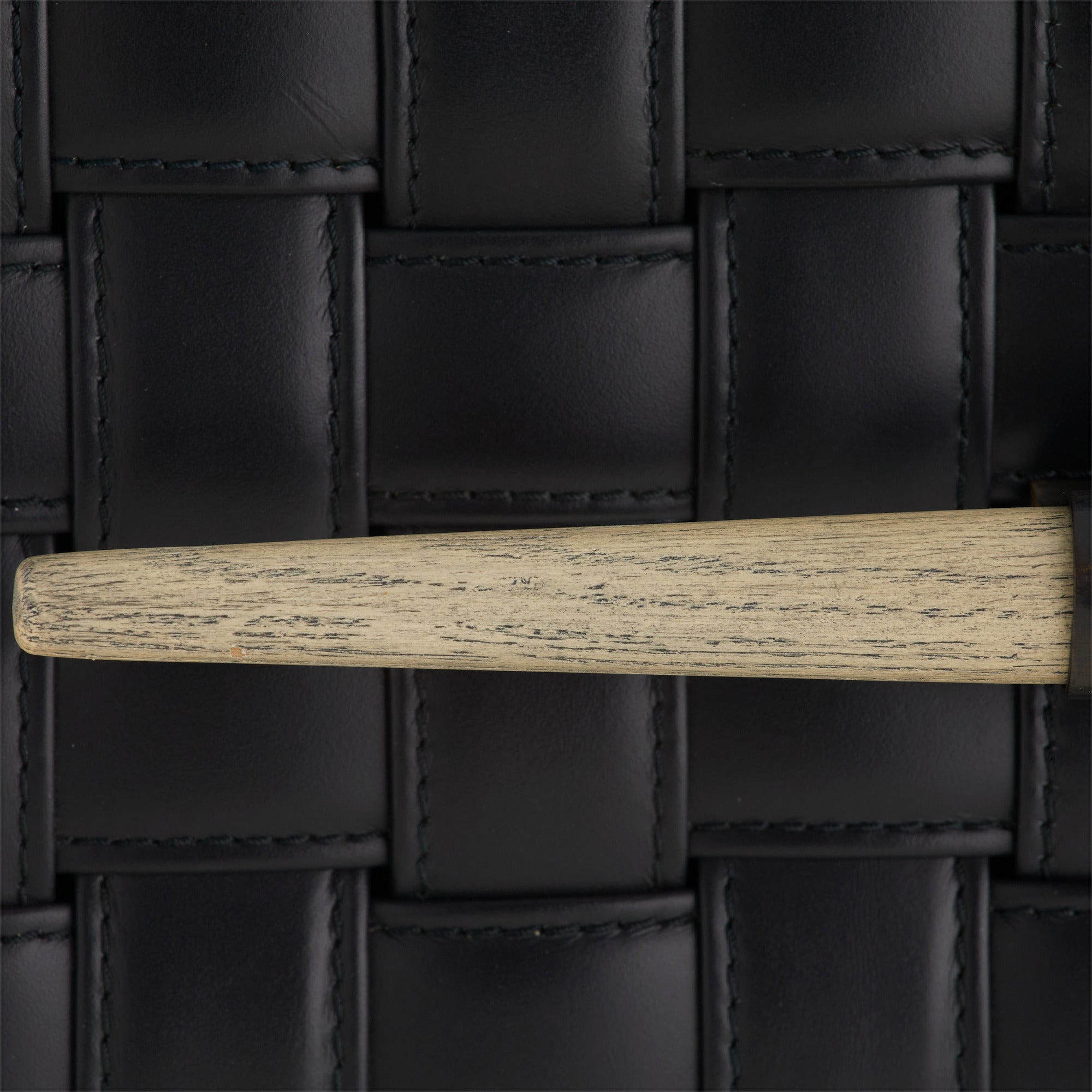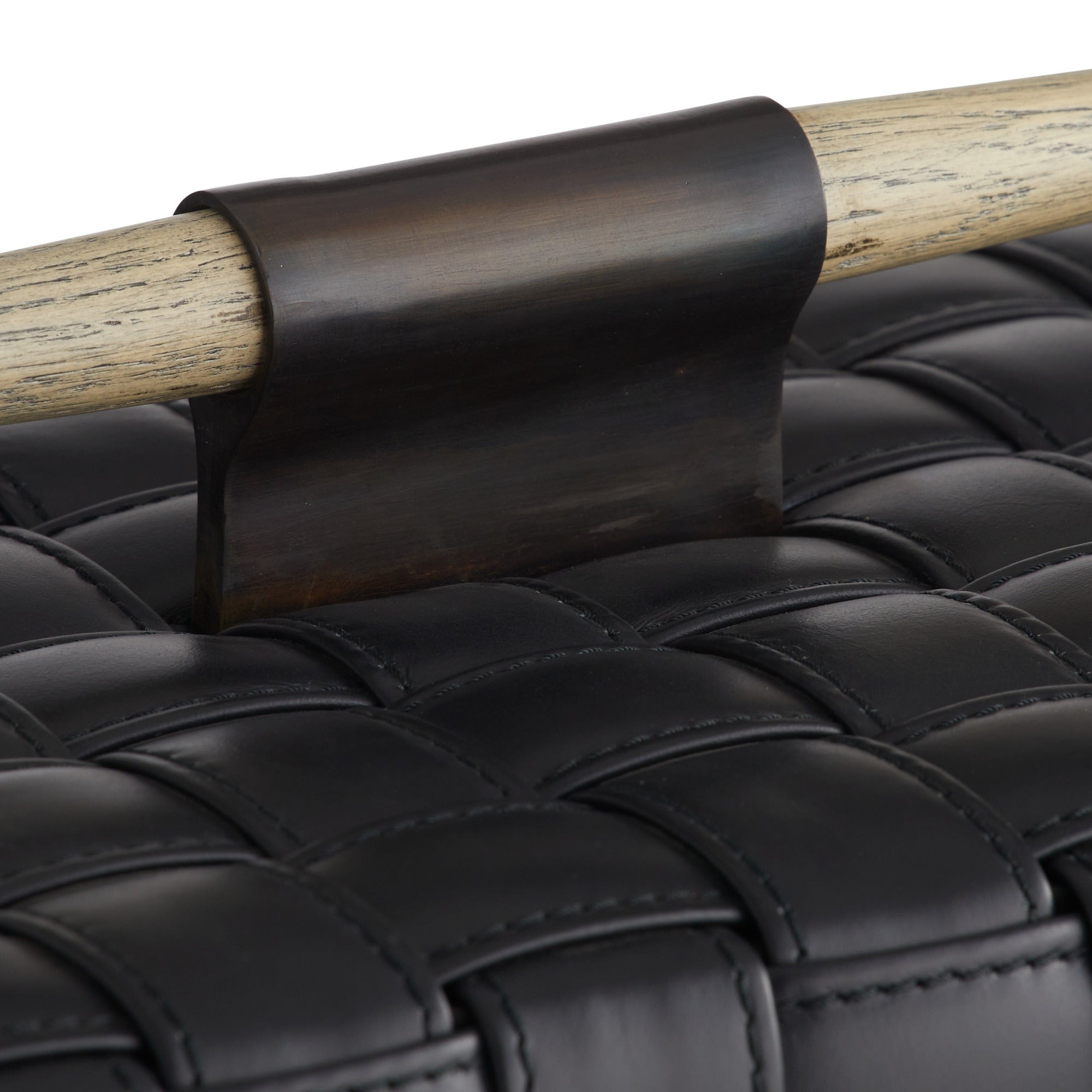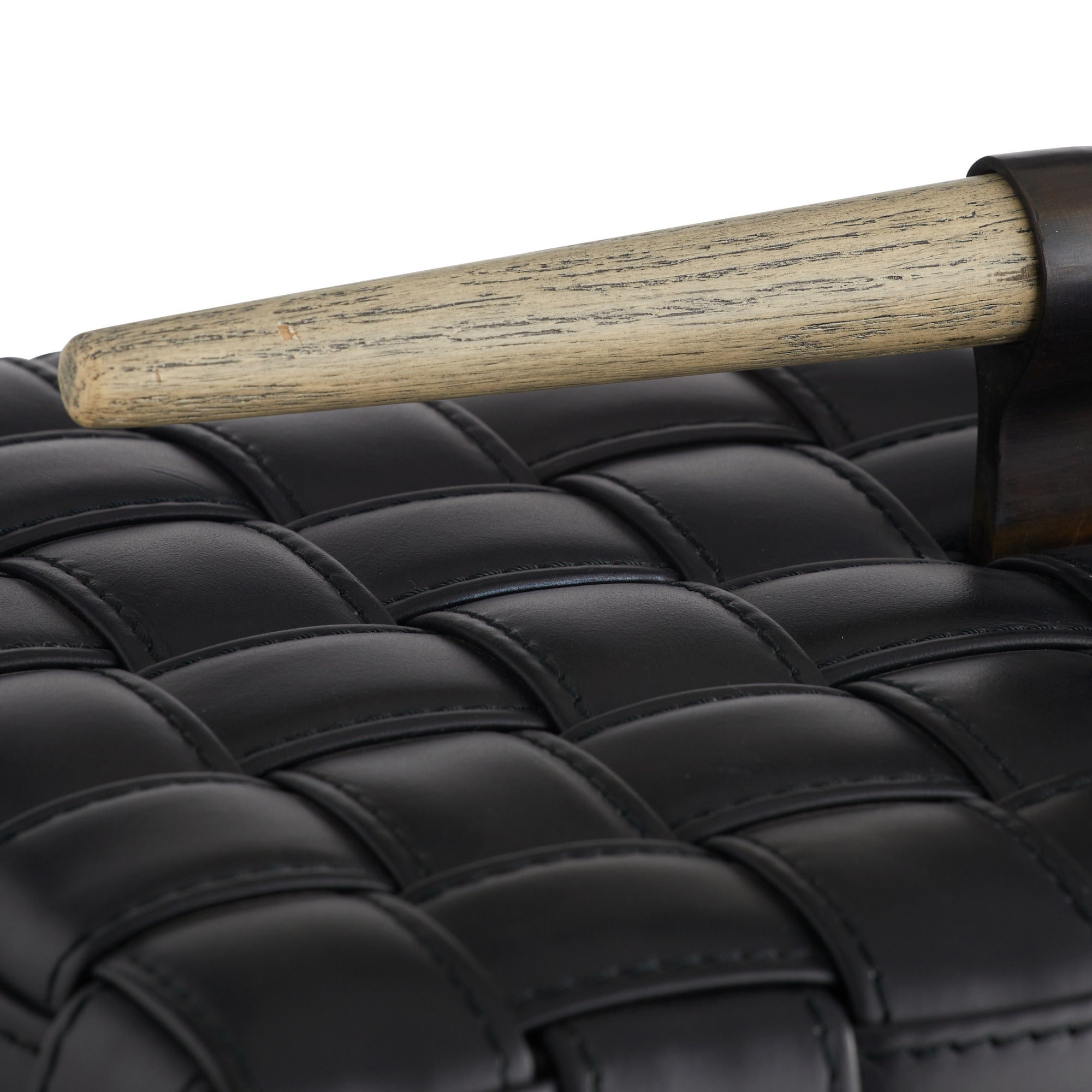 DescriptionOur Humphrey Box is wrapped in a basketweave pattern of topstitched black leather. Accented with a spear-shaped handle of bronze-plated iron and smoke finished beechwood, it lends a masculine accent to a desk or tabletop. Finish will vary.