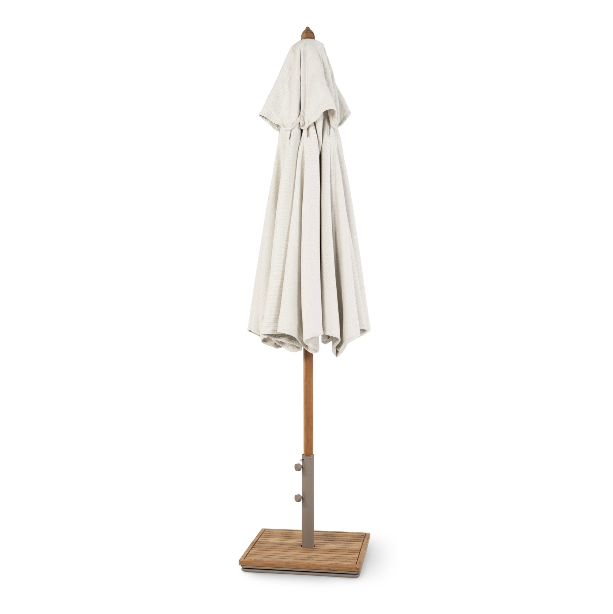 DescriptionUmbrella features a marine-style pulley and rope system, similar to those used for raising sails, allowing a smooth, low-effort opening and closing operation with a vented top to reduce wind resistance. Body crafted of solid marine-grade teak wood known for its durability, weather resistance, and natural golden brown finish, which over time and exposure to the elements will gracefully change to a silver patina, distinguishing fine aged outdoor teak. The umbrella is complete with a heavy-duty, powder-coated metal base with a slatted teak wood cover and includes optional locking casters for ease of movement. Upholstery requires a special COM fabric that is either awning-grade or furniture-grade acrylic and has a weight of 200 grams per square meter or above.