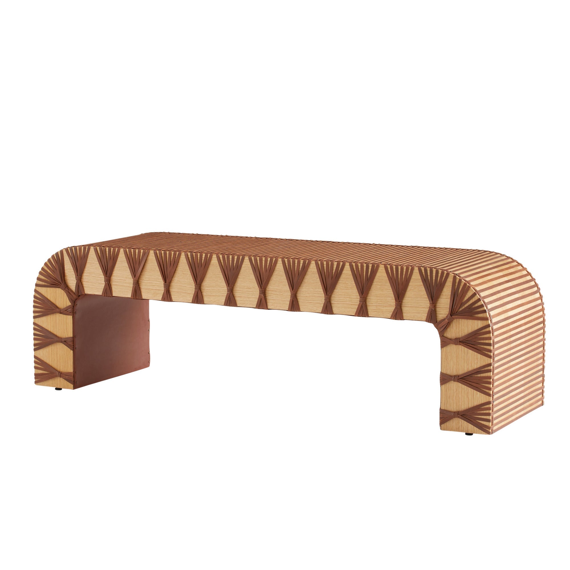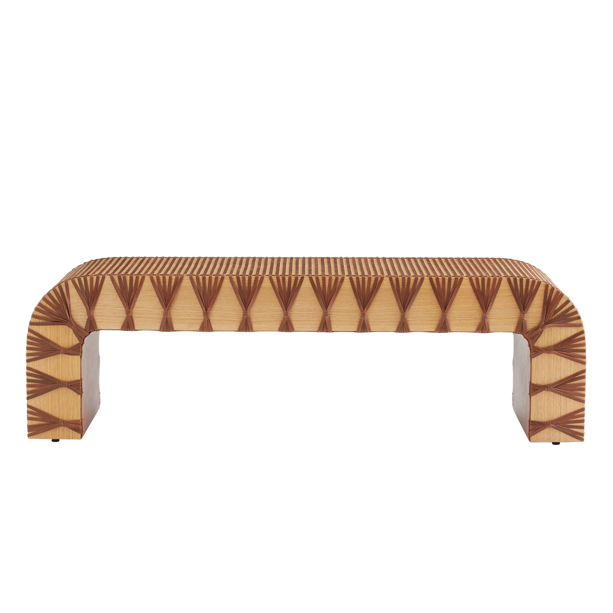 DescriptionStrands of leather in a deep russet hue are intricately woven around a waterfall bench of natural oak wood. Inspired by a braided horse's mane, the rhythmic pattern is repeated along each side and secured with antique brass nail heads. The underside of this stylish bench is clad in matching leather. Leather will vary.