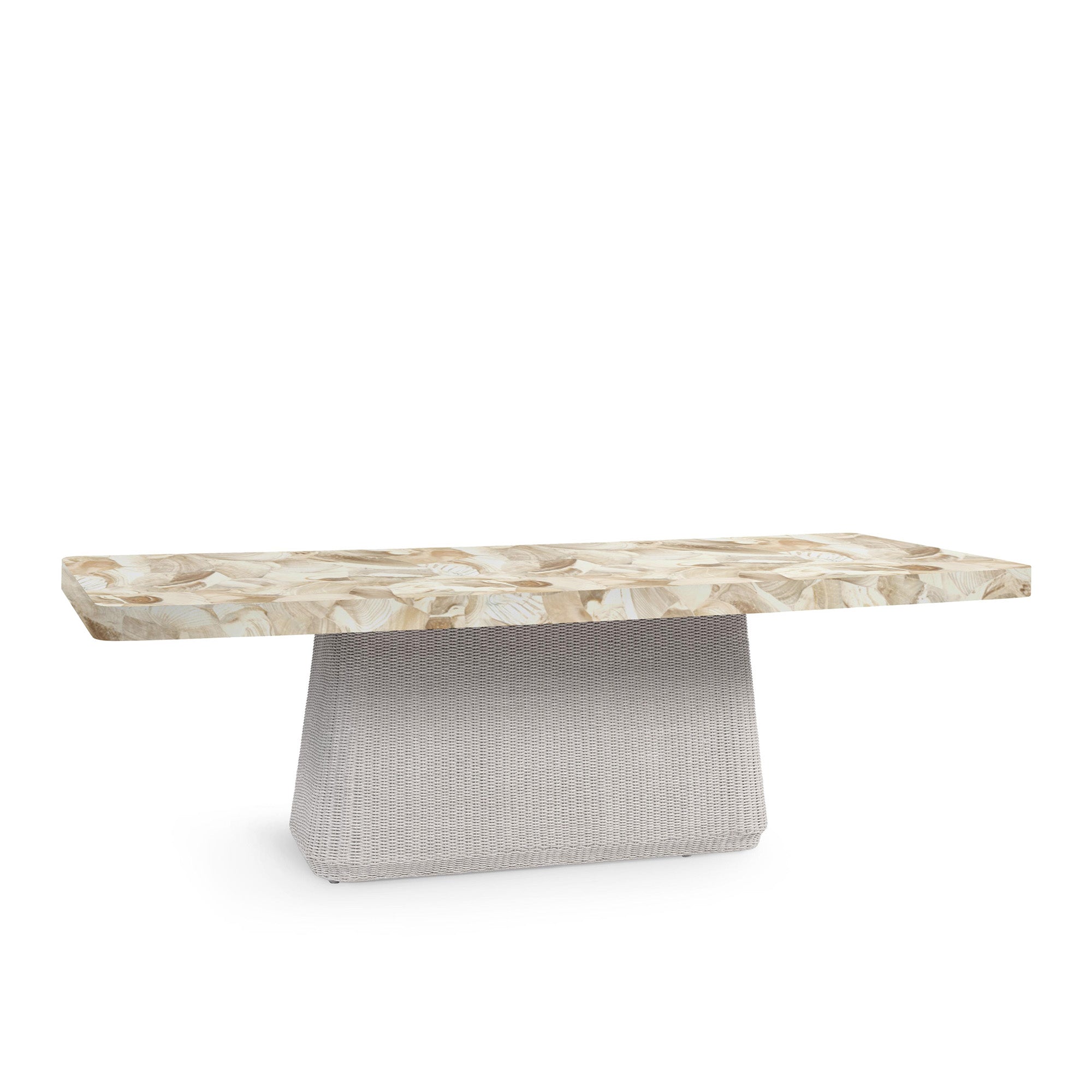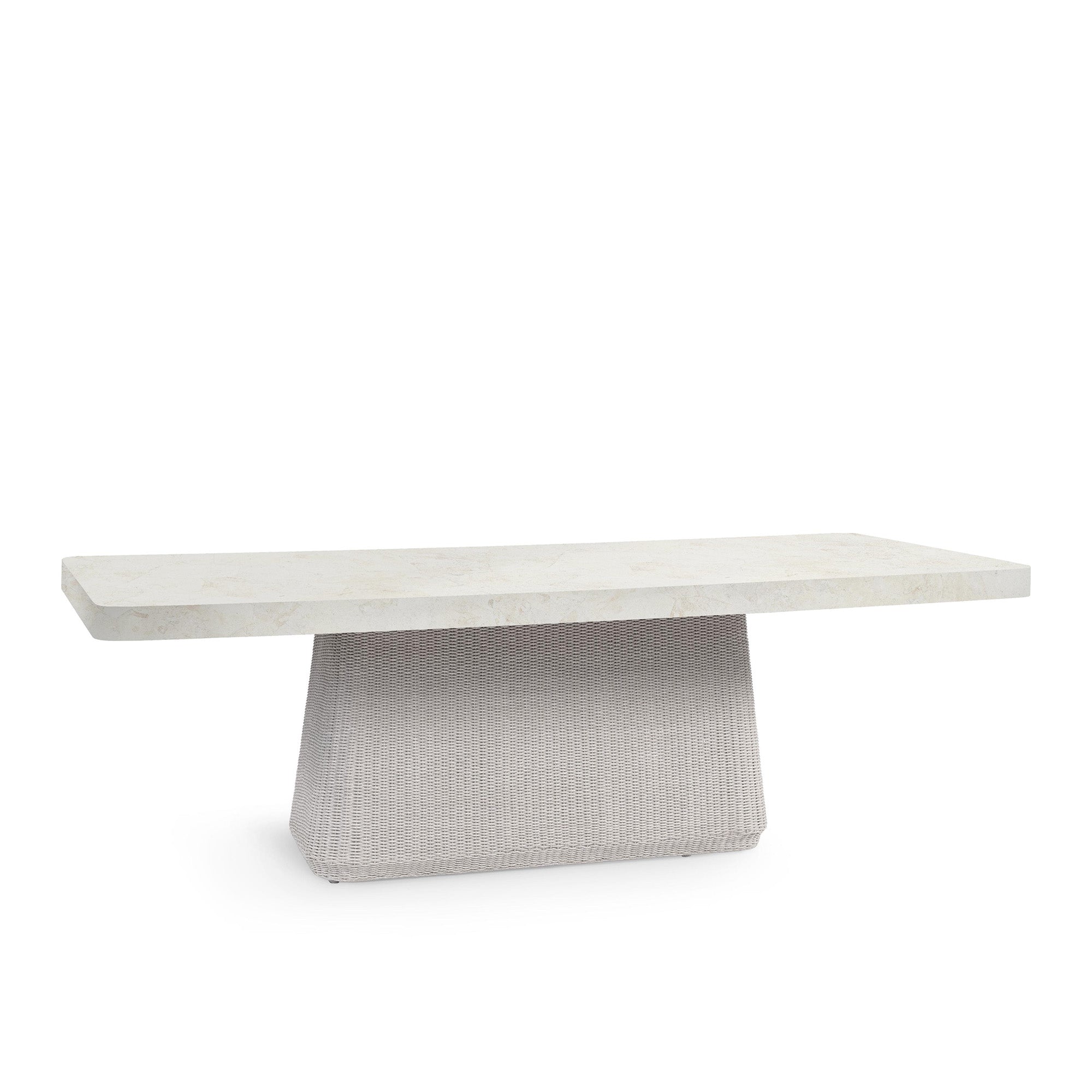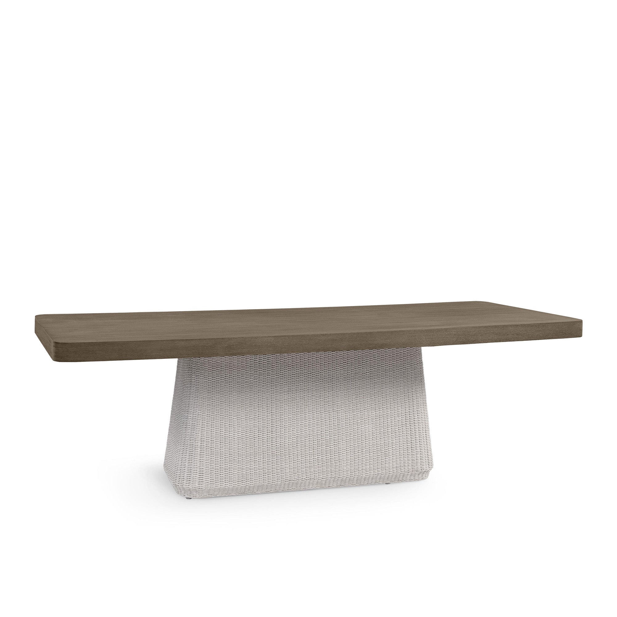 DescriptionPALECEK Studio Collection. Table base features a warm grey synthetic rope hand-twisted and woven in a basket weave design over a powder coated metal frame. Tabletop is fully customizable, select the size and material that perfectly fits your style and needs. Create a fully outdoor suitable table with a top made of fossilized clam, teak wood, white agate or quadra teak stone in a sand or earth tone. Or combine with a wood top available in any PALECEK finish, making the table for indoor use only.