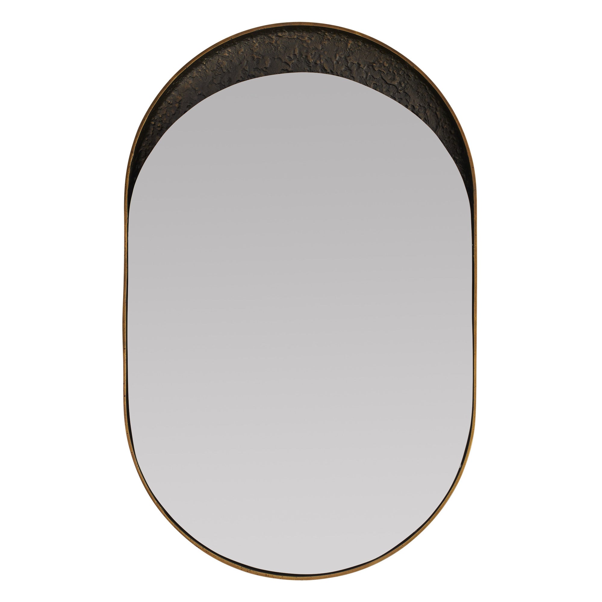 DescriptionPlaying with the concept of filled and unfilled forms, the Inset wall mirror's smooth glossy surface is set within a deeply textured, bronze-plated aluminum form as if it were being poured into a void. The offset, antique brass plated aluminum pill shaped elements create a sense of sliding motion, making the mirror a uniquely modern, dynamic choice for interiors of all kinds. The Inset mirror can be hung vertically or horizontally to create unique compositions. Finished with a cleat at the back for security. Finish will vary.