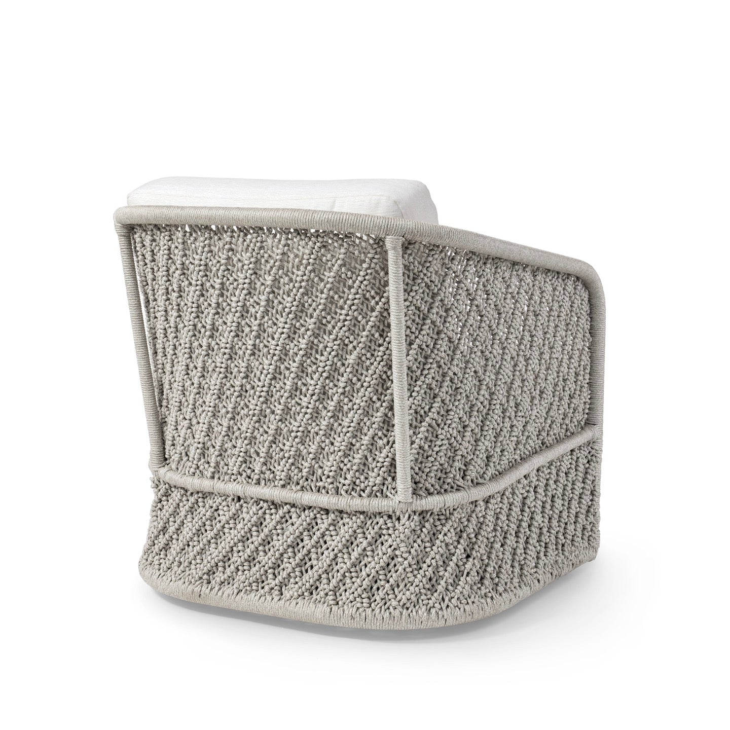 DescriptionAll-weather UV protected synthetic rope in a warm grey finish hand-wrapped around a powder coated aluminum frame. Rope is resistant to cracking, peeling, fading and breaking. Chair comes with loose seat and back cushions.