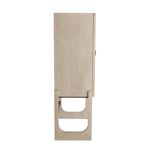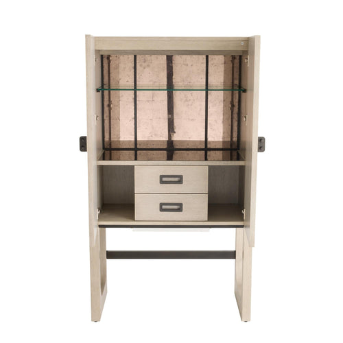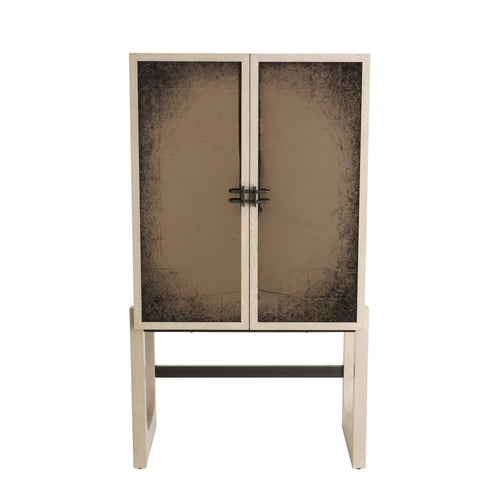DescriptionOur alluring cabinet is inlaid with an e´glomise´ antiqued amber mirror front to appear darker along the edges and lighter at the center. The elevated case of smoke oak wood features a U-shaped cutout at the legs to add an airy finish. Double spear pulls of bronze iron appear to pierce the surface, while a matching iron bar at the back pulls the silhouette together. Double soft-close doors open to reveal an LED-lit clear glass prep surface and mirrored interior to showcase a chic cocktail glassware collection. Finish will vary.