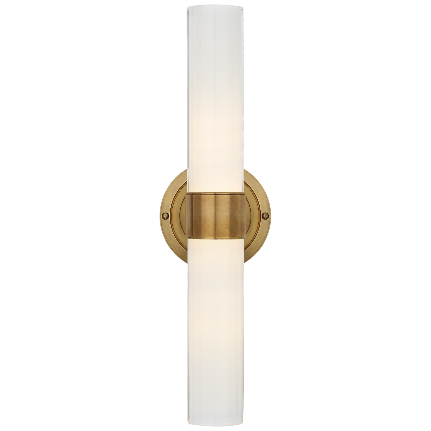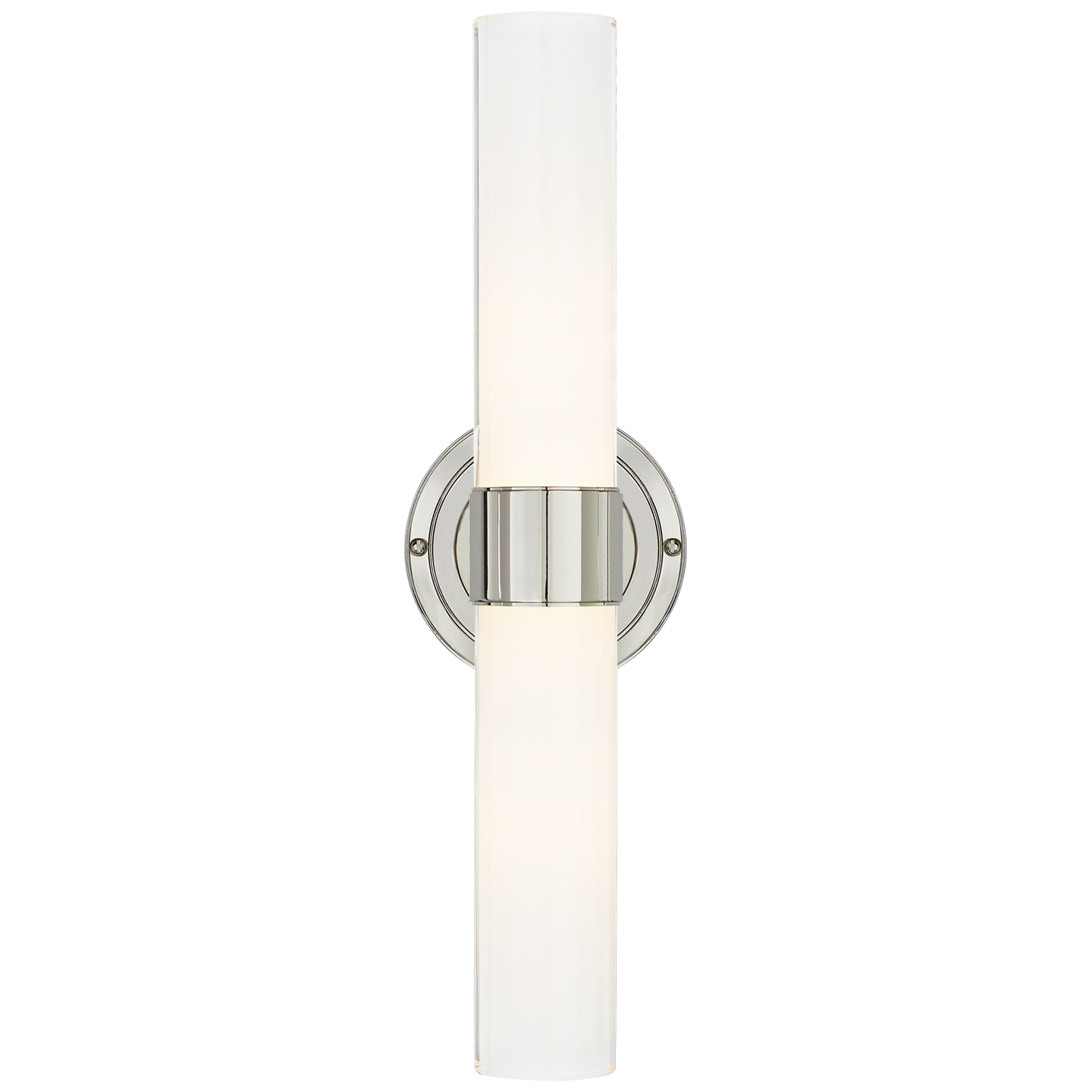 Inspired by a classic Ralph Lauren wristwatch, the Jones offers an elegant silhouette. Single or double white glass cylinders extend from a natural brass or polished nickel bezel, softly illuminating bathrooms in pairs or multiples.