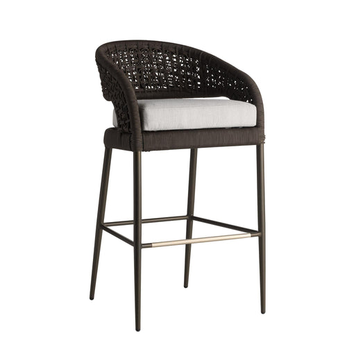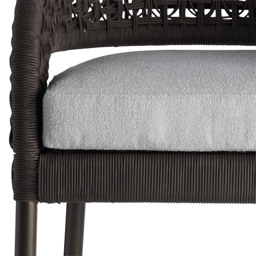 DescriptionWe reinvented the traditional mid-century barrel chair in charcoal brown synthetic rope to survive the elements. Woven in an organic sculptural style, the wicker-type weave of the Juri’s curved back juxtaposes a sleek frame of dark gray powder-coated aluminum and a padded cushion of porpoise outdoor performance boucle´. Accented with a stainless-steel footrest caps. Also available as a chair and counter stool.