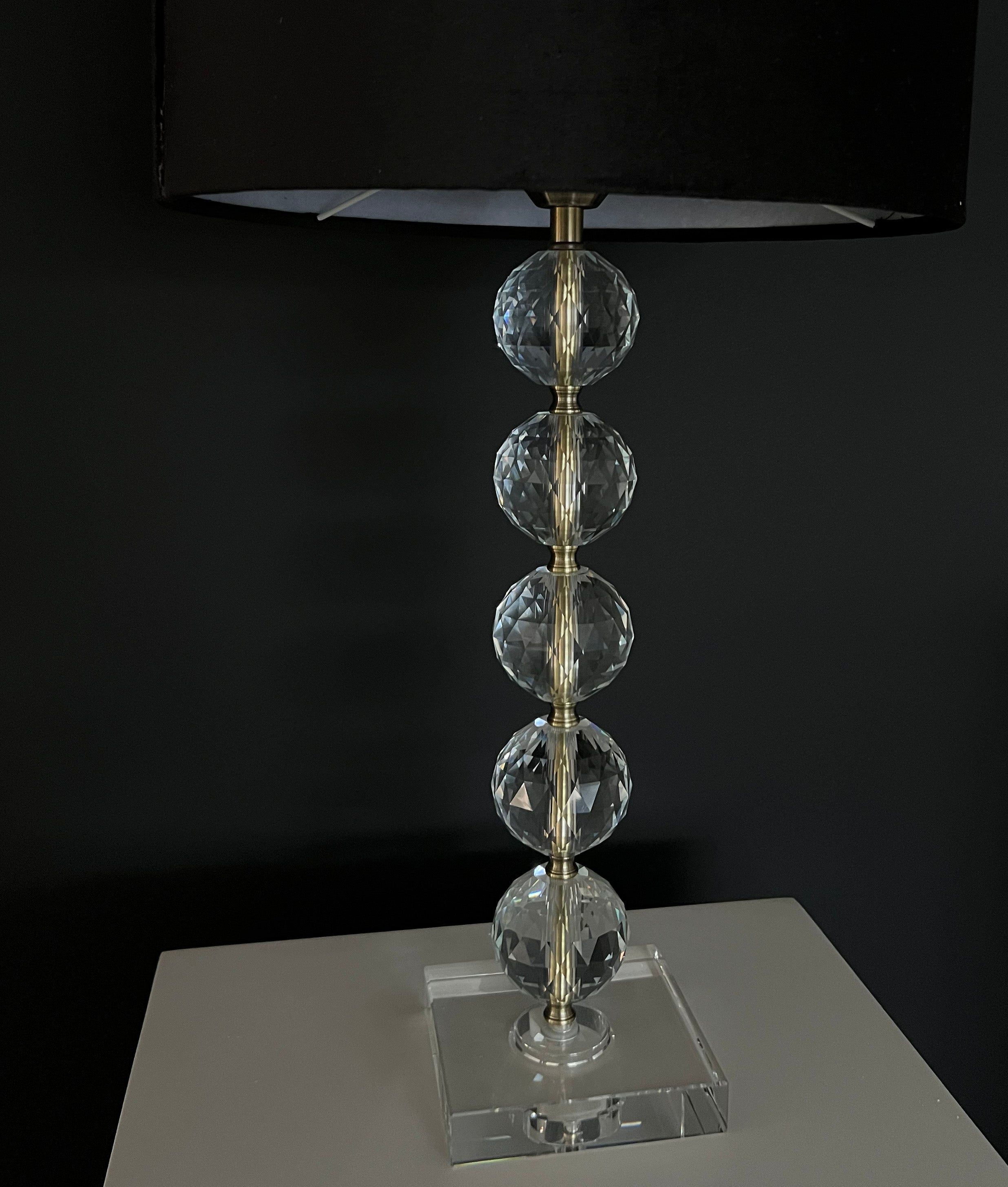 Elevate your interior with the Krista Crystal Table Lamp, a striking fusion of elegance and artistry. This sophisticated piece features a stacked crystal ball base that catches and refracts light beautifully, creating an enchanting ambiance in any room. Paired with a luxurious black velvet lampshade, it delivers both refined aesthetics and warm, diffused illumination.