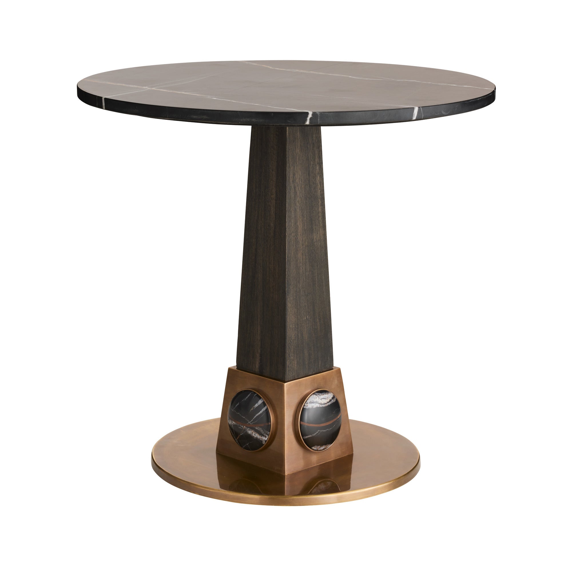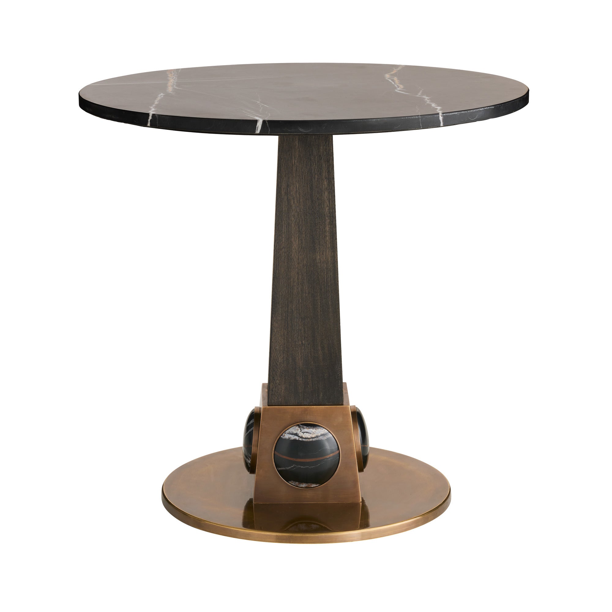 DescriptionGlamorous from top to base, wire-brushed mango wood end table finished in ebony harkens back to the Art Deco era. The antique brass base, inset with oval cabochons of Bengal marble, adds a jewel-like accent to this pedestal-style piece. Finish will vary.
