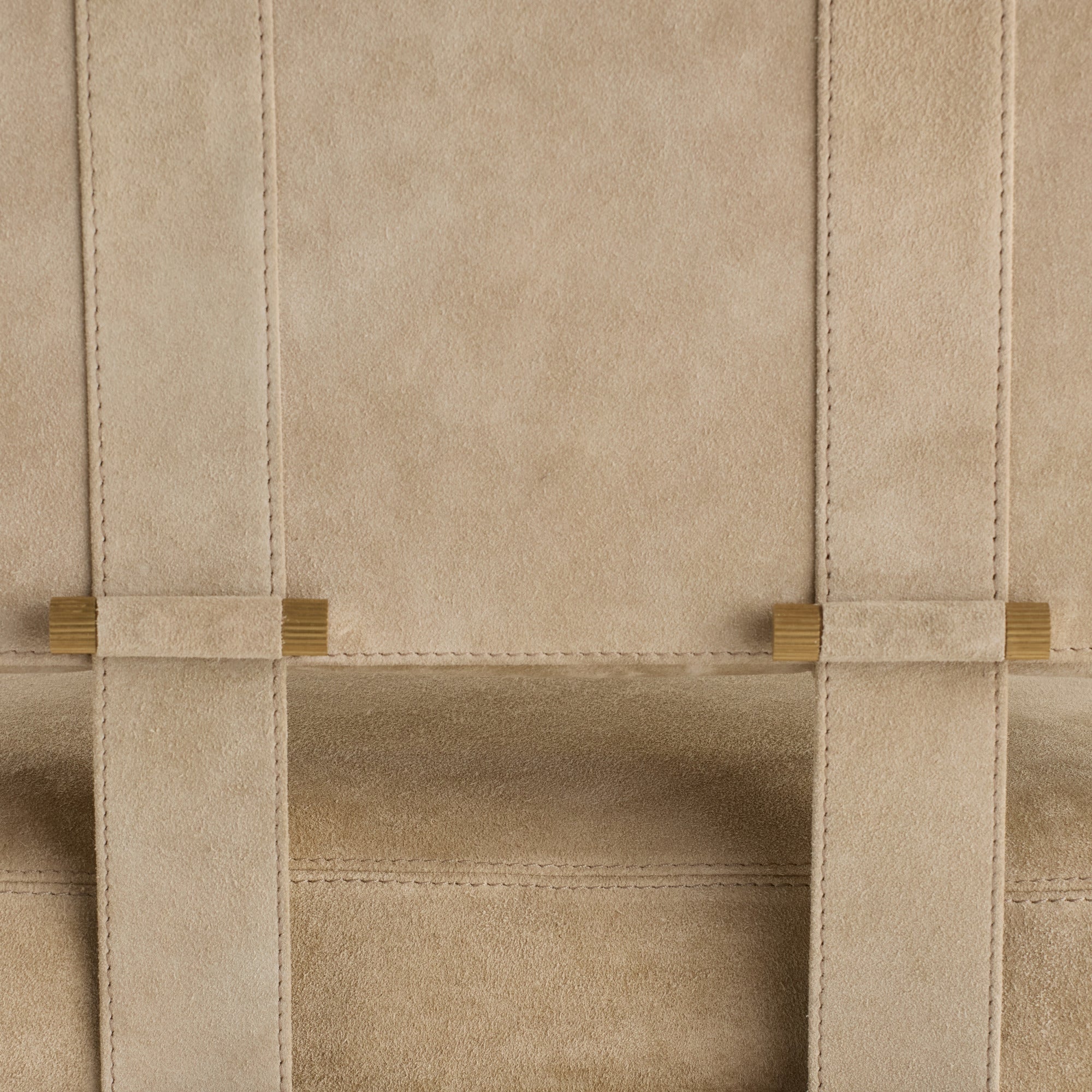 DescriptionA stable seat with a slim frame of antique brass and dual cushions of soft taupe suede on the seat and back, this bar stool is eye-catching from every angle. Suede details cascade and clasp down the back. Suede will vary.