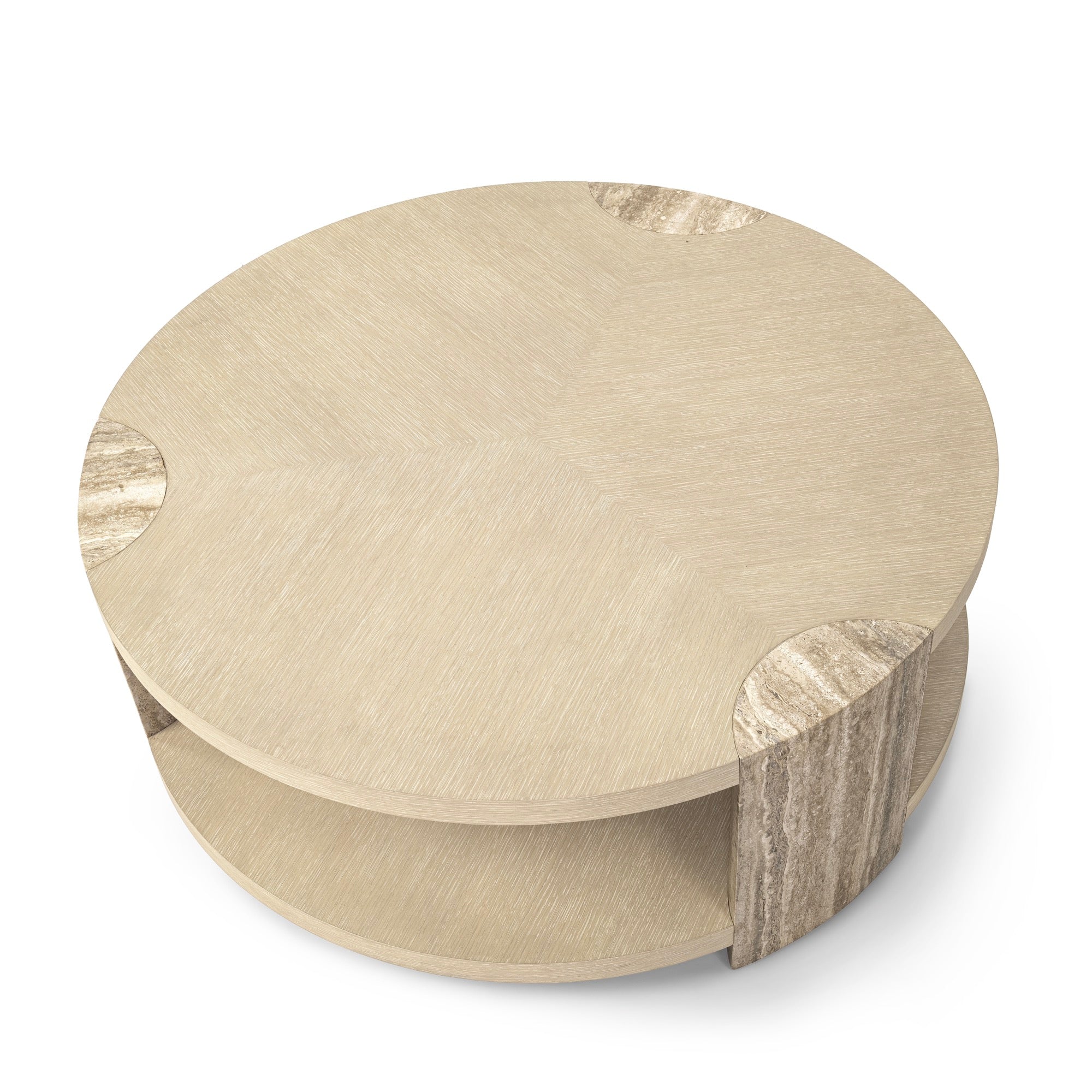 DescriptionTable features an oak veneer top and bottom shelf accented with solid natural travertine stone legs. Travertine has a beautiful porous surface and will vary in color, grain and texture, no two pieces will be alike. Coordinates with the Laszlo collection and larger version of this design (764279).