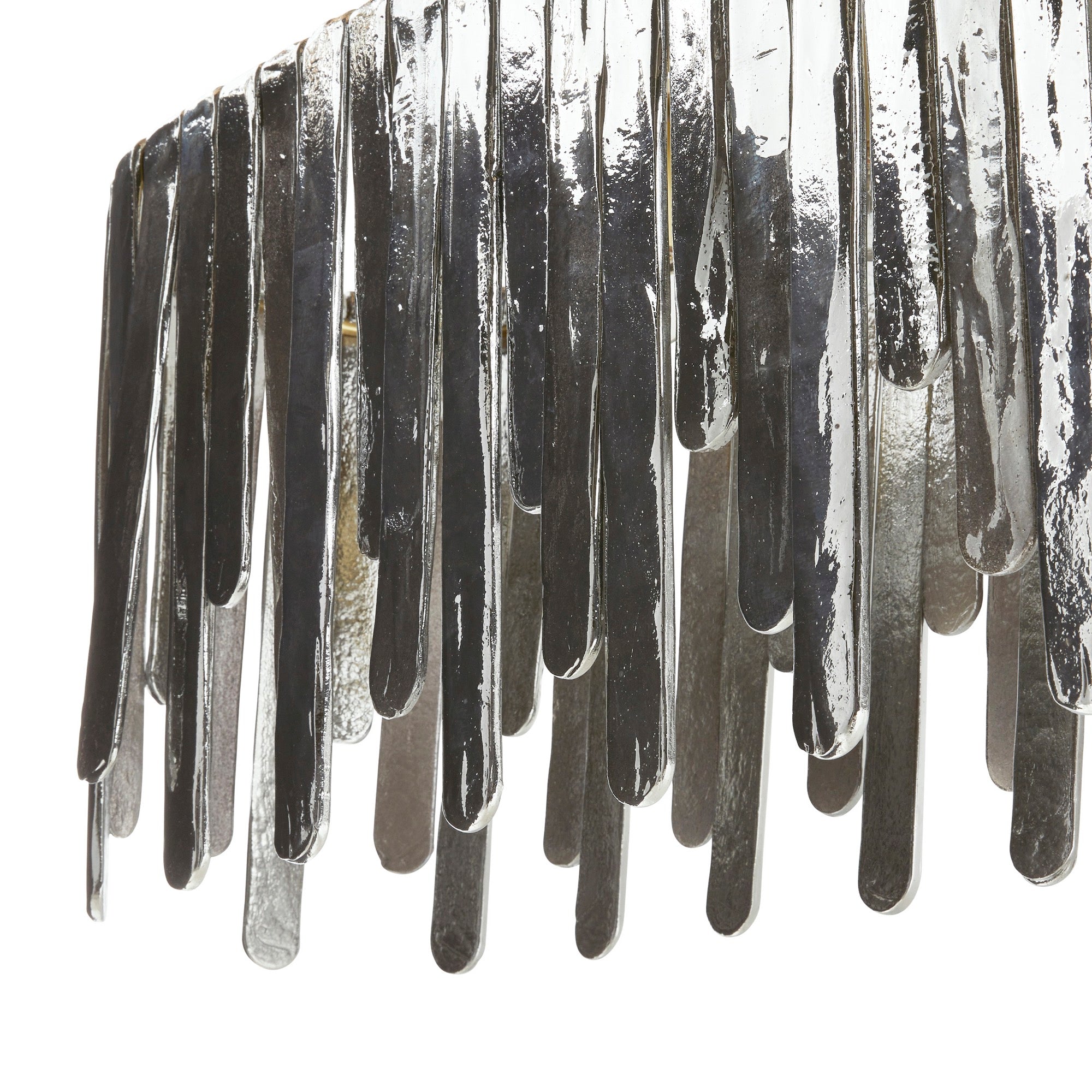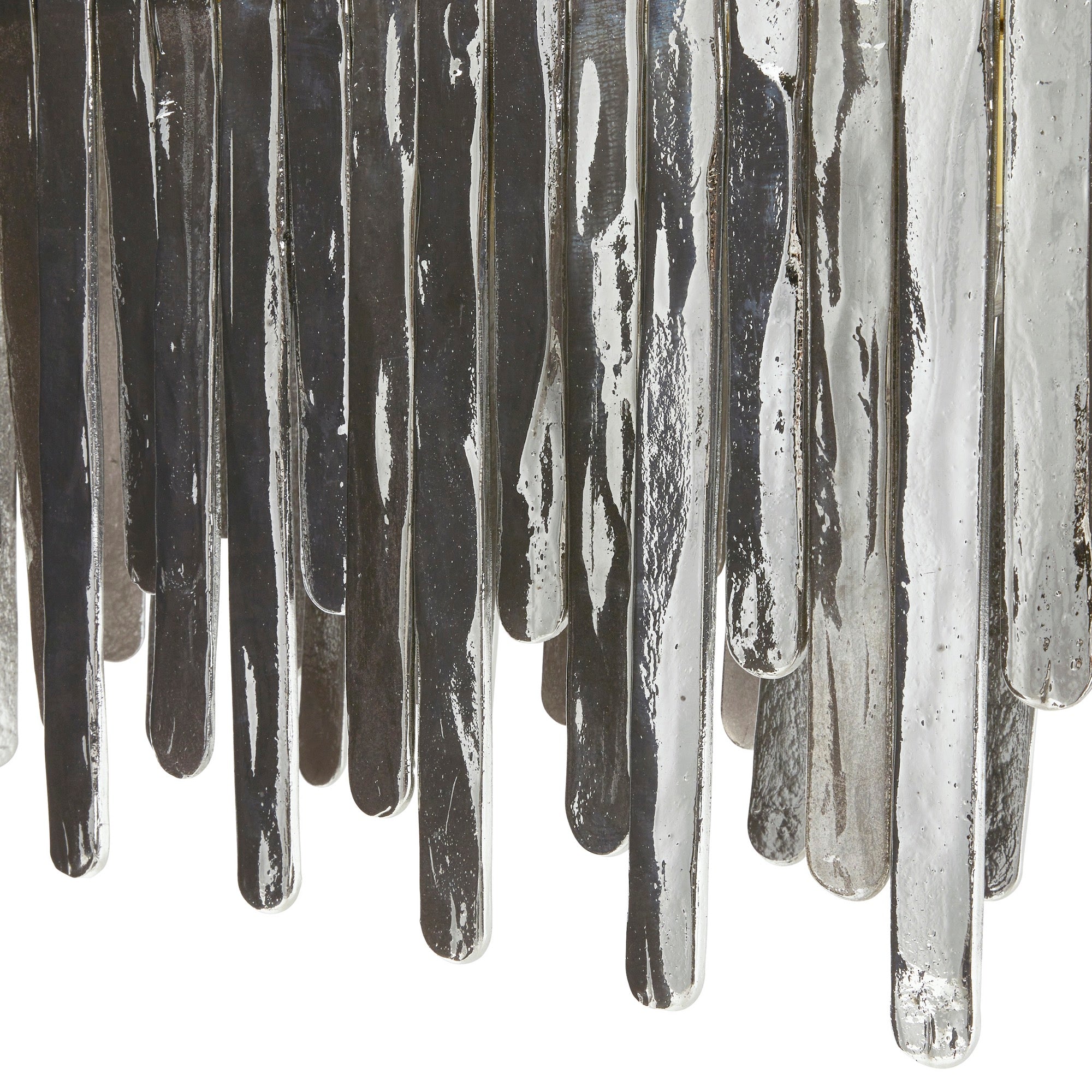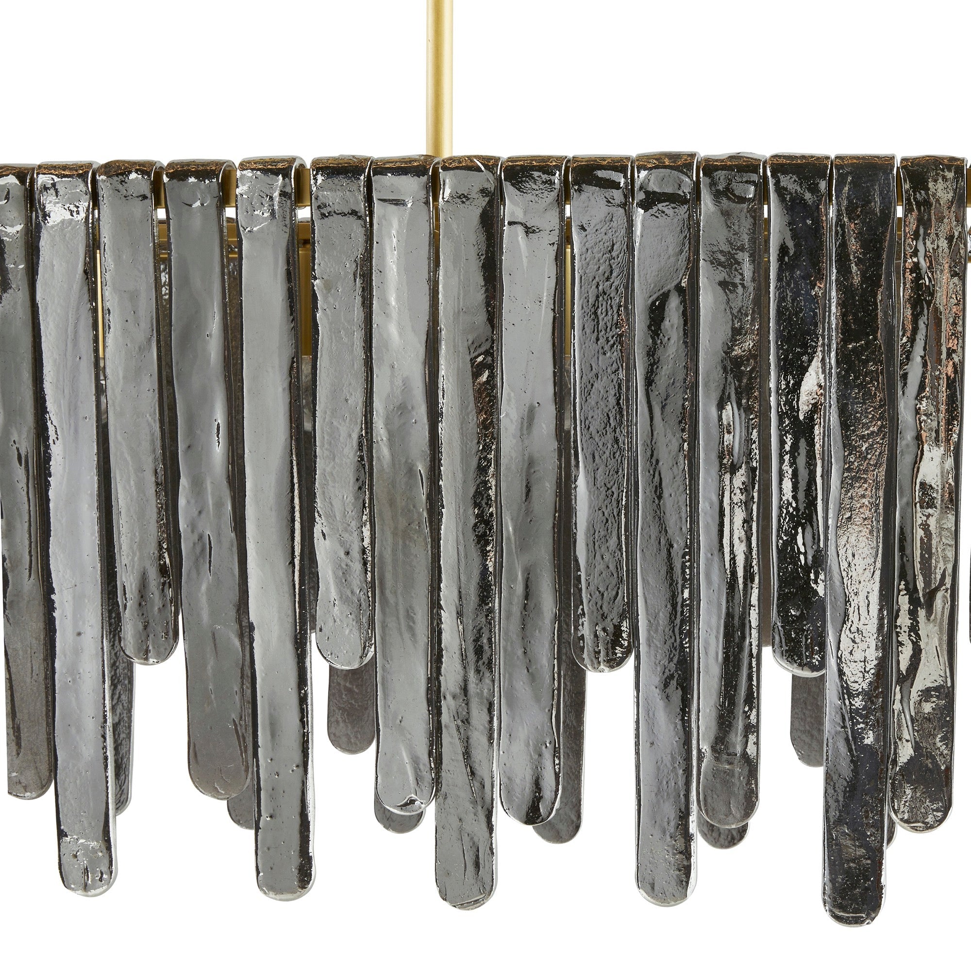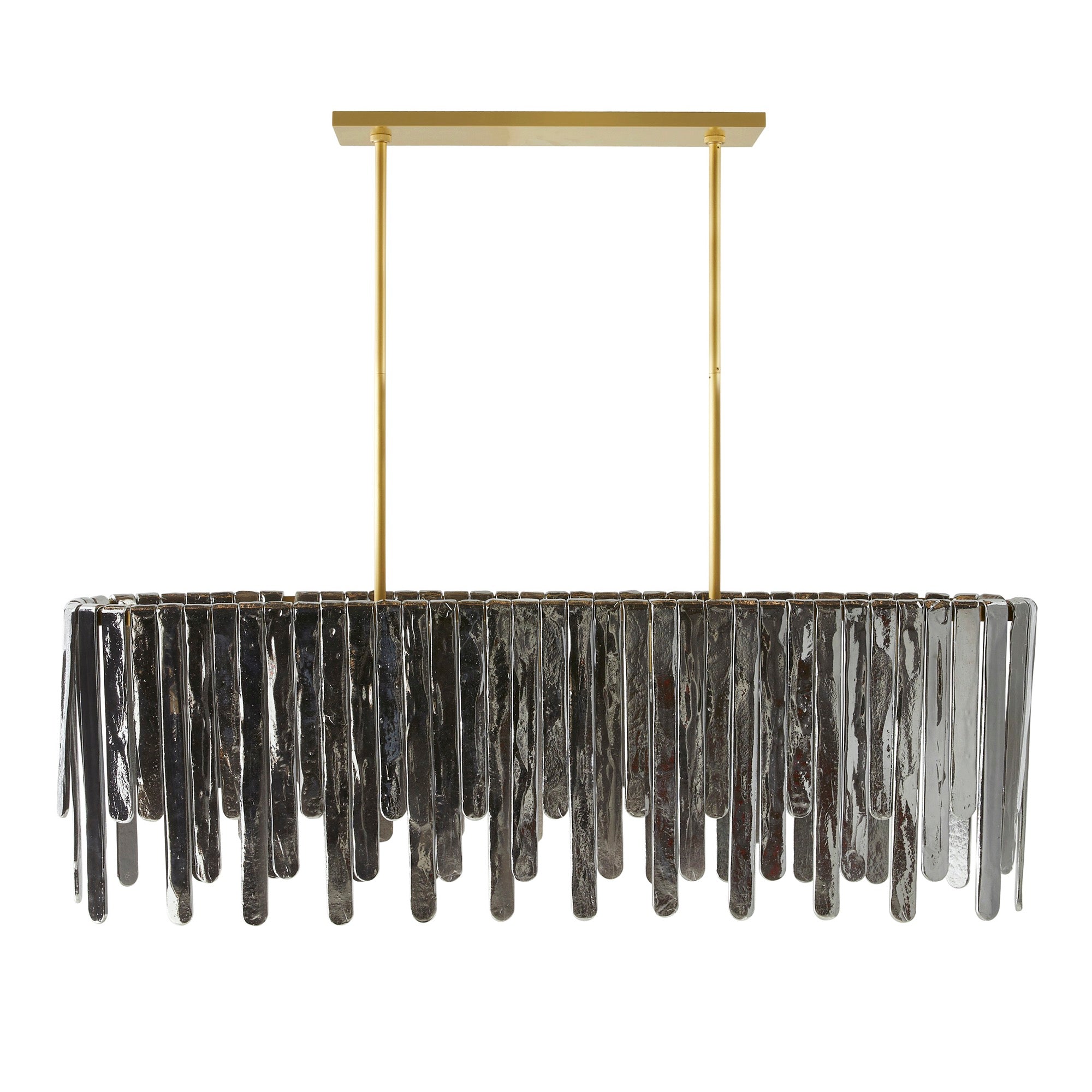 DescriptionInspired by the majestic beauty of Multnomah Falls, the Leighton provides a dramatic sense of movement through each unique cascading element. Panels of smoke luster slump glass suspend from an oblong antique brass-plated steel frame. Varying in size and alternating in height, each offers a lustrous glimmer to create its own unique lights cape. Additional pipe available. Finish will vary.